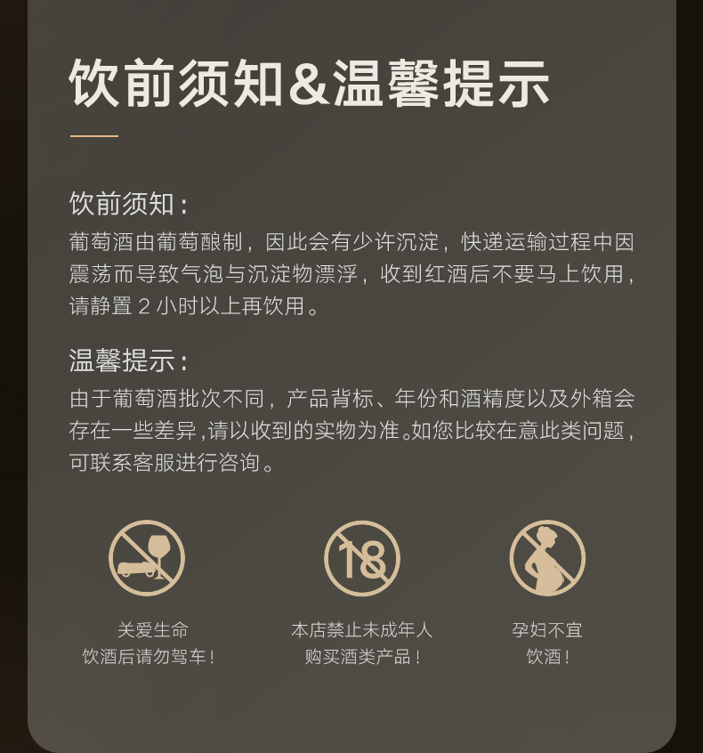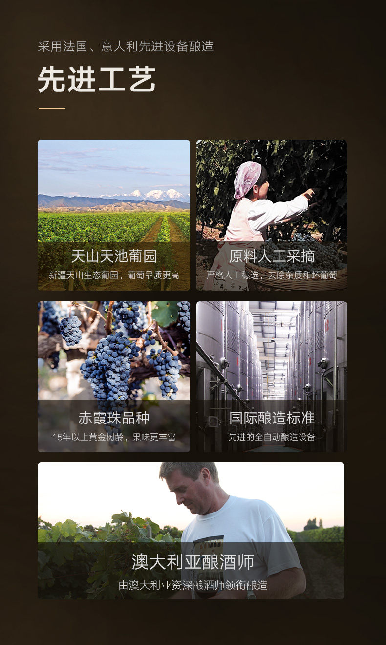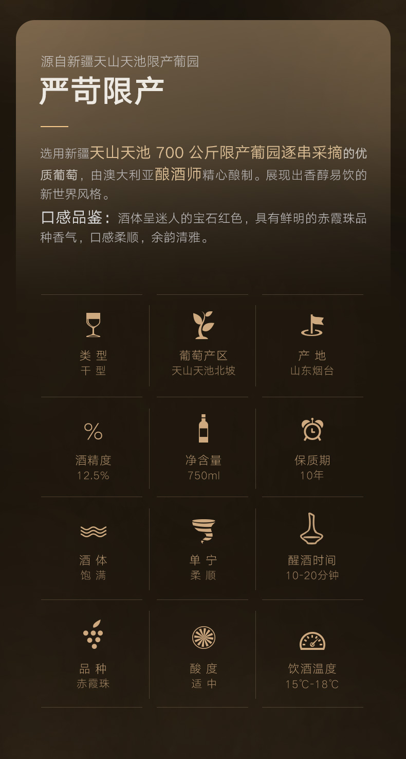 产品特点:选用天山天池葡园,700斤限产葡园优质酿酒葡萄。酒体呈迷人宝石红色,具有鲜明的赤霞珠品种香气,口感柔顺,余韵清雅,具有典型的新世界葡萄酒风格。