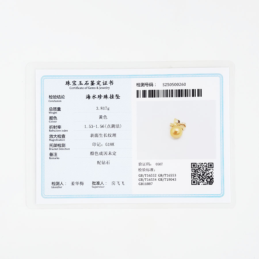 【天然正品】AU750黄金镶钻镶天然约11MM浓金色近无暇海水珍珠吊坠项链20.8*11.0*11.0MM(皆取最大值)女士现售价:3980!060525NJS31
