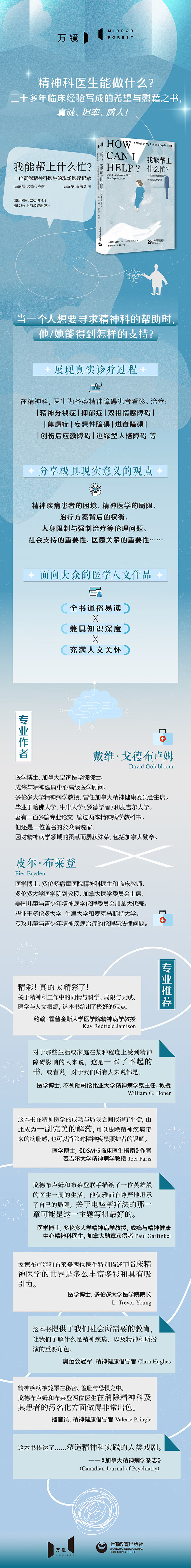 现代社会精神疾病的患病率居高不下,但多数患者却没有接受过治疗。这背后既有精神疾病污名化的问题,也有精神科医生常被误解、不受信任的问题。当一个人想要寻求精神科的帮助时,他/她能得到怎样的支持?精神科医生可以帮上什么忙?资深精神科医生戴维·戈德布卢姆和皮尔·布莱登在这本书中讲述了真实的精神科故事,试图回答这些问题,以及人们想要了解的更多问题。
