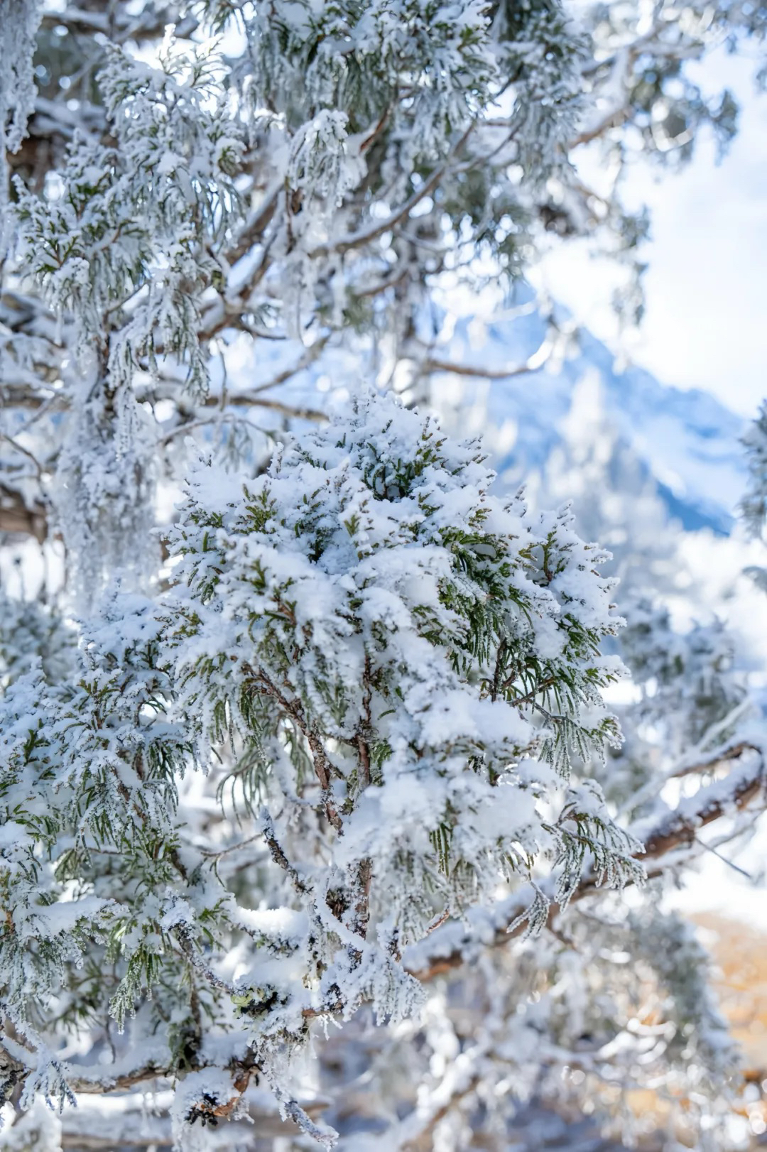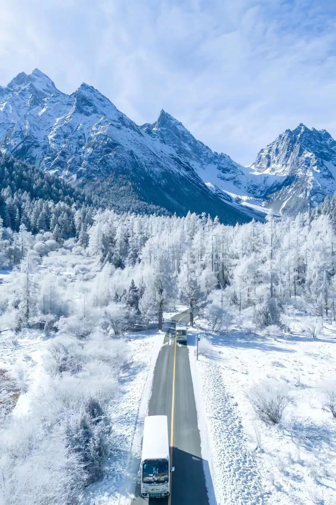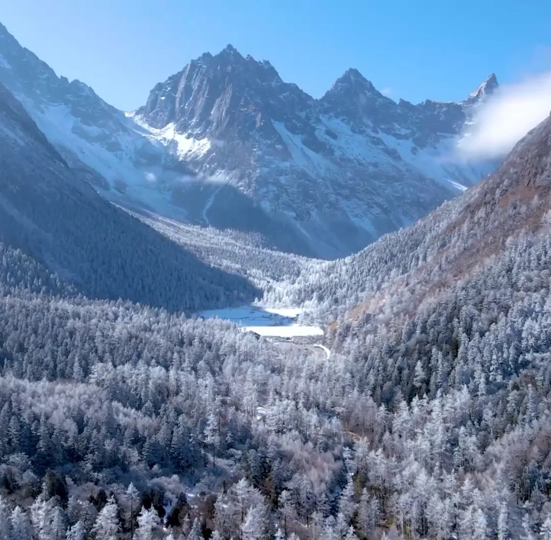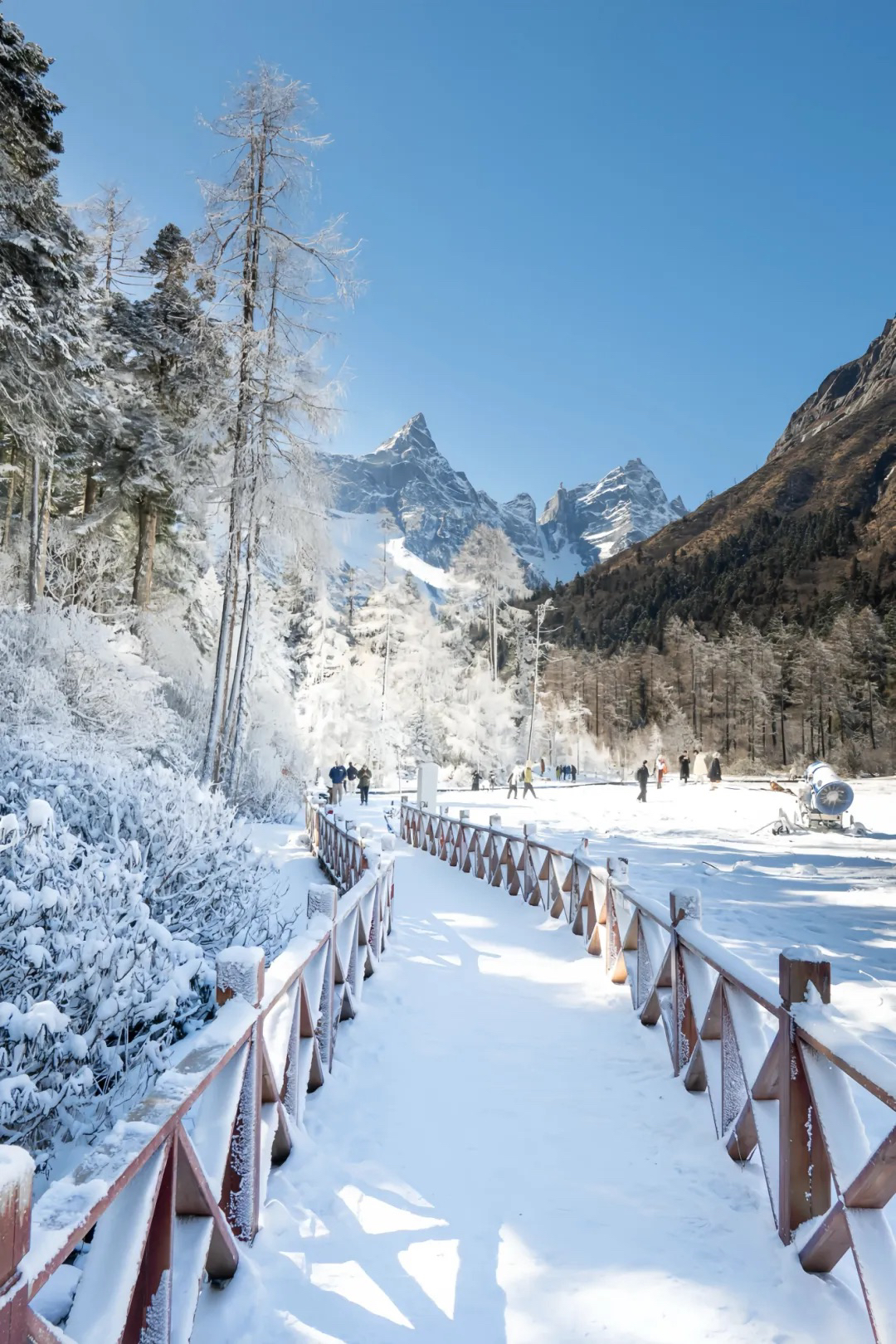 冬天的毕棚沟,是治愈一切的温柔乡。褪去了秋的斑斓,这里只剩最干净的白与蓝——蓝天澄澈如洗,雪山巍峨耸立,积雪覆盖了山路、草甸、河谷,把世界滤得纯粹又安宁。