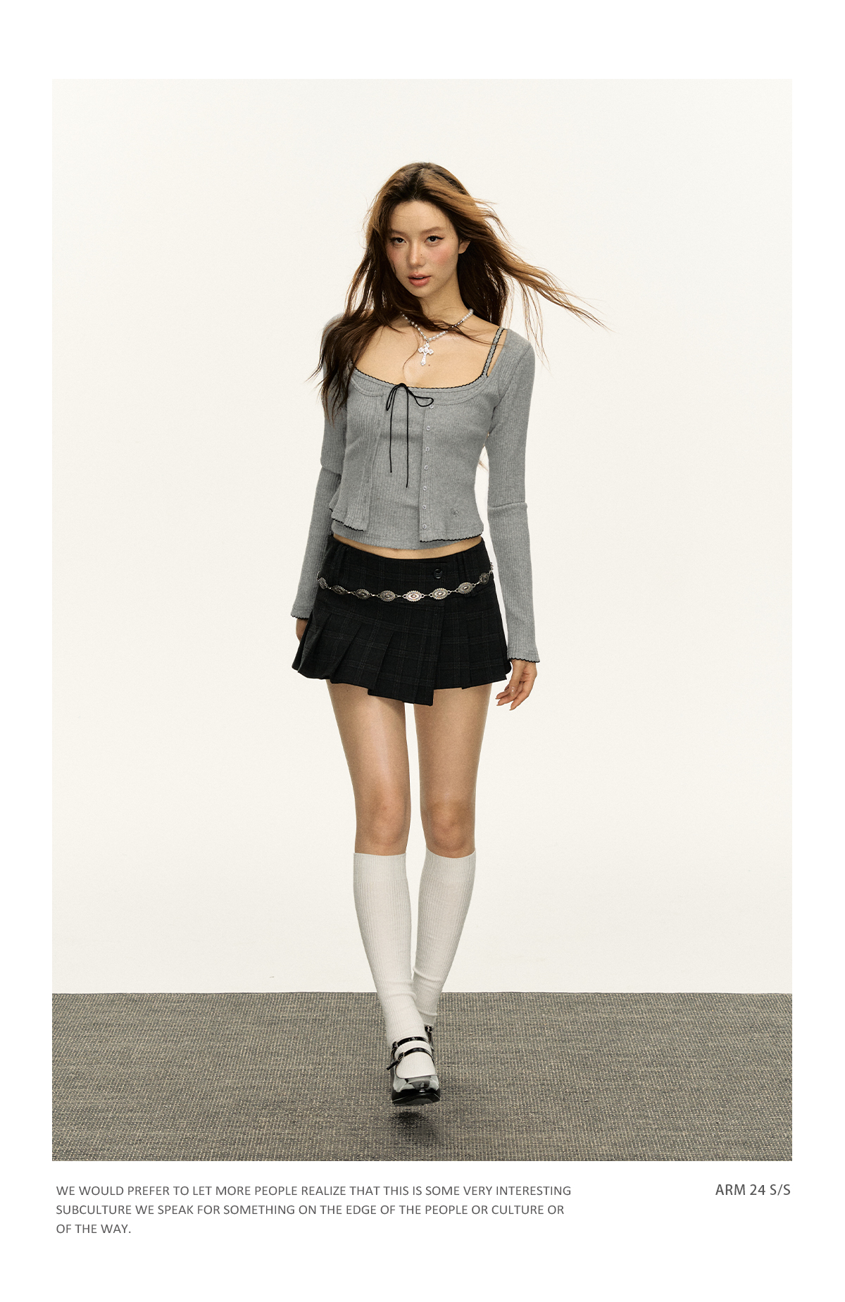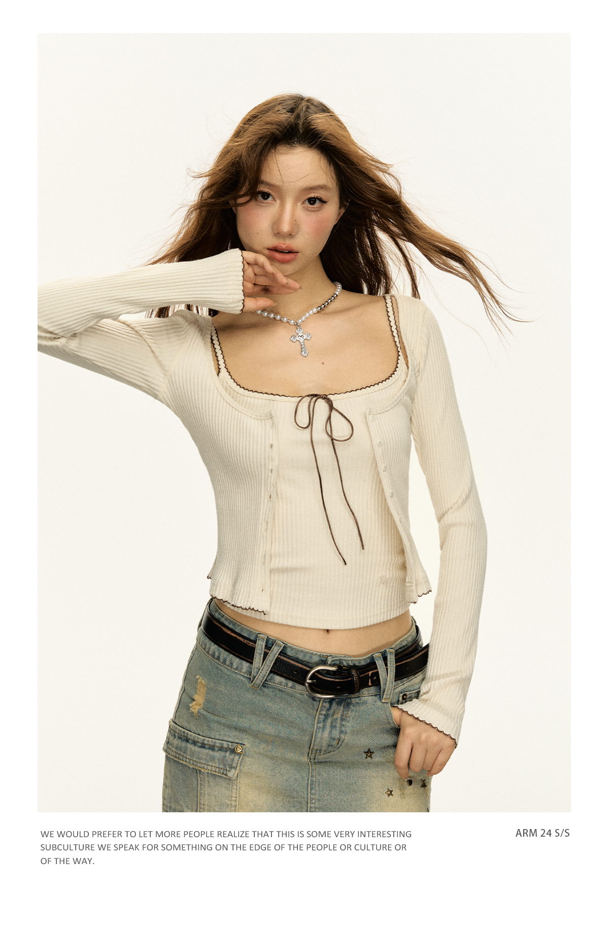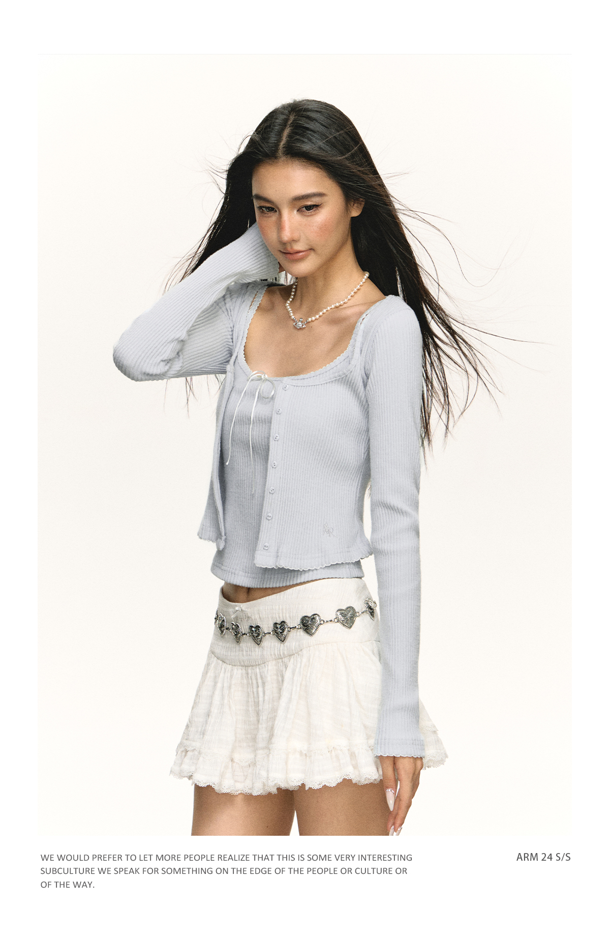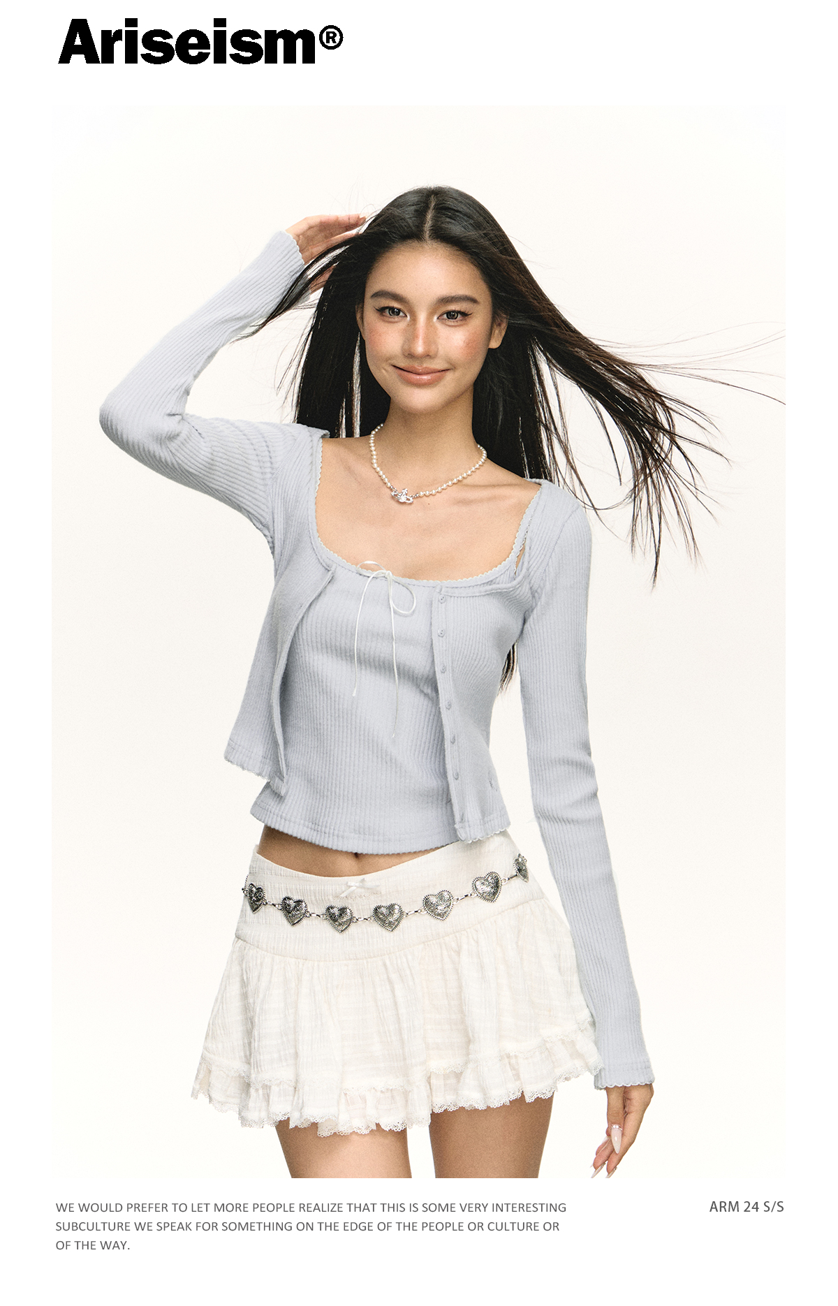 Ariseism 美式复古坑条吊带长袖针织开衫套装女春季新款两件套