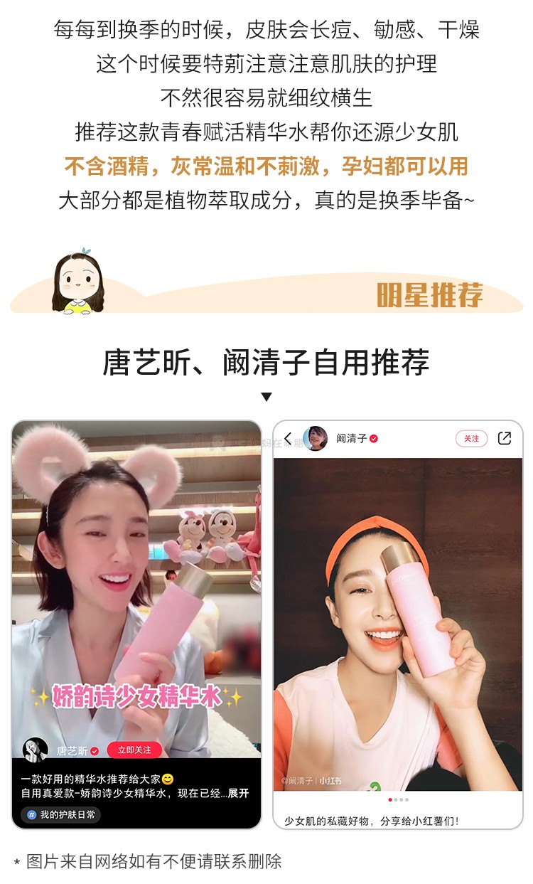 1.护肤品成分各有不同,敏感性肌肤的人士请先在耳后进行测试后再使用。