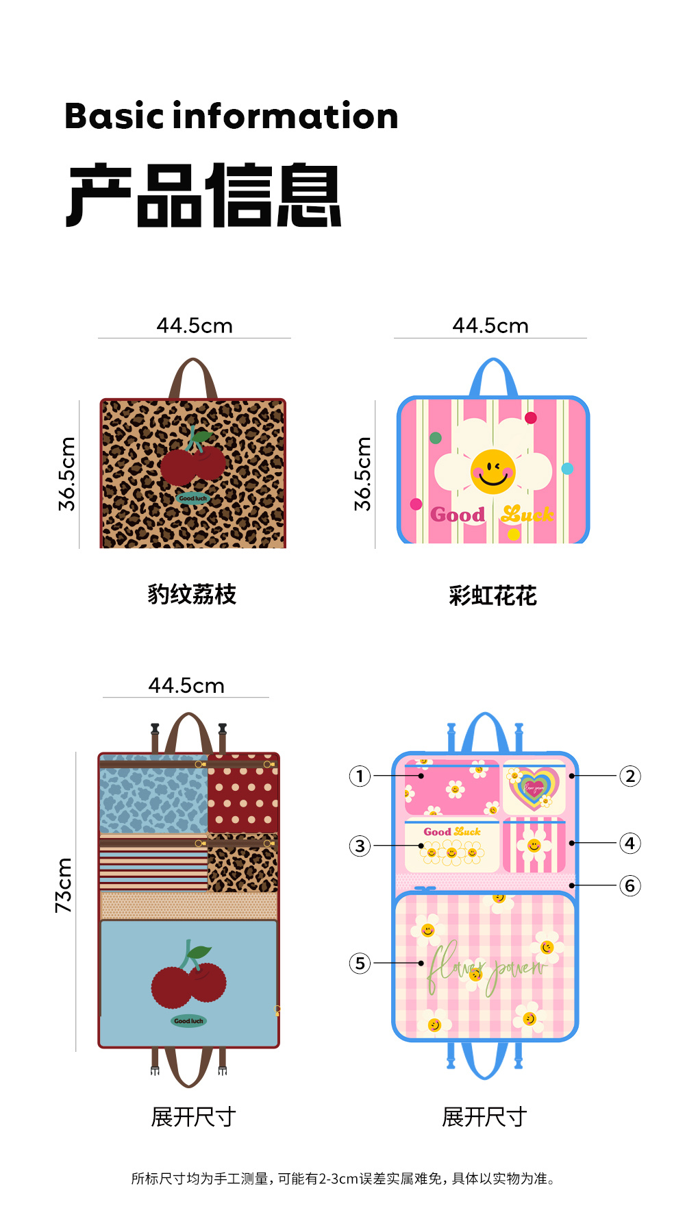 插画师原创的彩虹花花系列收纳包,直接把旅行氛围感拉满~粉白笑脸花、蓝底樱桃图案,连拉链头都是小太阳造型,拎在手里像提着一束会收纳的鲜花,机场安检时被3个小姐姐追着问链接🌸