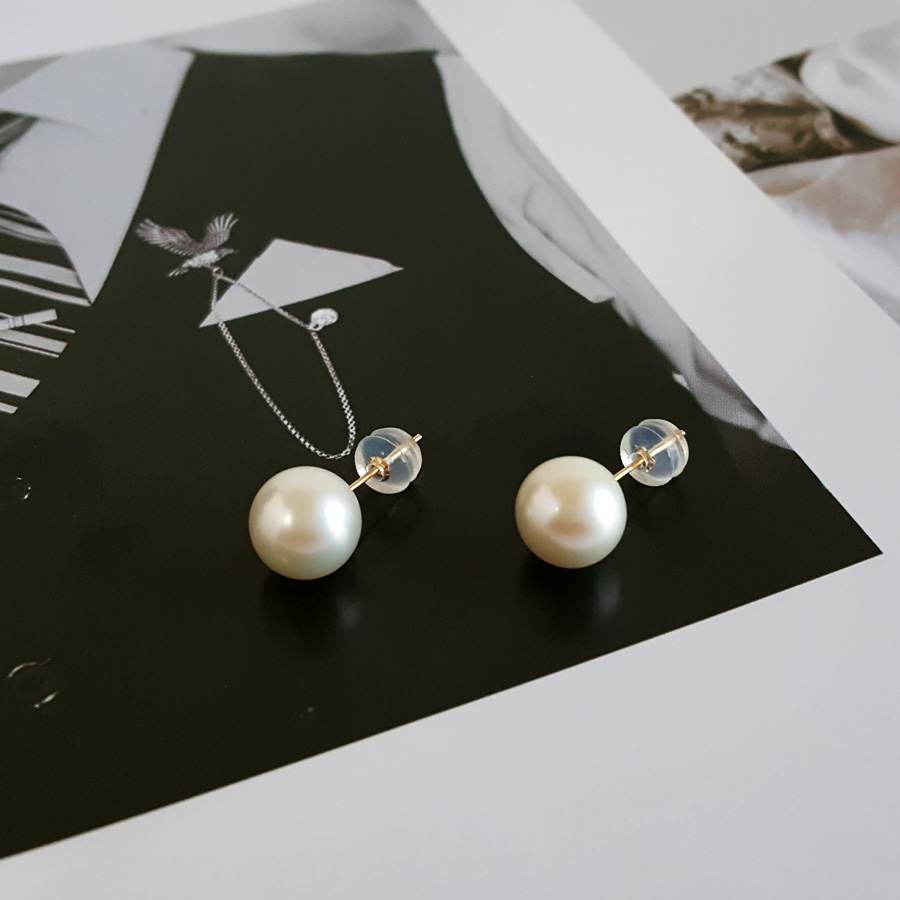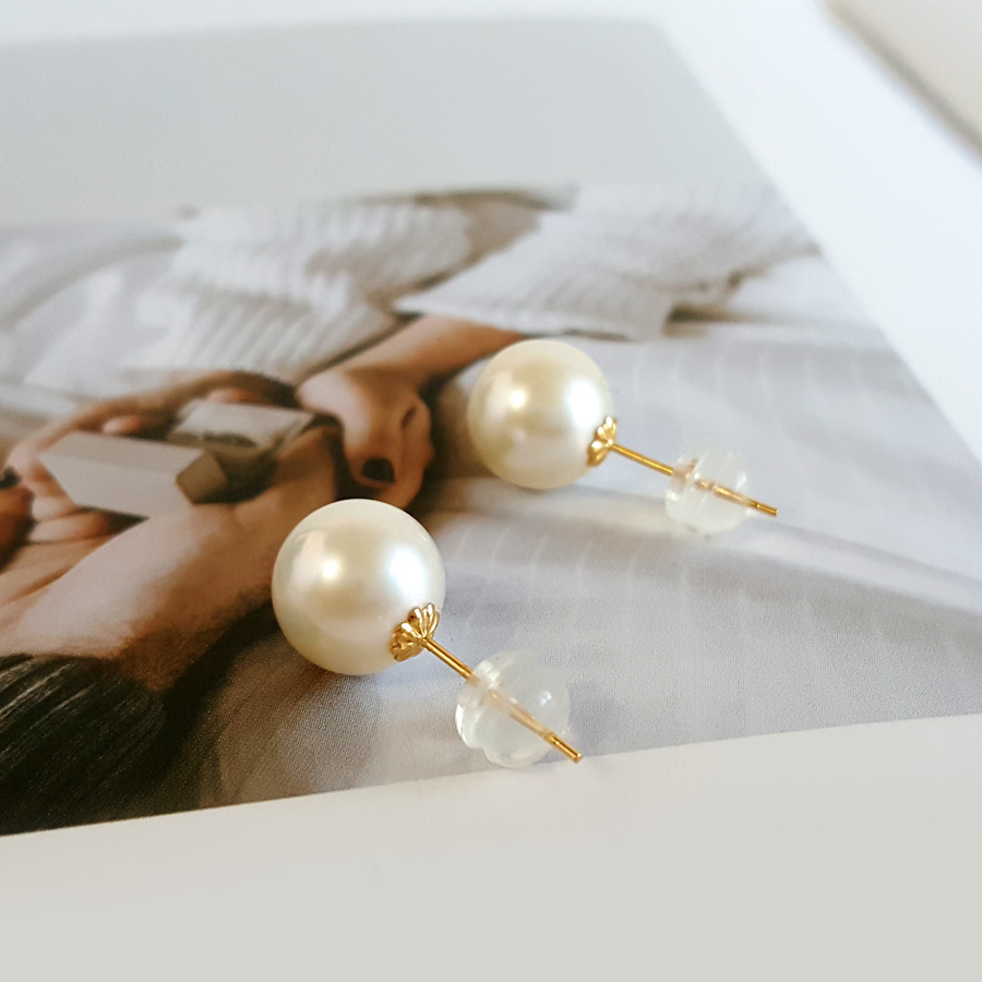 【天然正品】AU750黄金镶天然近完美约8.9MM白色珍珠耳钉8.9MM(皆取最大值)女士061125NJS24 特价:420元