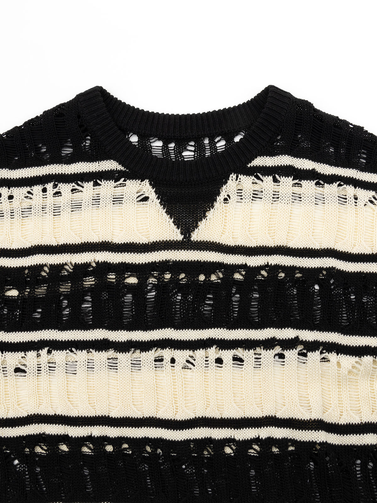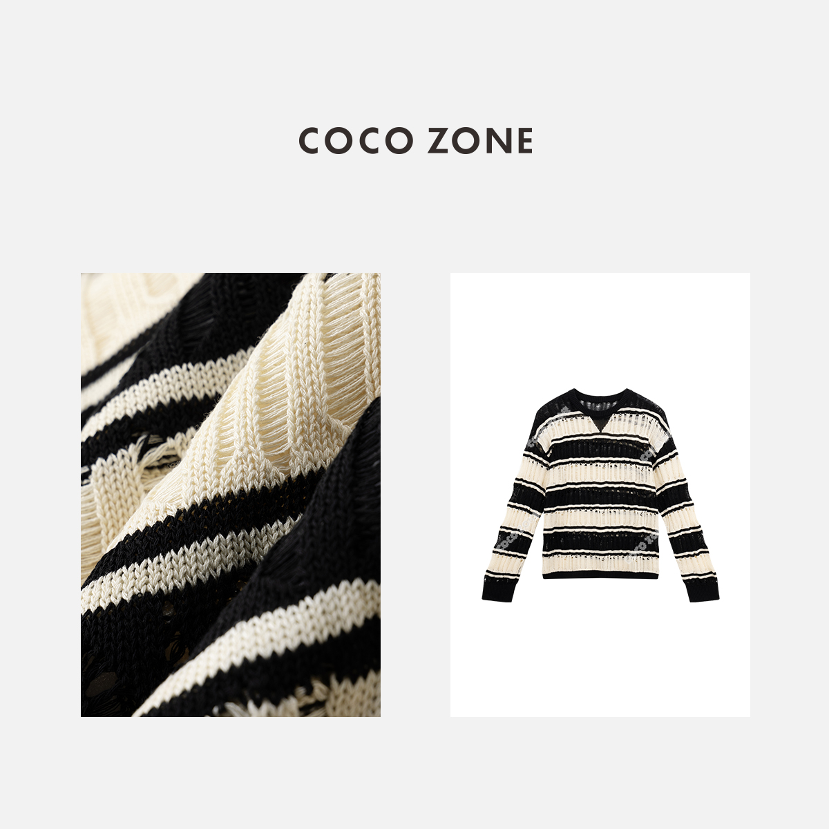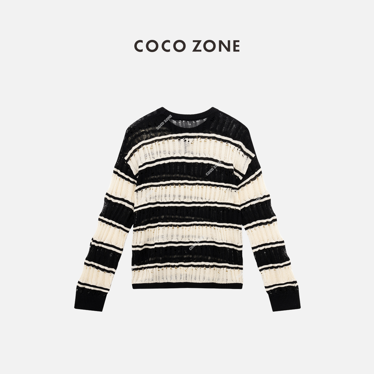 COCO ZONE“洛拉”夏季镂空圆领针织衫条纹宽松长袖上衣CC1B0854