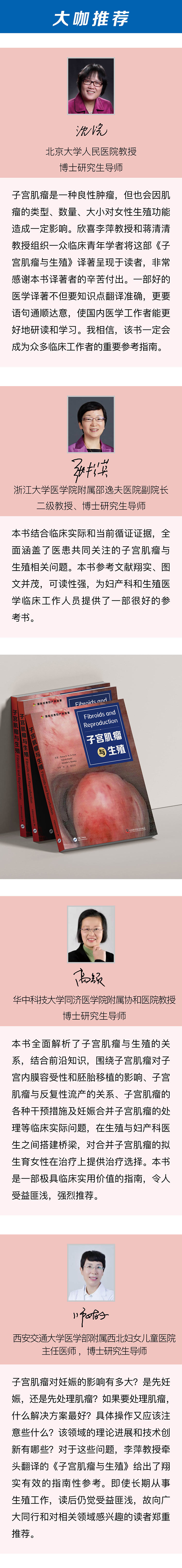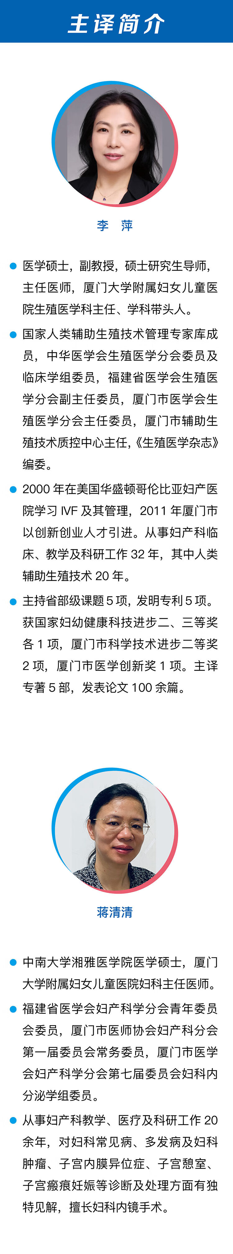 原著者:Botros R.M.B. Rizk,现任得克萨斯州休斯顿Elite IVF医学主任;得克萨斯州敖德萨市高级生育中心医学主任、敖德萨市生育实验室主任;中东生育学会会长;开罗大学医学院妇产科副教授、埃及开罗Kasr El Eini医院妇产科副教授;曾任美国阿拉巴马州莫比尔市南阿拉巴马大学生殖内分泌学和不孕不育学教授兼主任。Yakoub Khalaf,英国伦敦盖伊和圣托马斯医院和伦敦国王学院生殖医学和外科教授,盖伊和圣托马斯医院生育服务负责人和受孕概念和植入前遗传诊断中心主任。Mostafa A. Borahay,马里兰州巴尔的摩约约翰·霍普金斯Bayview医学中心妇产科副教授、微创妇科手术主任,对妇科微创手术有深入研究。主译:李萍,女,主任医师,厦门大学兼职副教授、硕导 。现任厦门市妇幼保健院生殖医学科主任,妇产科学硕士。2011年人才引进到厦门市妇幼保健院,带领生殖医学中心快速步入辅助生殖技术的发展轨道,试管鲜、冻胚移植周期临床妊娠率达60%以上。现系中华医学会生殖医学分会委员,福建省医学会生殖医学分会常委委员,厦门市医学会生殖医学分会主任委员,厦门市医学会妇产科分会委员。曾发表SCI论文20余篇、GJJ核心期刊论文40余篇,主持和参与科研课题13项,带领团队翻译两部论著《宫腔内人工授精》和《不孕症诊疗手册》,荣获国家妇幼健康科技进步二等奖1项、厦门市科技进步二等奖和厦门市医学创新奖各1项。蒋清清, 中南大学湘雅医学院医学硕士,厦门大医附属妇女儿童医院妇科主任医师,从事妇产科教学、医疗及科研工作 20 余年,擅长妇科常见病、多发病及妇科肿瘤、子宫内膜异位症、子宫憩室、子宫瘢痕妊娠等诊断及处理,擅长妇科内镜手术。