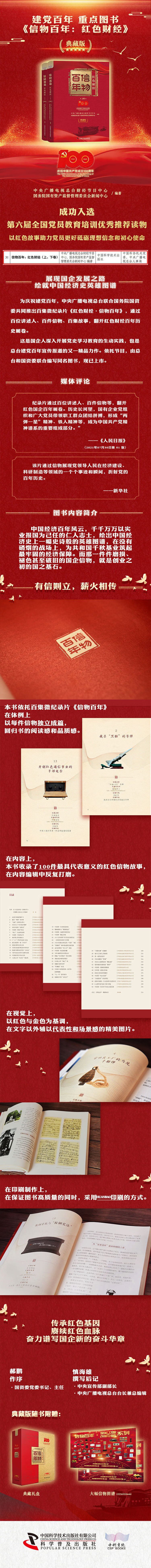 为庆祝成立100周年,本节目内容已精心汇编成册:《信物百年:红色财经》由中国科学技术出版社同步出版上市,全国各大新华书店、网上书店有售。 中国经济百年风云,千千万万以实业报国为己任的仁人志士,绘出中国经济史上一幅史诗般的英雄图谱,在没有硝烟的战场上,为共和国千秋基业筑起Z牢固的经济保障。而那一件件磨损、褪色甚至破旧的国企信物,就是创业之初的国之基石。一件件珍贵的百年信物见证了经历千锤百炼而不朽、跨越沧海桑田而繁荣的强国之路。