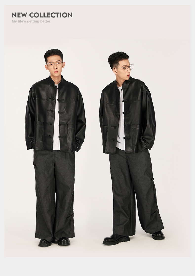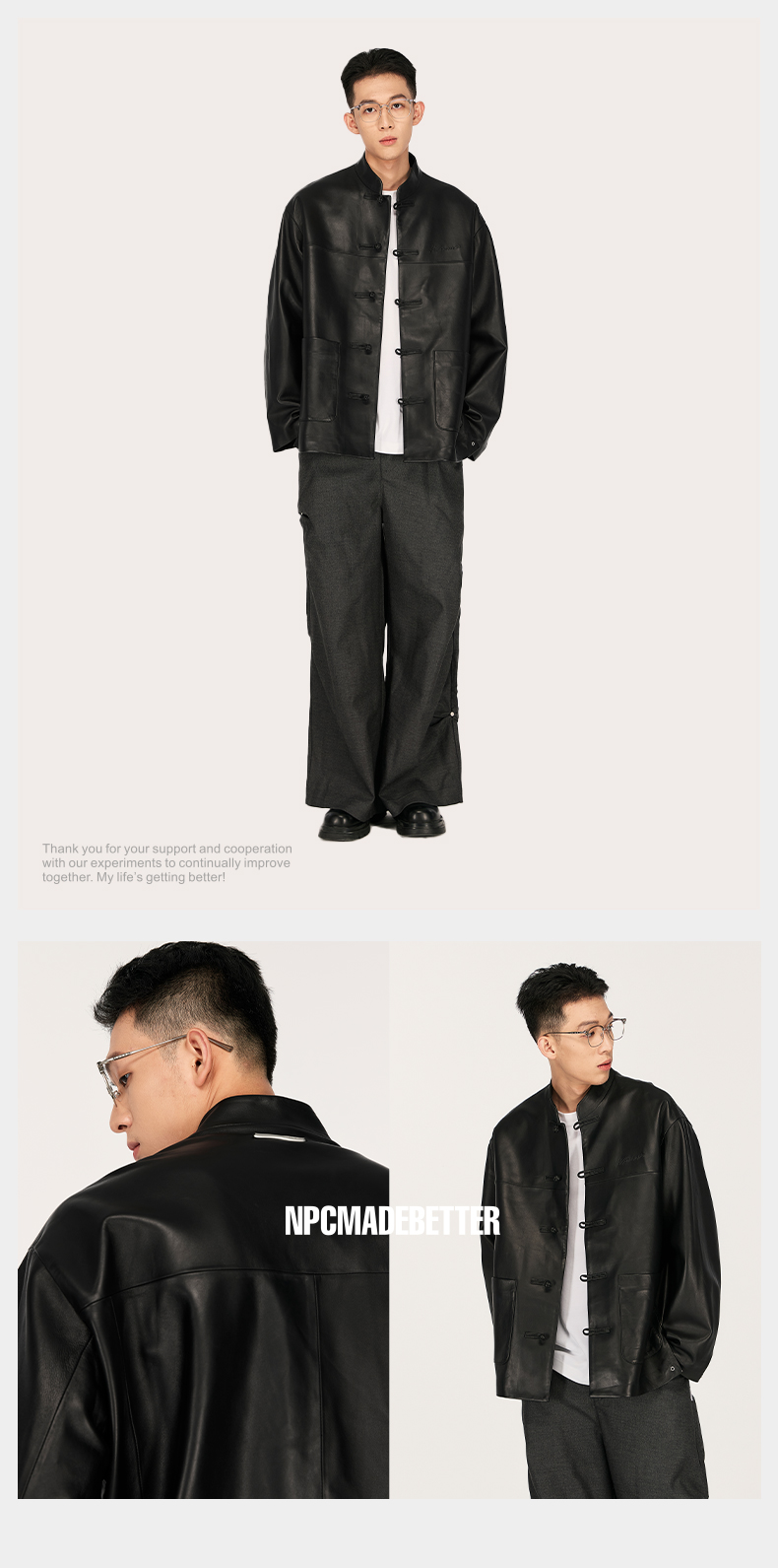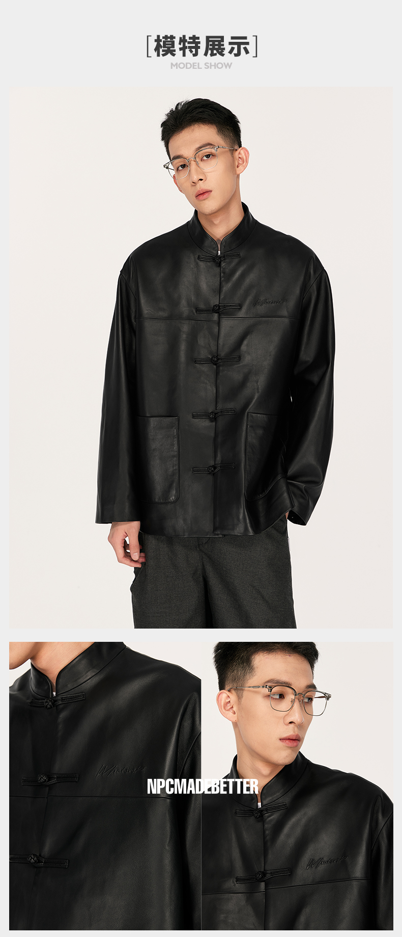 NPC潮牌国风新中式羊皮革立领盘扣皮衣夹克老钱风外套NP48TJ08