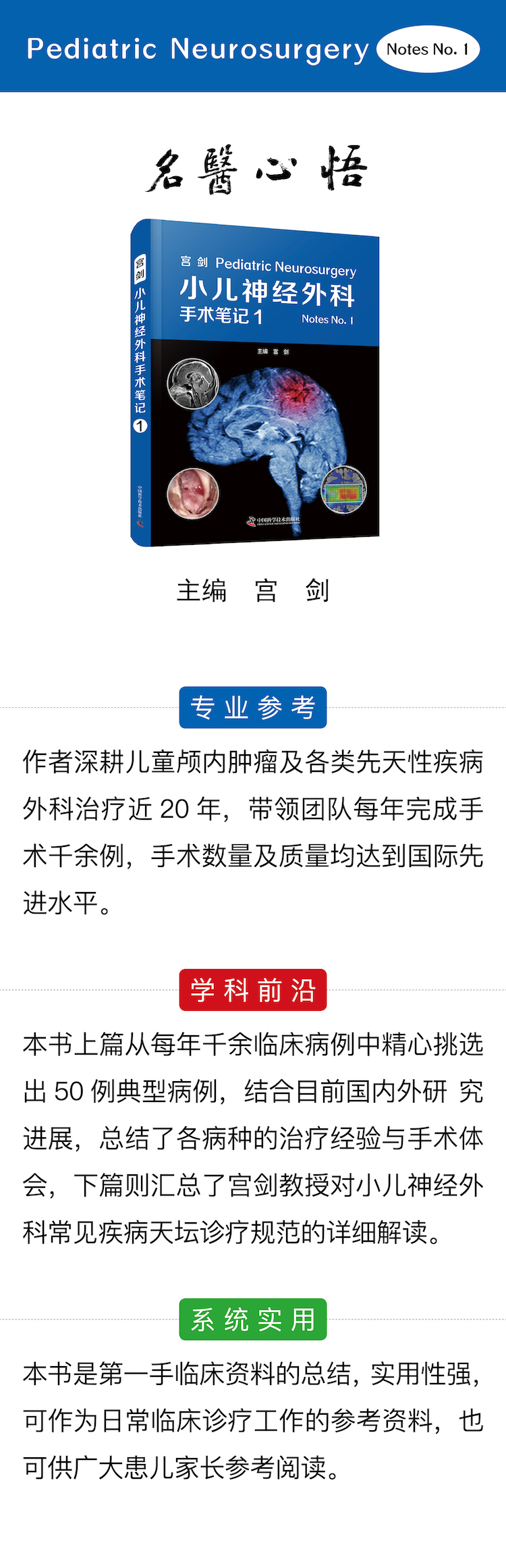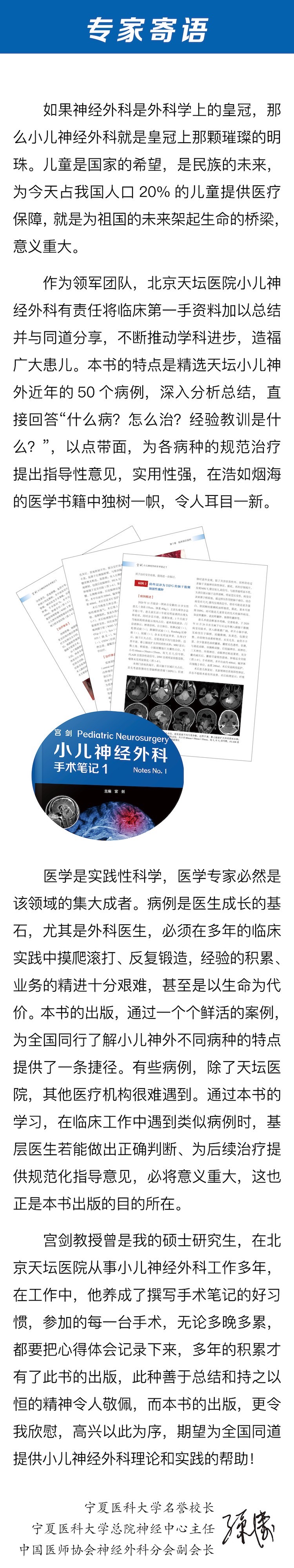 前?6?9 言 2020 年是不平凡的一年。突发的疫情,使原本紧张忙碌的工作生活舒缓下来,在积极抗疫的同时,我有了时间对以往的病例进行梳理和总结。在导师王忠诚院士的教诲下,在多年的临床工作,养成了撰写手术笔记的习惯。他老人家的谆谆教导言犹在耳——“当好医生,治好病人”。因此,我参加的每一台手术,无论多晚多累,都会把心得体会记录下来,持之以恒,收获颇丰。北京天坛医院小儿神经外科是新中国成立Z早、规模Z大的儿童颅脑外科诊疗中心,是名副其实的国家队,每年完成手术 1000 余例,死亡率低于 1/1000,疗效达到世界先进水平。 疫情期间,正好有时间对这些手术病例进行回顾与总结,精心挑选出感触Z深的误诊误判病例、罕见病例、复杂疑难病例、非常规治疗病例,每周一例,认真总结,通过科室公众号进行发布,坚持至今。即便目前已完全复工复产,仍然挤出时间精心编写,每周日准时发布。一年时间,完成了 50 例病例总结,与一年来接受神外新媒体的专访结集成册,一并出版。这 50 个病例是从千余病例中精心挑选出来的,虽比不上曹雪芹写《红楼梦》的“字字看来皆是血,十年辛苦不寻常”,但每一个病例亦均是笔者的心血结晶。出版之后,若小儿神经外科同道从中得到一点启发,能够挽救更多稚嫩的生命;广大家长得到一点启发,重燃希望之火,使患儿少走弯路、得到及时救治,笔者都会倍感欣慰,这也是本书出版的意义所在。 这种第一手的临床资料总结,在小儿神经外科领域尚属首次。北京天坛医院作为享誉世界的儿童颅脑外科诊疗中心,我们认为的常见病可能在许多地区是罕见病。因此,我们有责任持续总结并与同道共享,从而造福广大患儿。据此,我们拟订了 10 年出版计划,每周推 1 例,每年 50 例结集成册,连推 10 年、连出 10 本,以供同道借鉴,这既是对我们的鞭策与激励,也是天坛小儿神外应有的使命与担当。 感谢团队每一位成员对本书的贡献,感谢名医主刀栏目、中国科学技术出版社对本书出版的大力支持,感谢尊敬的导师孙涛教授为此书作序。让我们为发展中国小儿神经外科事业而共同努力! 北京天坛医院小儿神经外科主任、中国医师协会神经外科分会小儿专业委员会副主任委员 宫剑
