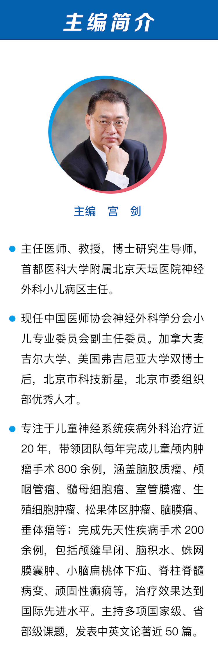 宫剑 主任医师,教授,博士研究生导师,首都医科大学附属北京天坛医院神经外科小儿病区主任。现任中国医师协会神经外科学分会小儿专业委员会副主任委员。加拿大麦吉尔大学、美国弗吉尼亚大学双博士后,北京市科技新星,北京市委组织部优秀人才。专注于儿童神经系统疾病外科治疗近 20 年,带领团队每年完成儿童颅内肿瘤手术 800 余例,涵盖脑胶质瘤、颅咽管瘤、髓母细胞瘤、室管膜瘤、生殖细胞肿瘤、松果体区肿瘤、脑膜瘤、垂体瘤等;完成先天性疾病手术 200 余例,包括颅缝早闭、脑积水、蛛网膜囊肿、小脑扁桃体下疝、脊柱脊髓病变、顽固性癫痫等,治疗效果达到国际先进水平。主持多项、省部级课题,发表中英文论著近 50 篇。