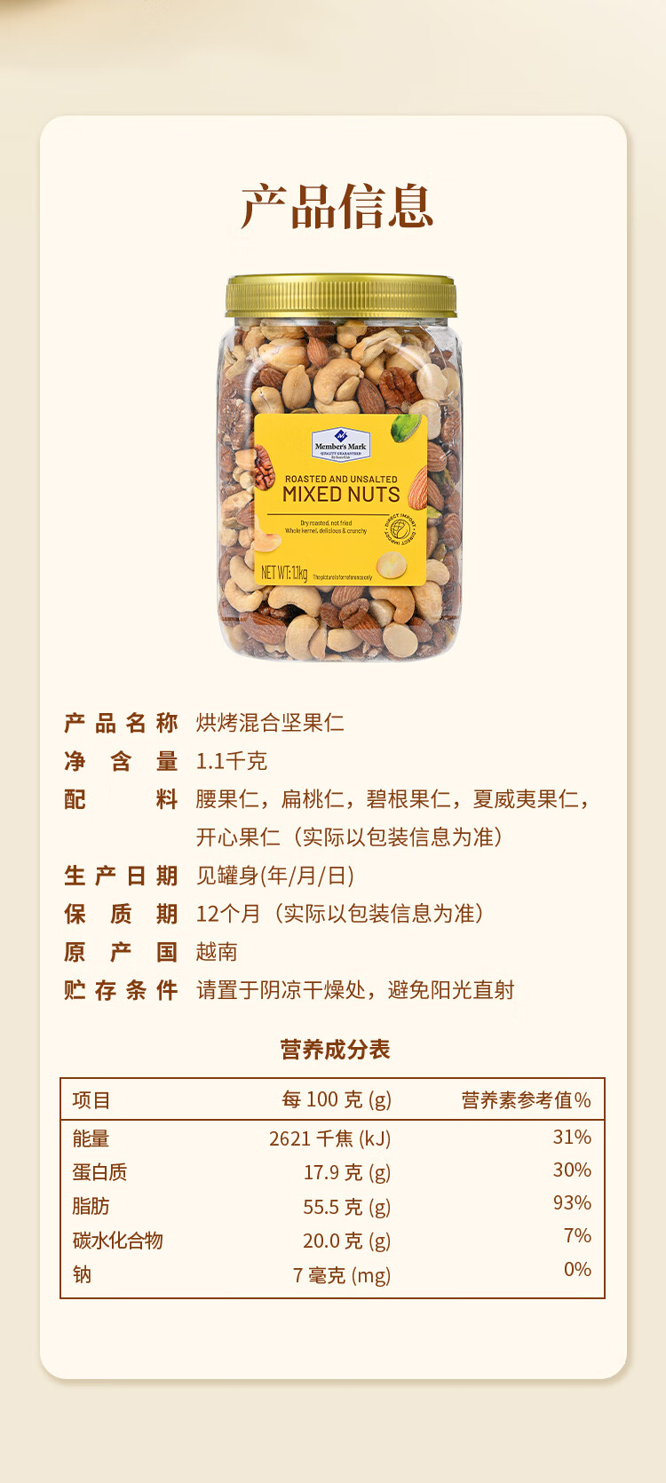 Member's Mark 烘烤混合坚果仁 1.1kg【7天内发货】【7天内发货】【7天内发货】