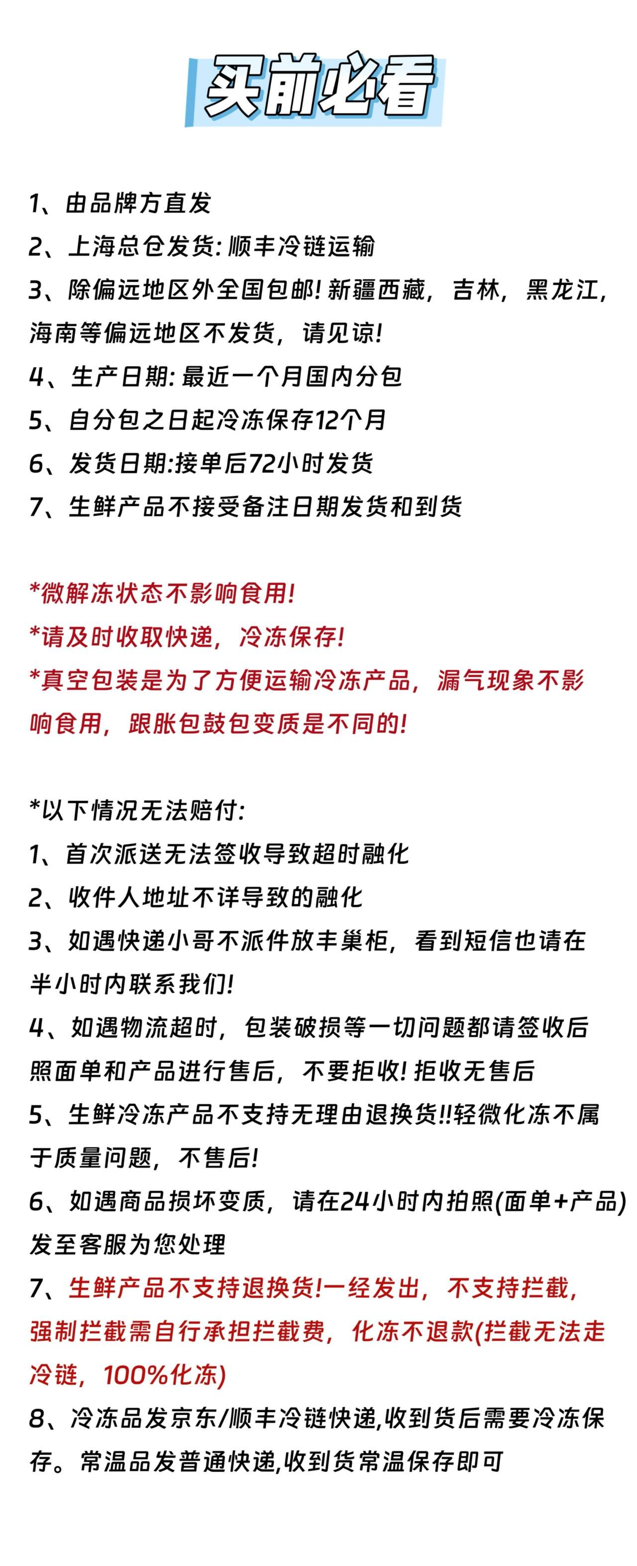2、微解冻状态不影响食用!请及时收取快递,冷冻保存!