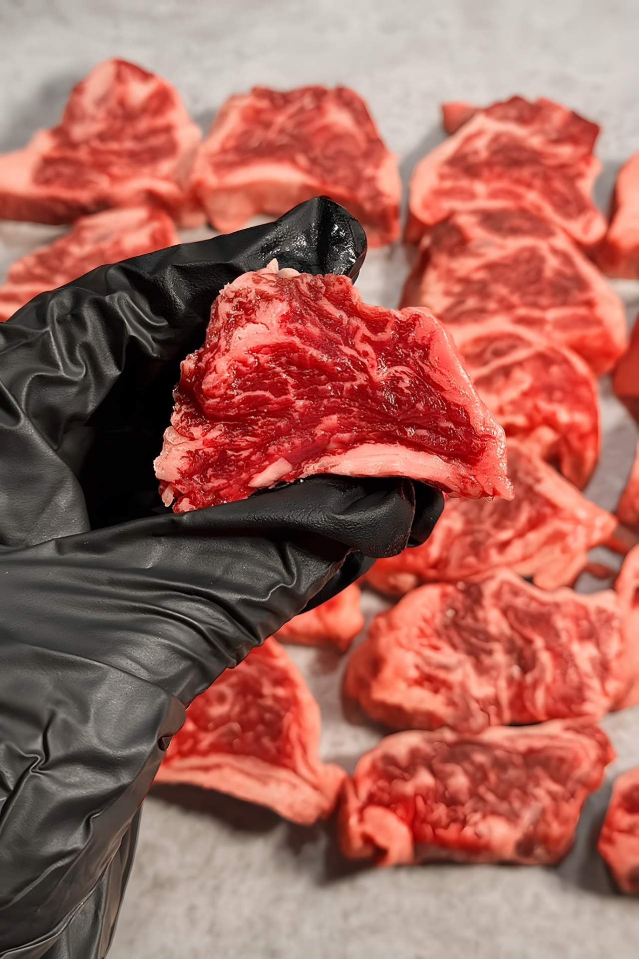同一块肉切下来的,因为侧唇形状不规整,没办法做牛排,产量又太少,无法量产出售,这才成为了老饕私藏