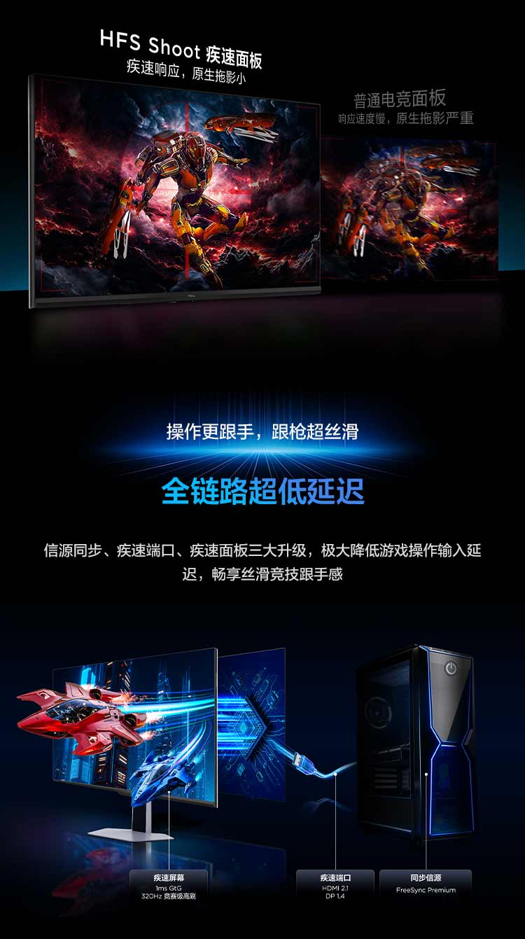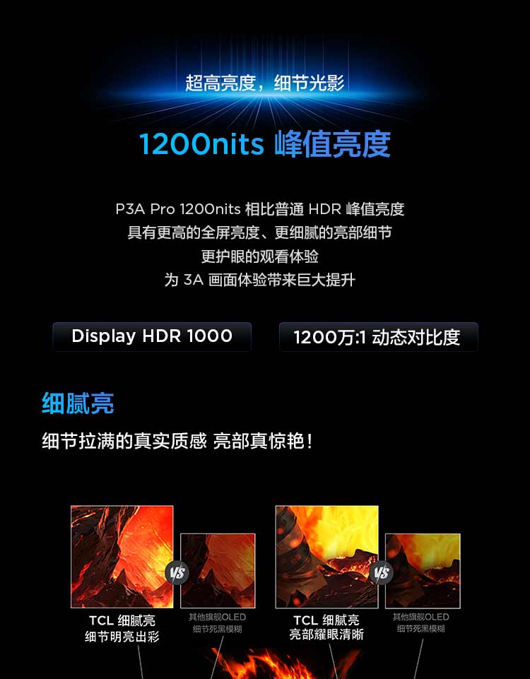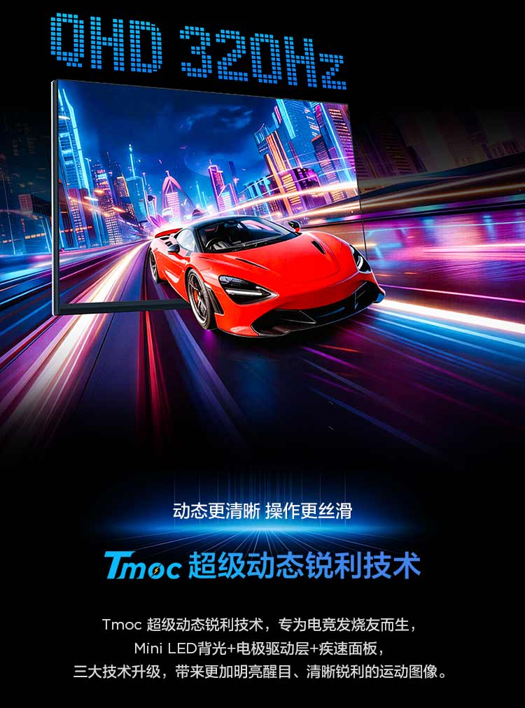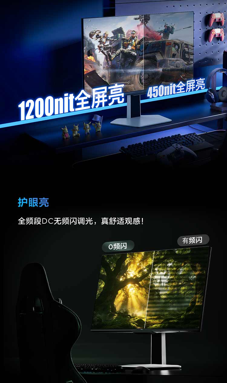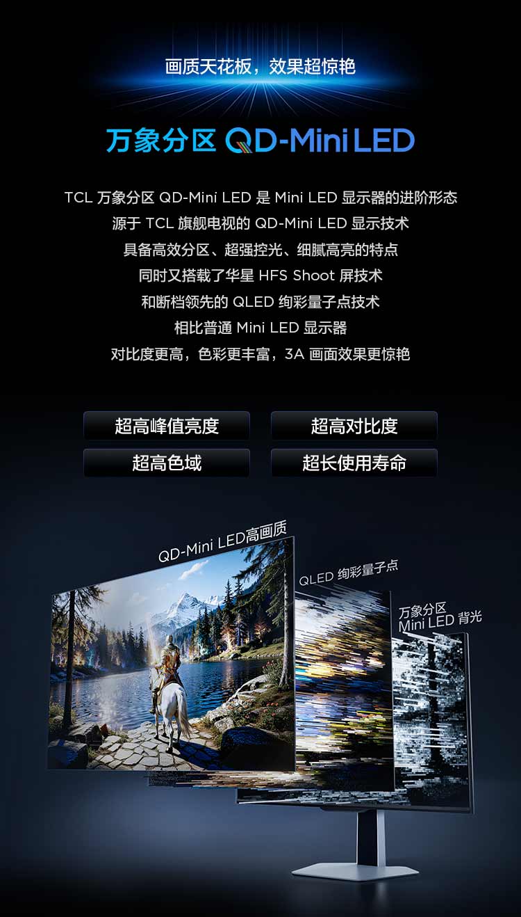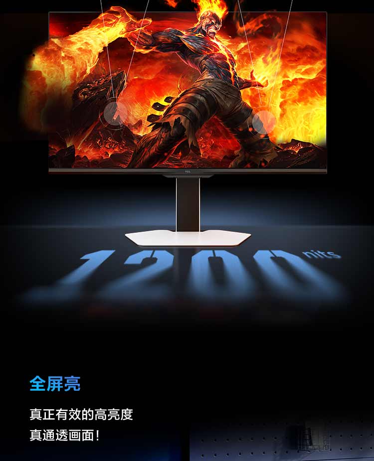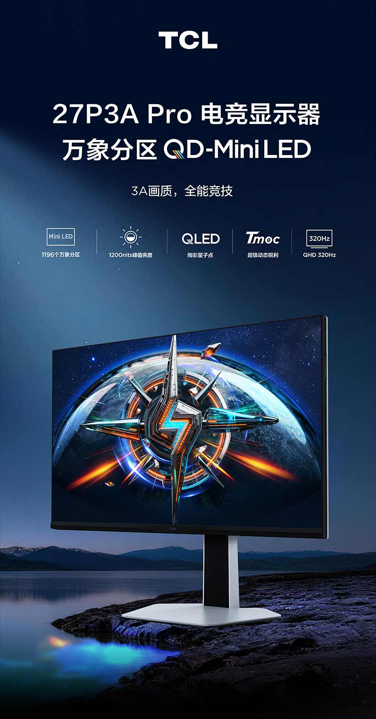 TCL 27英寸 P3A Pro QHD 320Hz QD-Mini LED 1196万象分区 HDR 1200nits 电竞显示器27P3A Pro