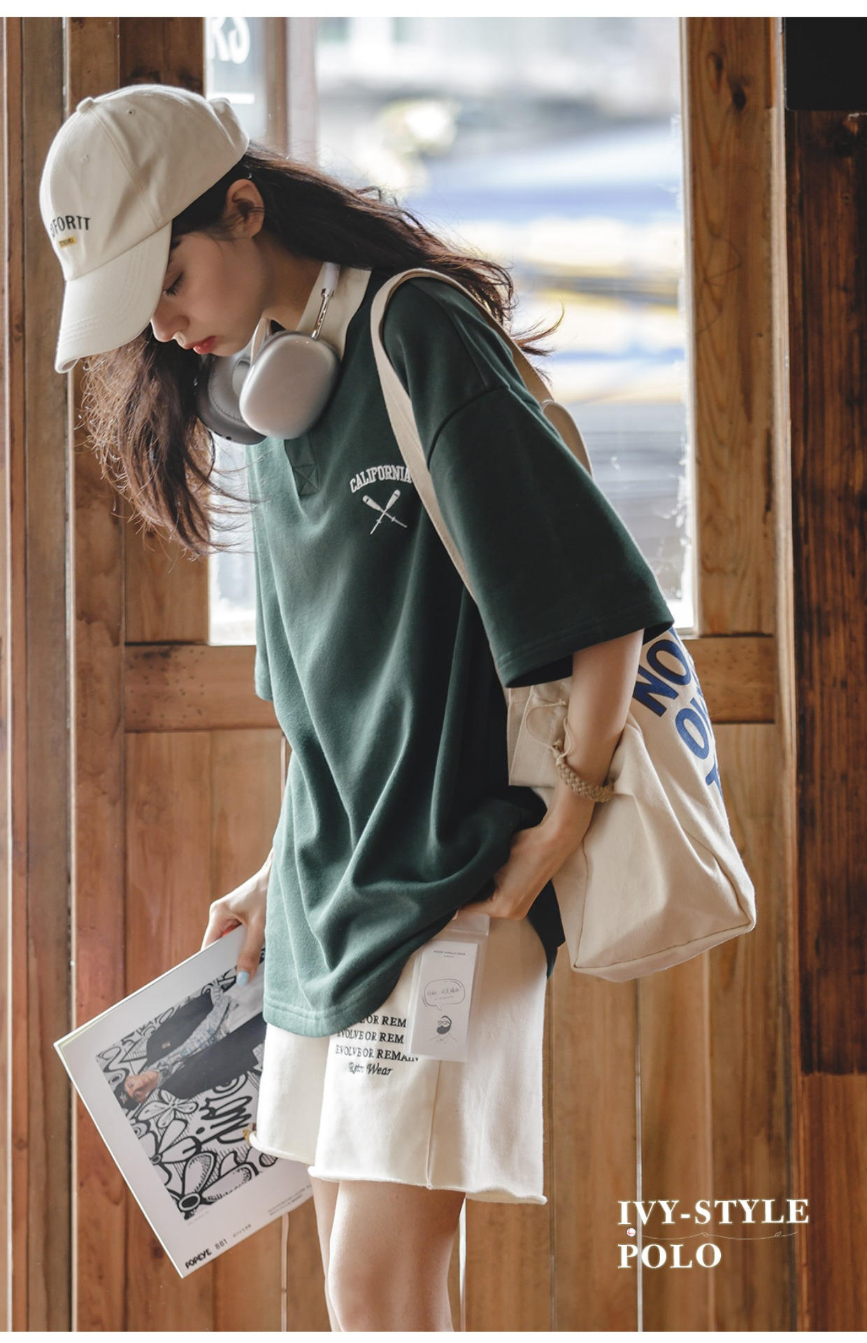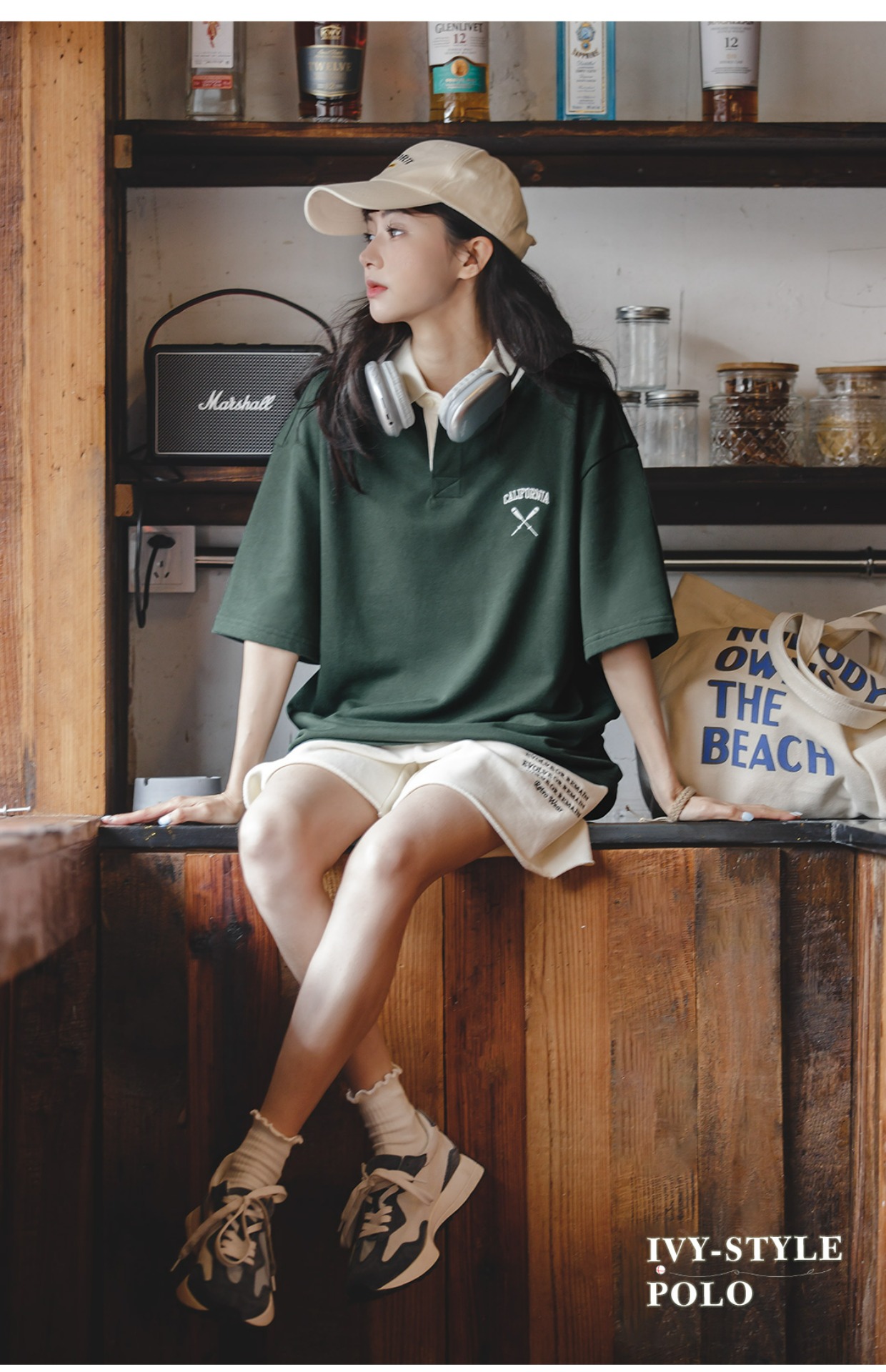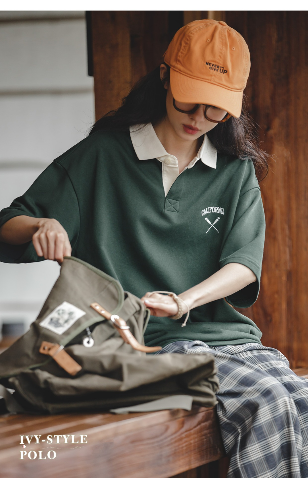 马登女装美式复古翻领短袖学院宽松polo领显瘦针织大码小个子上衣
