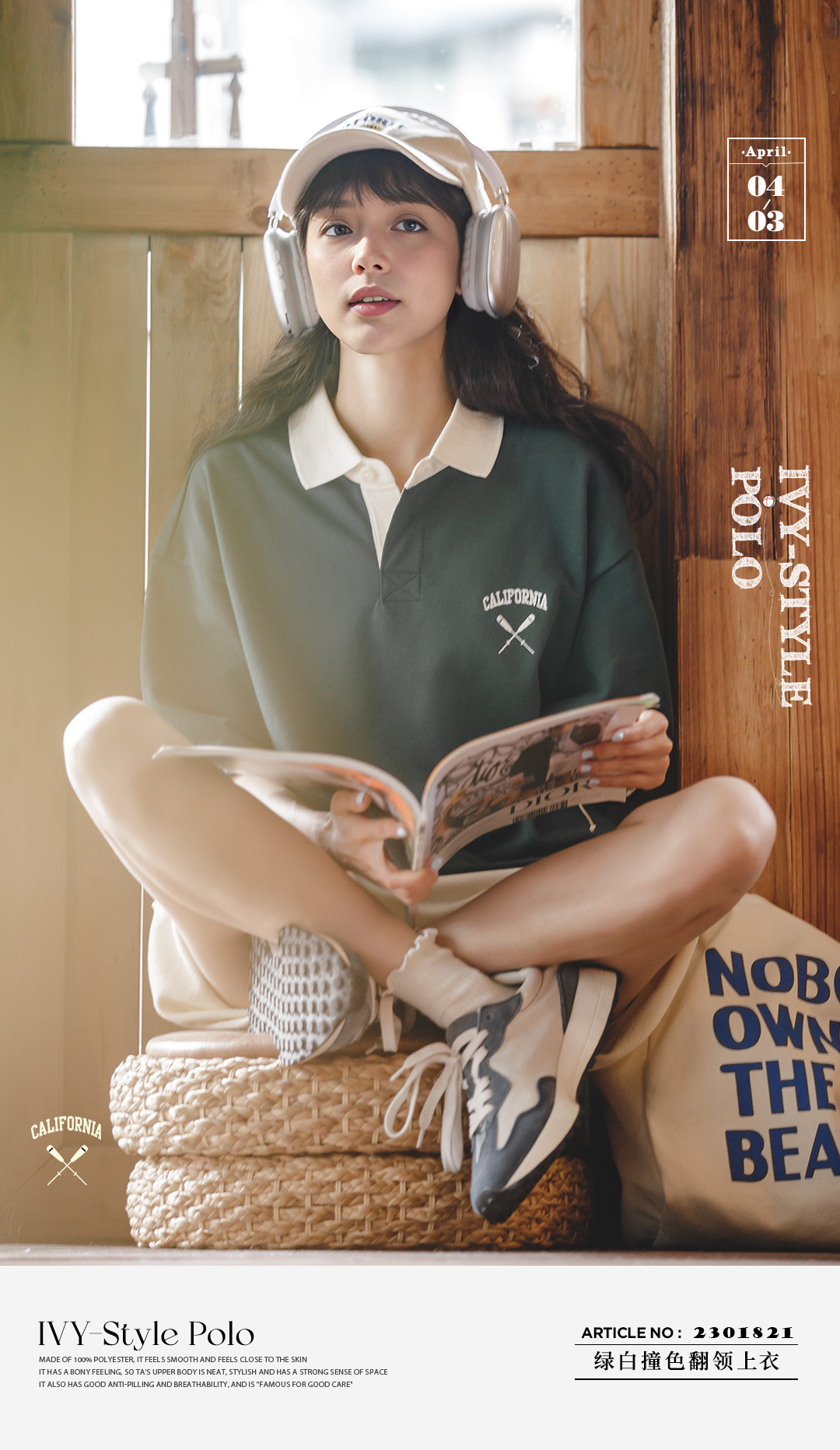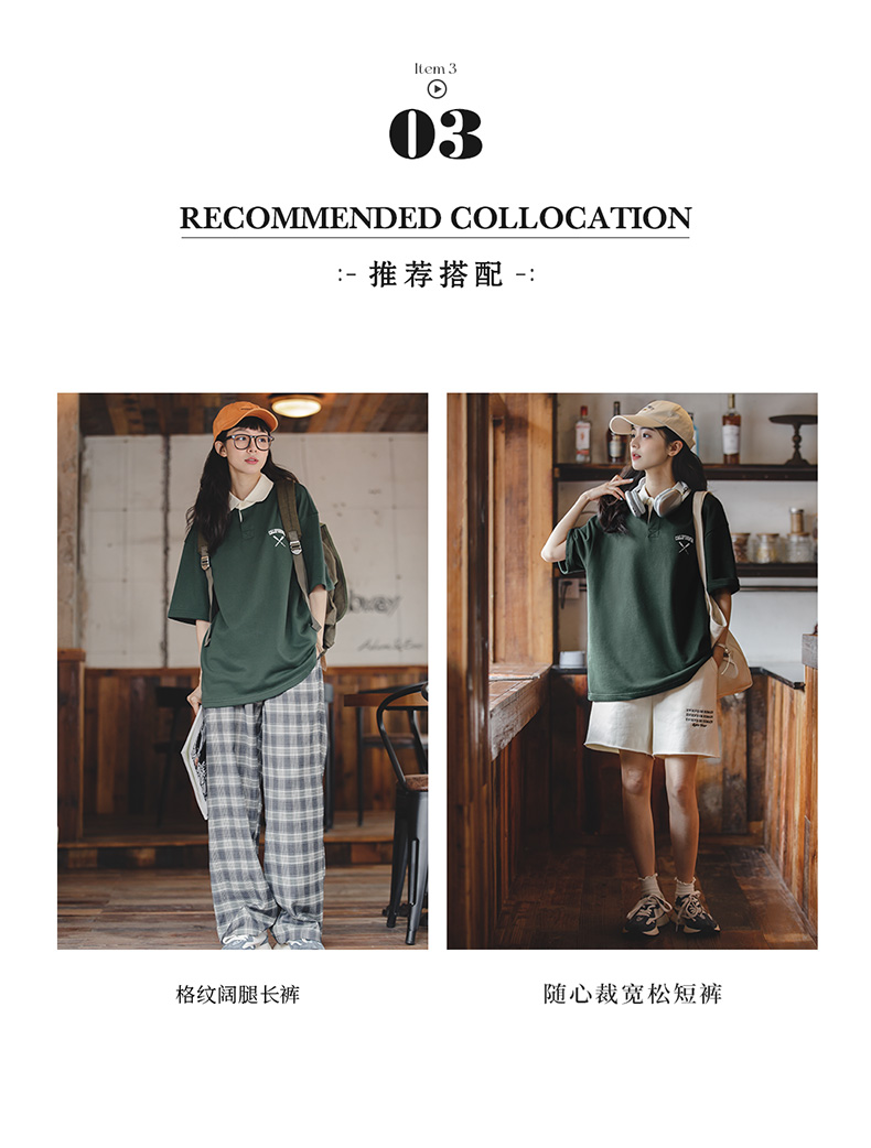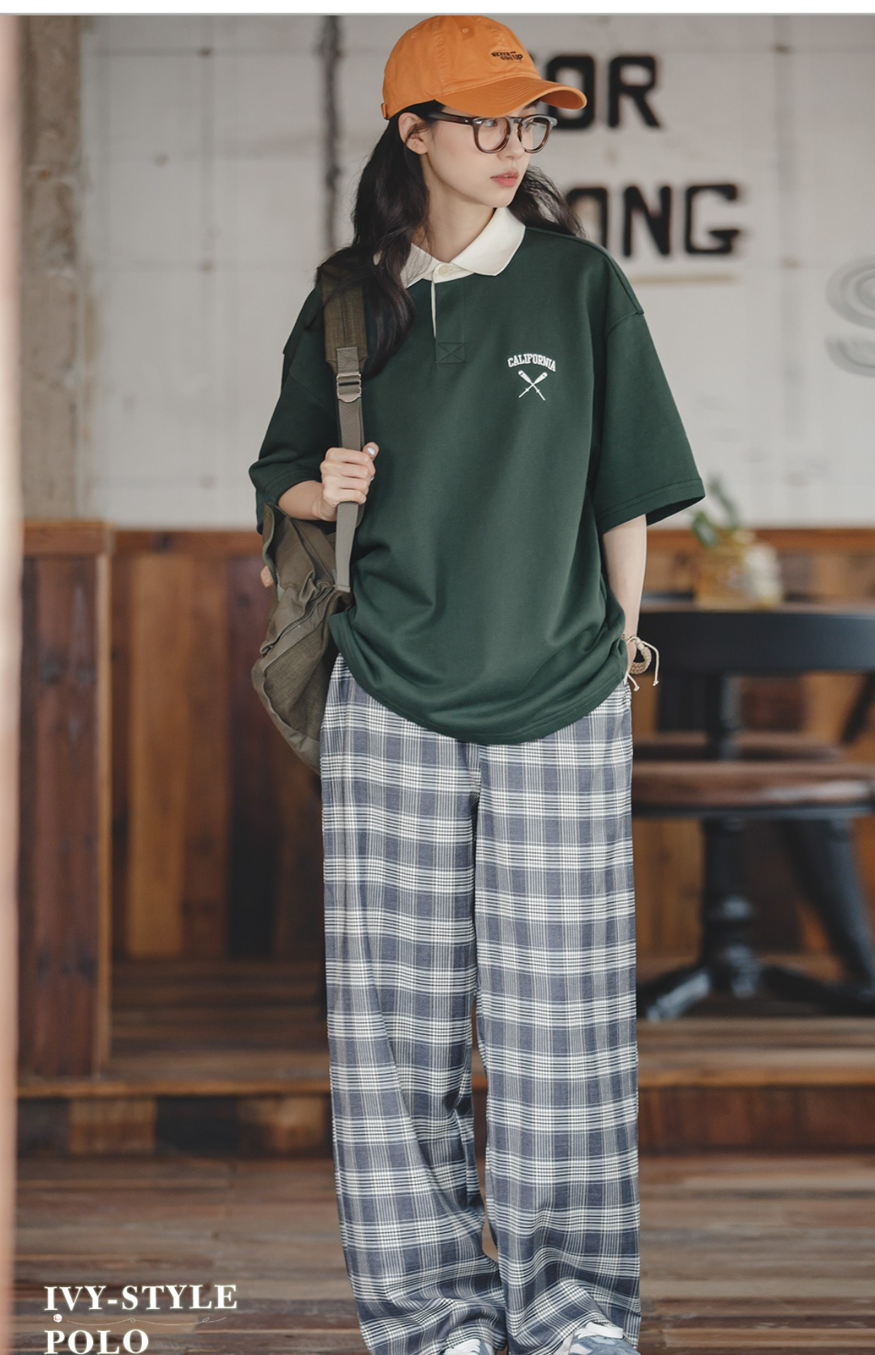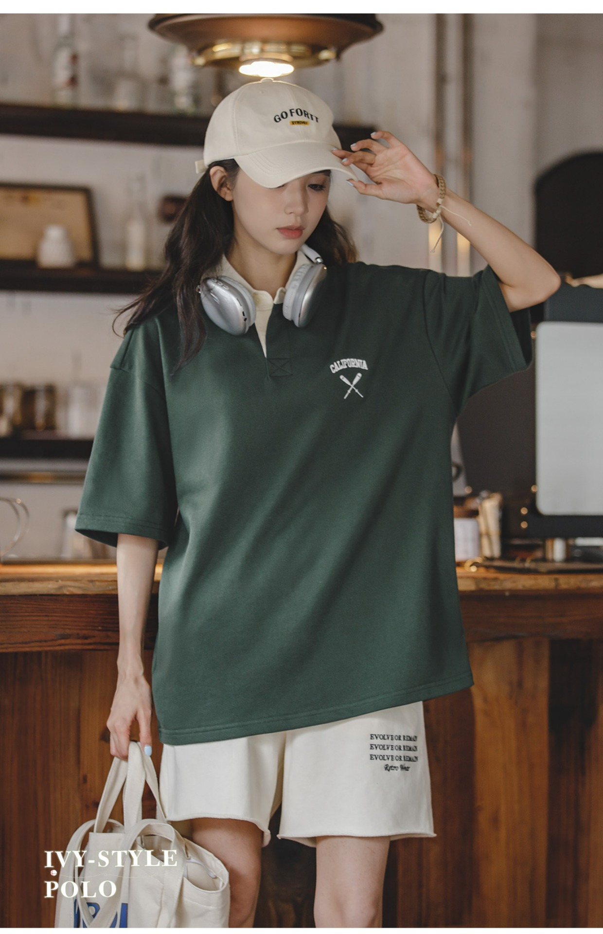 马登女装美式复古翻领短袖学院宽松polo领显瘦针织大码小个子上衣