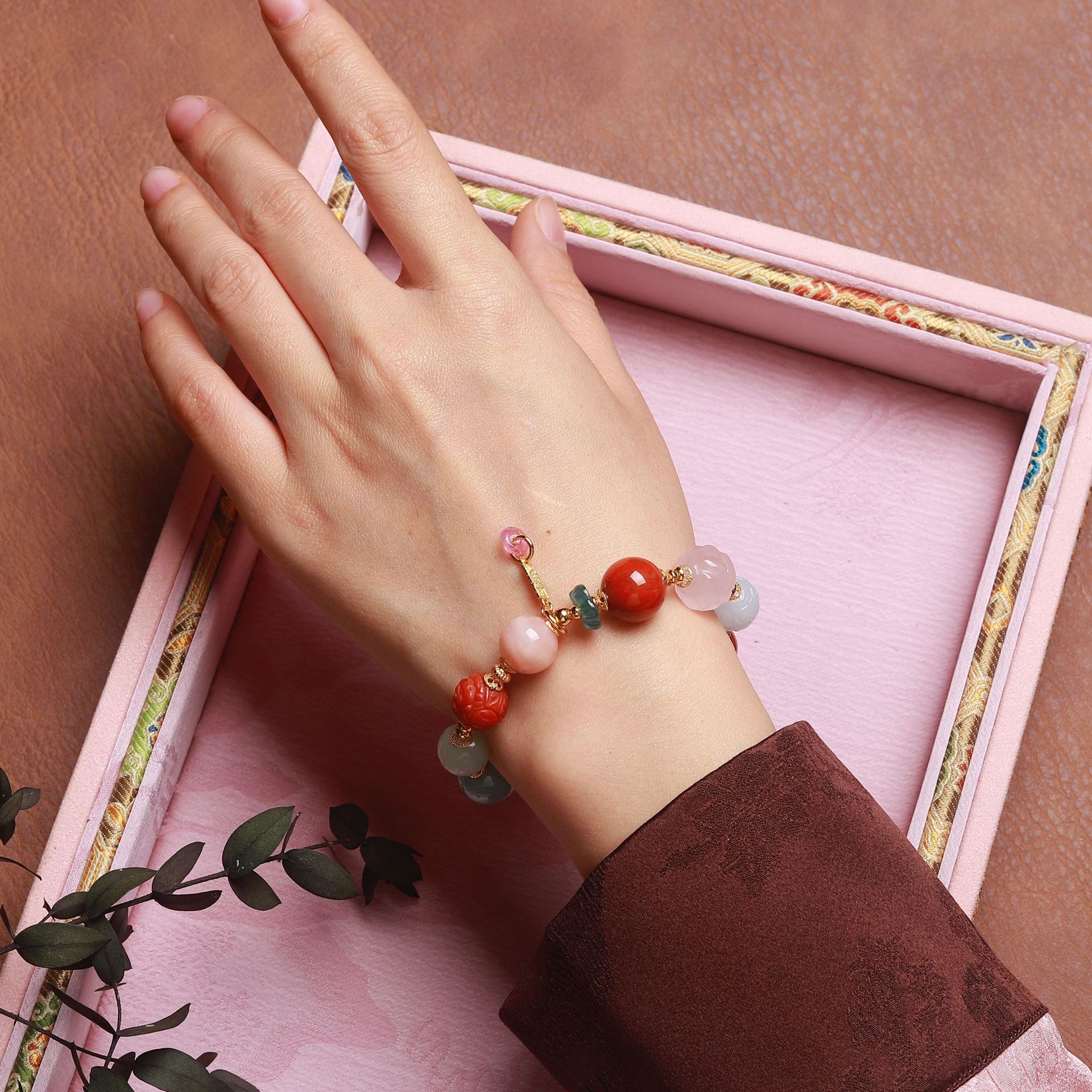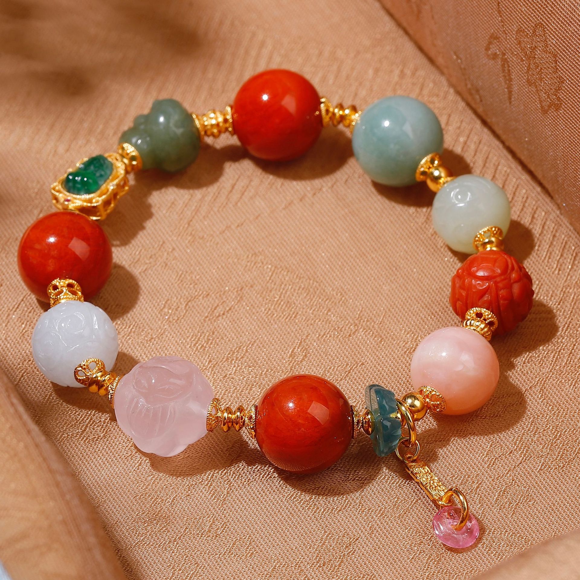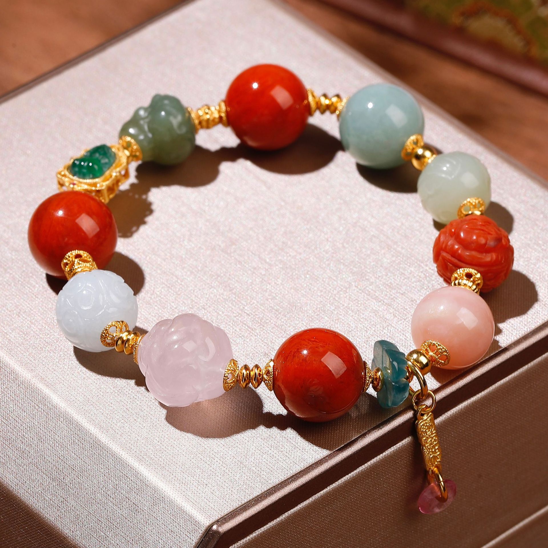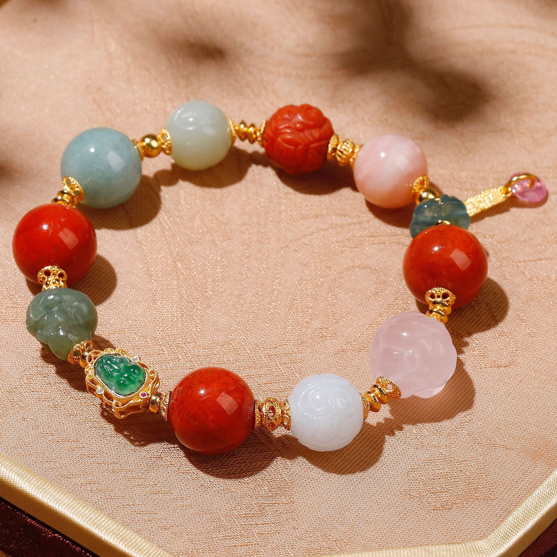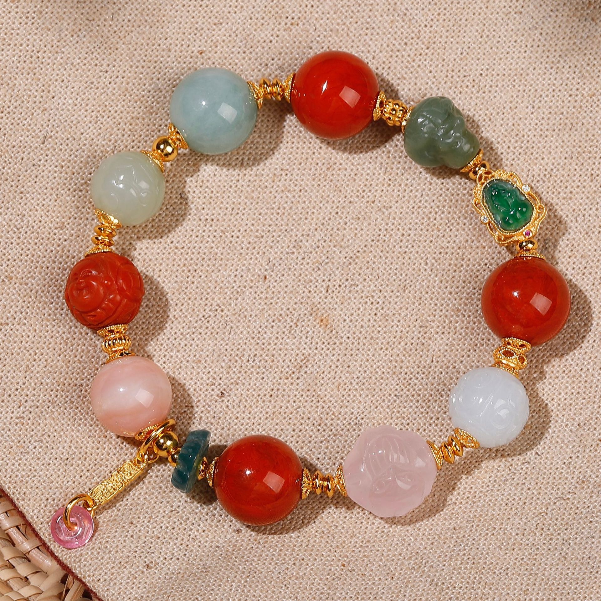 【材质】天然翡翠貔貅镶嵌,天然南红财富一生12mm左右,天然和田玉招财爷11mm左右,天然满色满肉南红13mm+,天然粉晶凤九14mm左右,天然翡翠回纹12mm左右,天然粉奥宝12mm左右,天然翡翠A货辣绿13mm左右,天然蓝水10mm,天然红碧玺平安扣,天然和田玉11.2mm左右