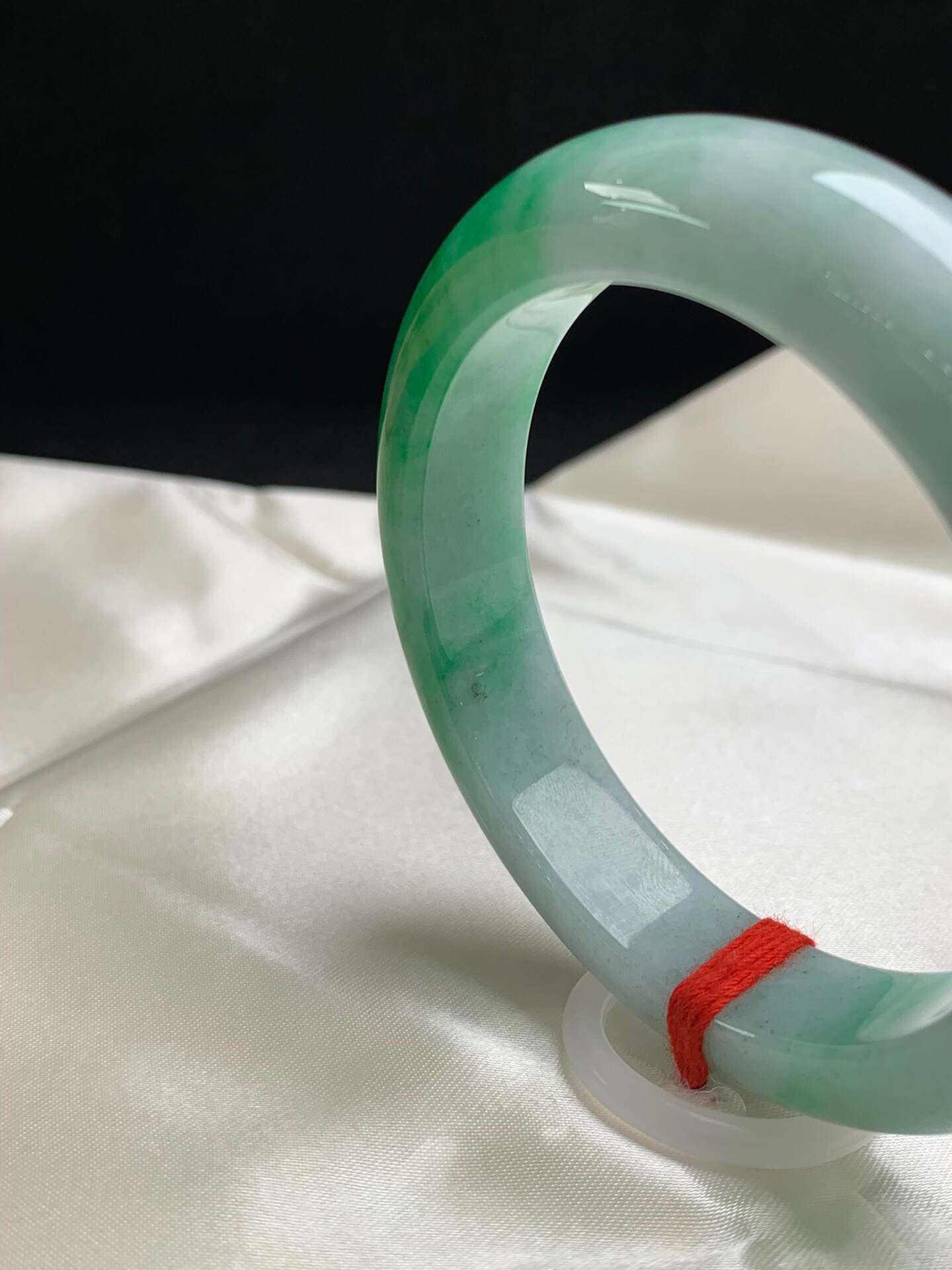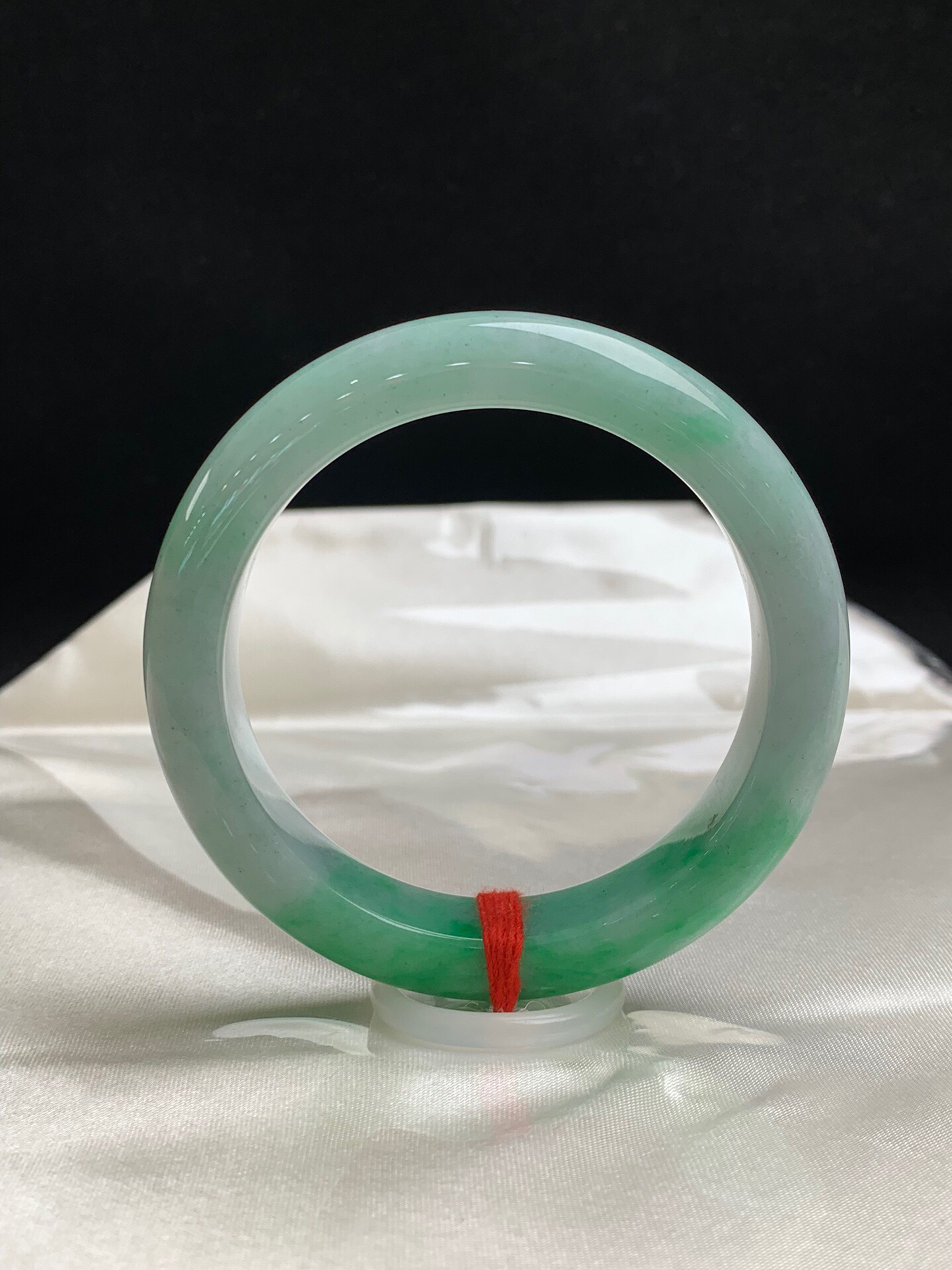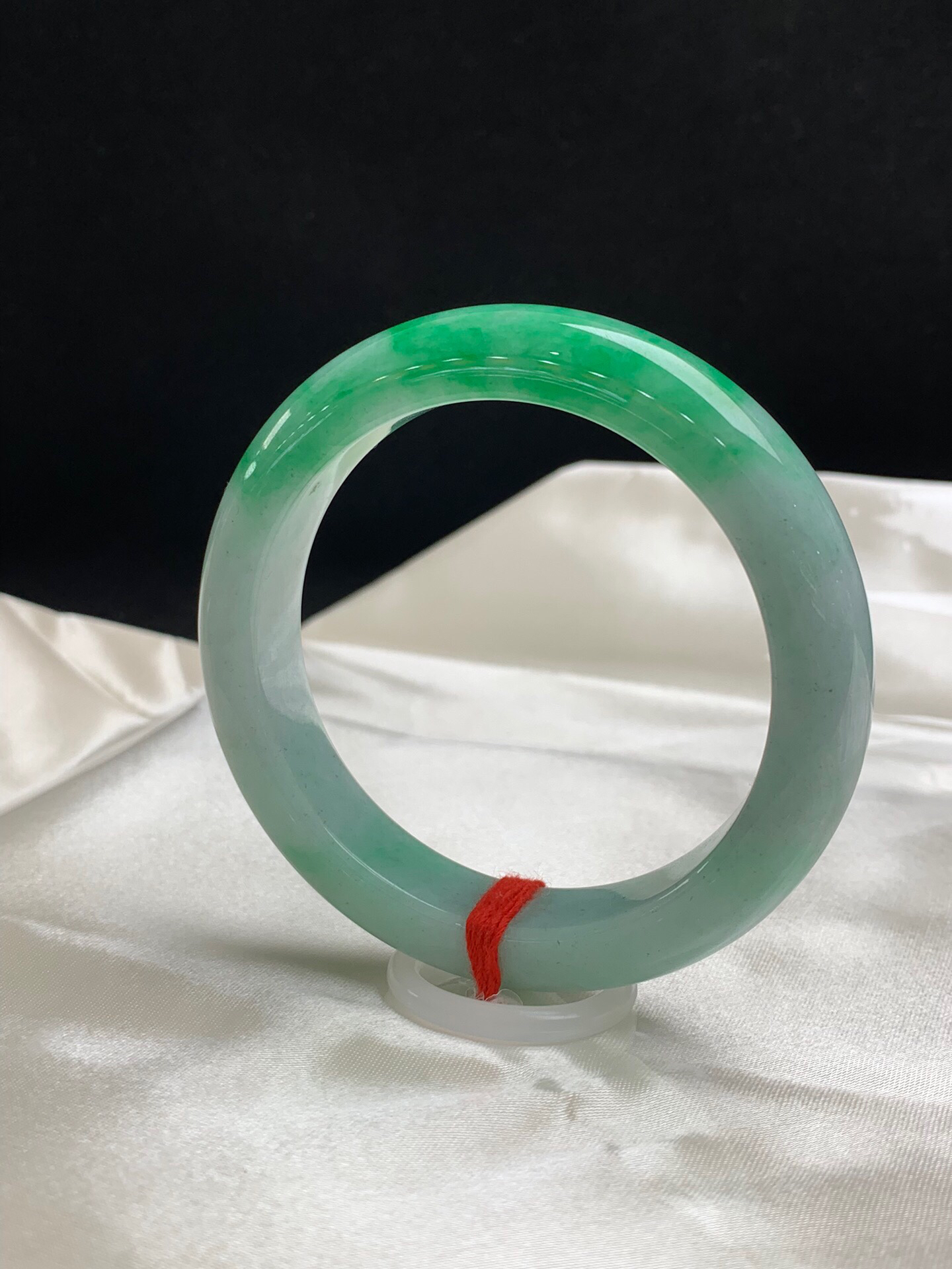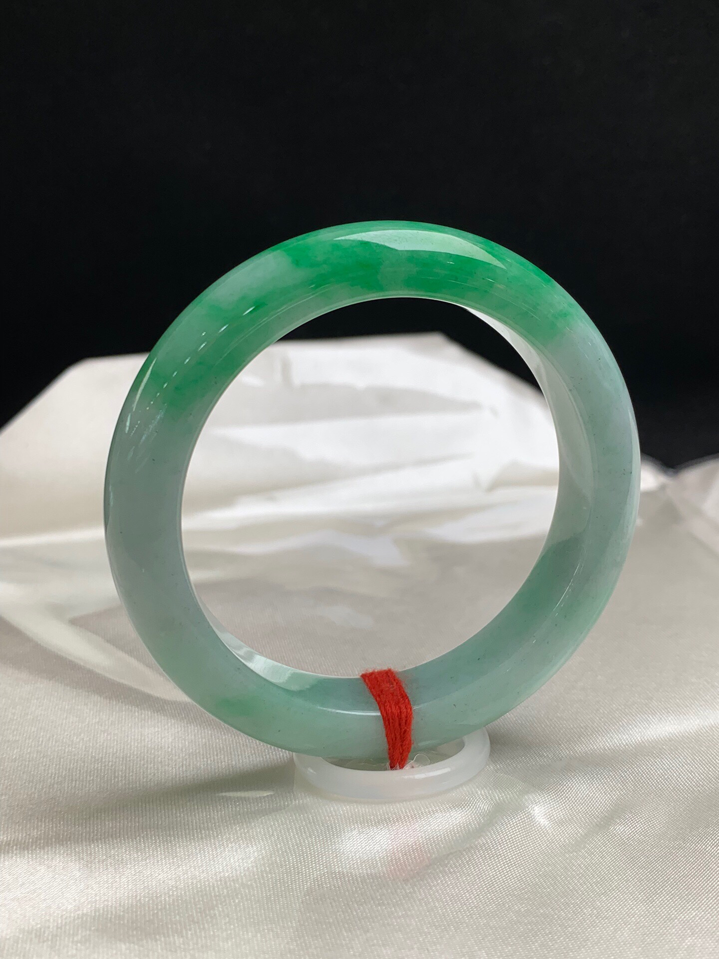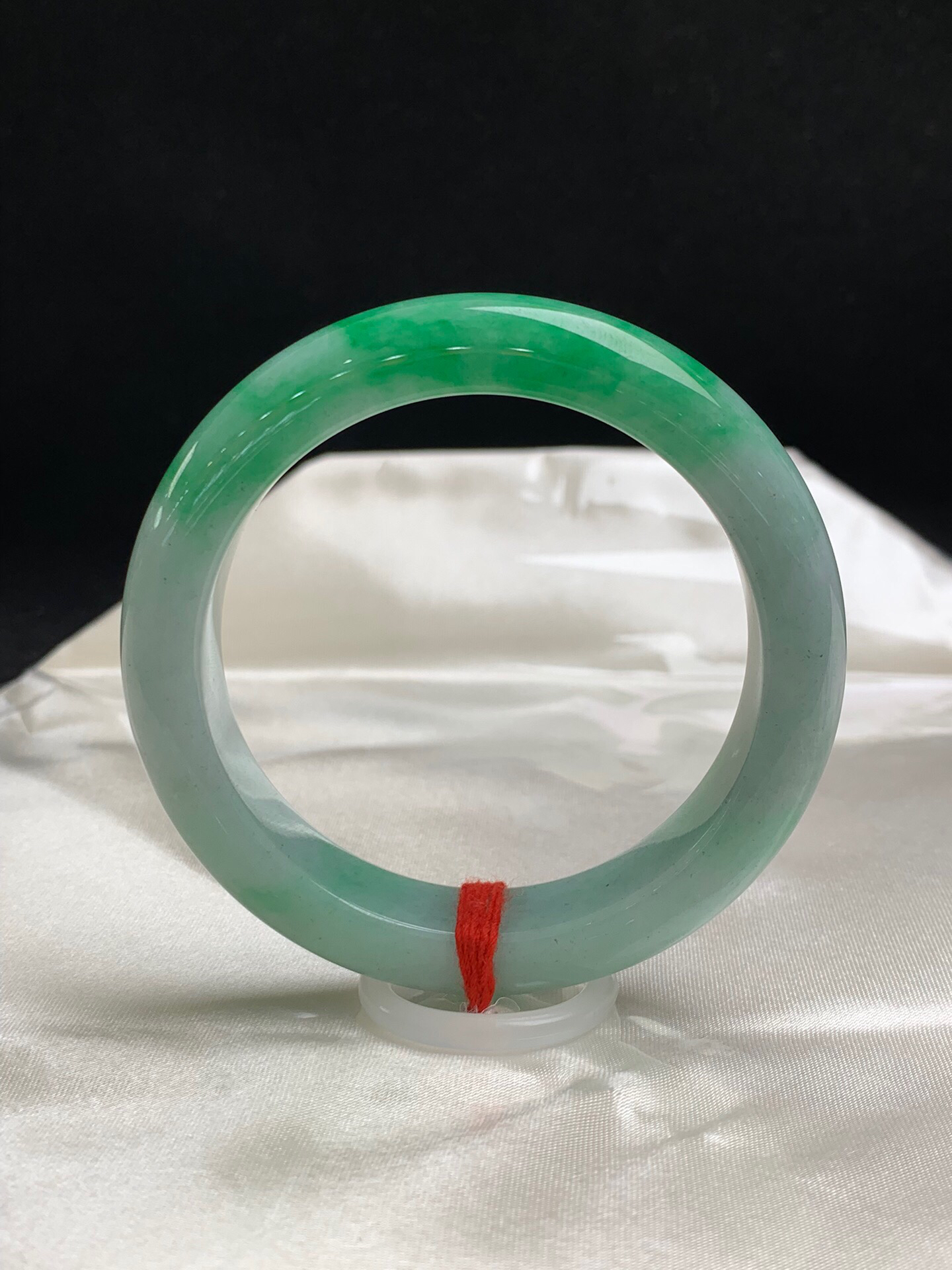 612250,55.3圈口,飘绿正圈平安镯,淡底色飘一截阳绿色,色浓,底子细腻,内圈有个矿点,无纹裂,尺寸:55.3-12.8-9.2,超值价💰45500
