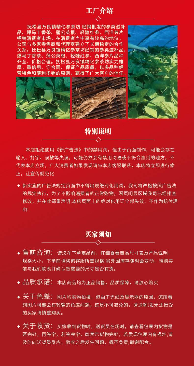 抚松县万良镇精亿参茶坊经销批发的林下参、西洋参、刺五加茶、红参片、无糖红参等消费者市场,在消费者当中享有较高的地位,公司与多家零售商和代理商建立了长期稳定的合作关系。 抚松县万良镇精亿参茶坊经销的产品品种较多、价格合理。抚松县万良镇精亿参茶坊实力好,重信用、守合同、有着好的产品质量,以多品种经营特色和薄利多销的原则,有了客户的信赖。