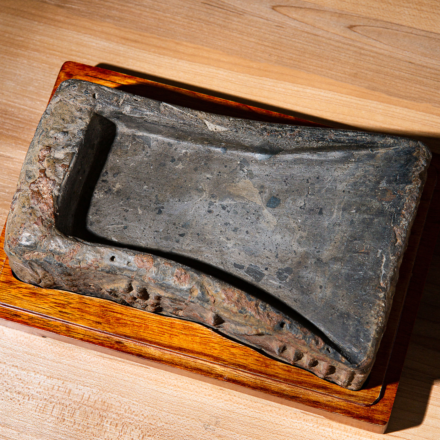 吴昌硕先生同款“赤乌七年”古砖砚,其铭文字体古拙,砚型俊雅,胎质坚实细腻,配有手工精制刻字木盒,是文人案头之珍品。