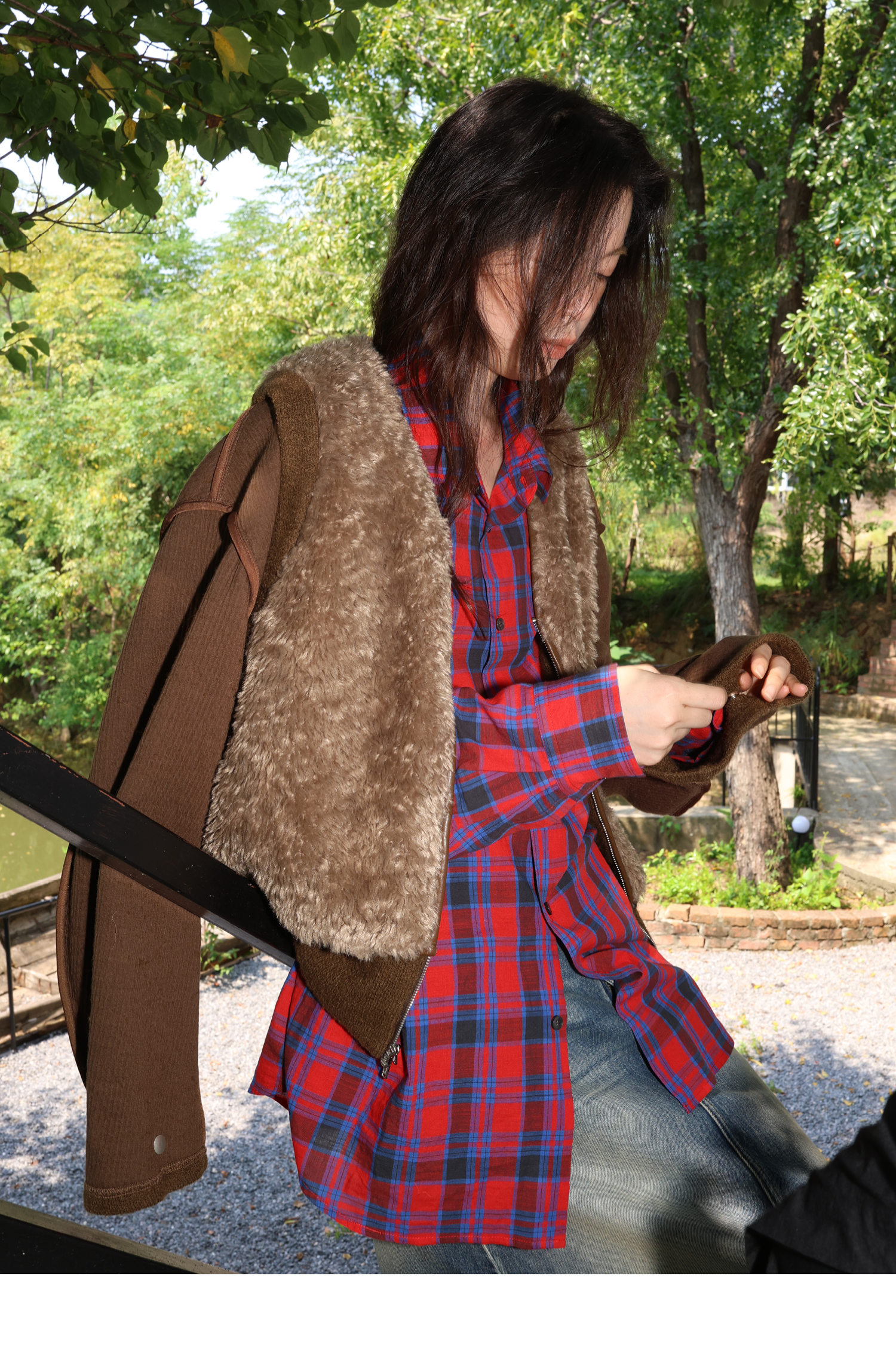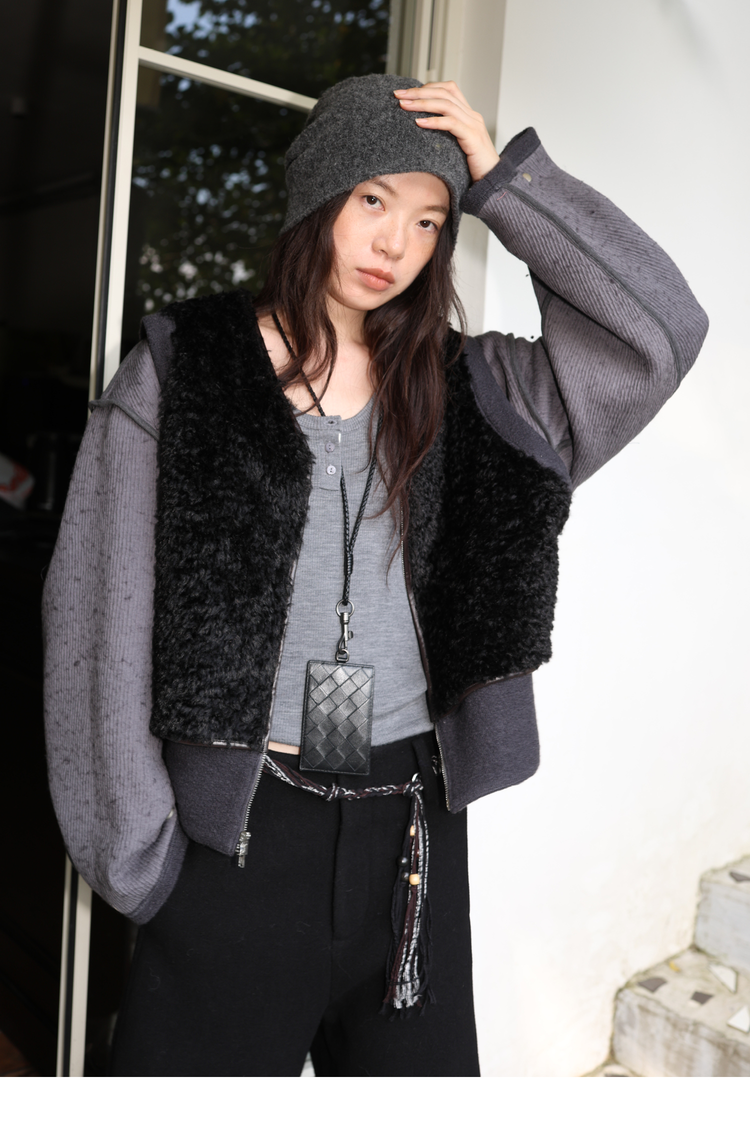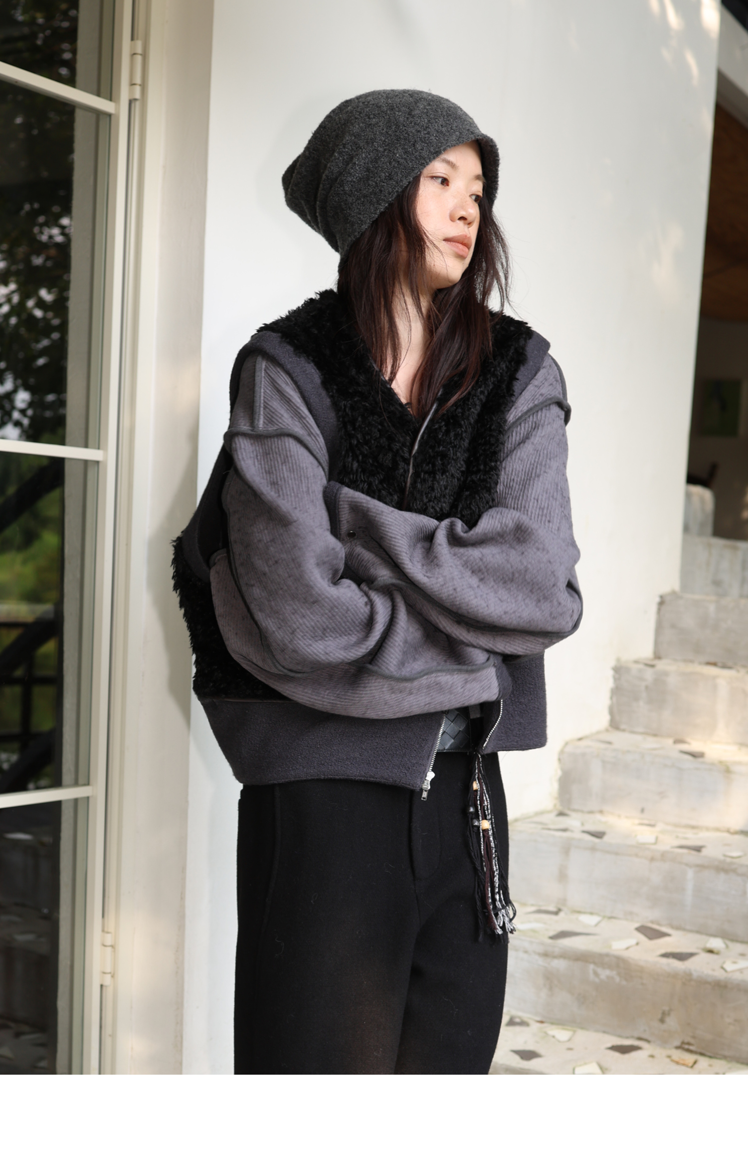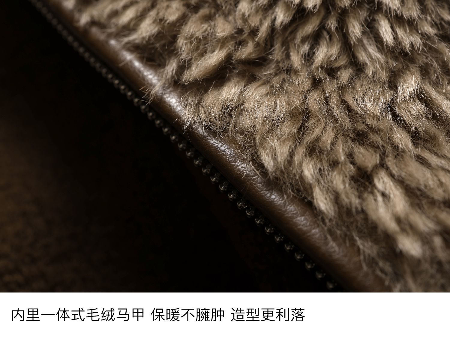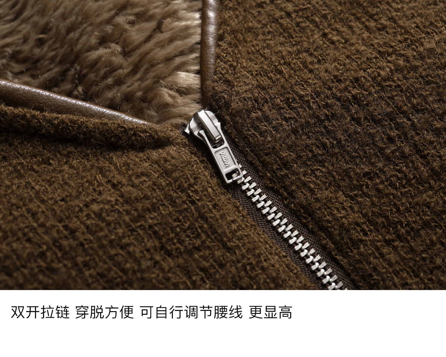 素舶 绵羊毛坑条环保皮草内里马甲V领拉链百搭卫衣开衫短外套