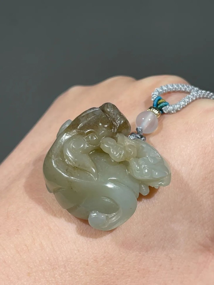 此褐沁籽料白玉巧色镂雕子母瑞狮,整料镂空圆雕巧色琢磨而成,褐色母瑞狮面容与子瑞狮细节栩栩如生,灵动飘逸、粗细有致,老包浆皮壳温润细腻,已繫绳结可以佩戴为吊坠绳结項链,手握盘玩,握于掌中温润细腻,爱不释手。