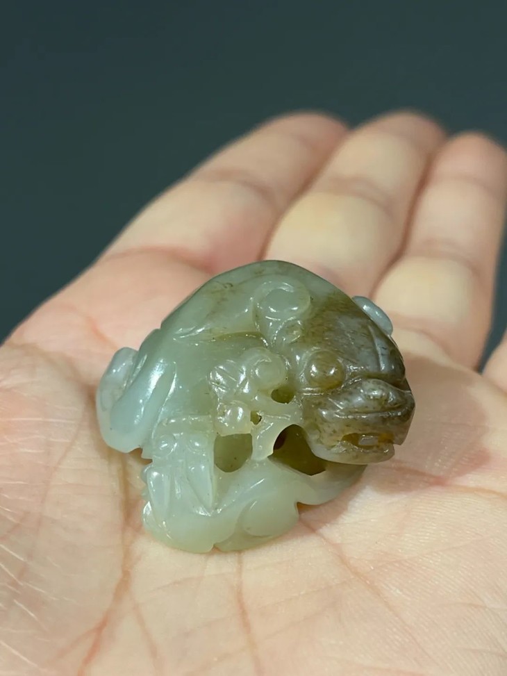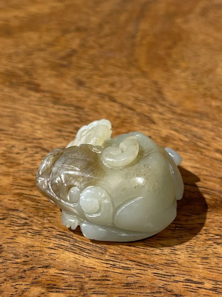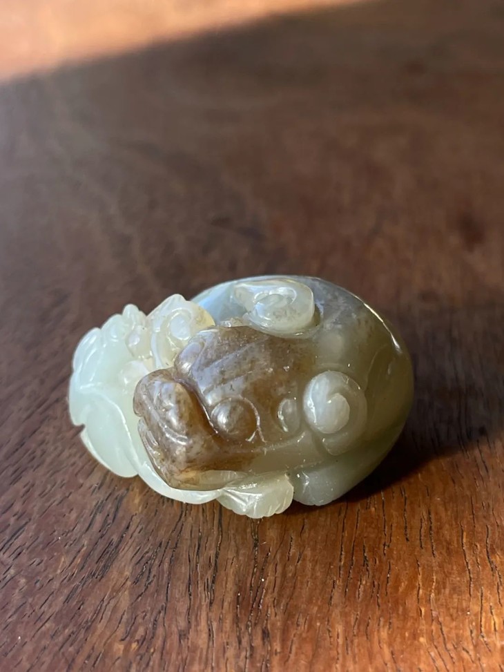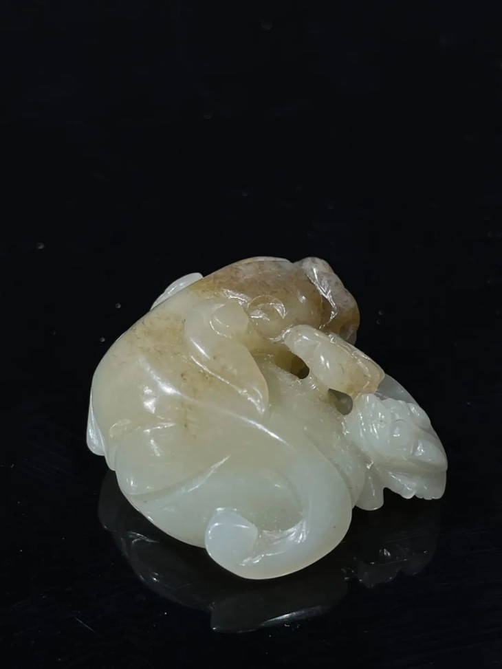 此褐沁籽料白玉巧色镂雕子母瑞狮把玩件,除边沿稍有细微磕碰痕之外,保存完好,表面包浆皮壳温润细腻。