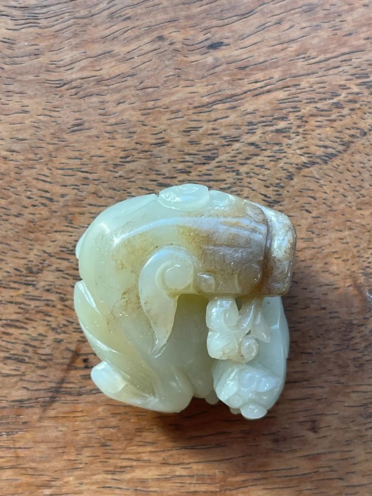 这是一件以质地佳的和田褐沁籽料白玉巧色镂雕而成的子母瑞狮吊坠手握把玩件,玉石质地堅硬、局部褐沁白玉色泽柔美,皮壳包浆温润,全器玉质纯净温润,立体圆雕,保留褐沁为母狮头部,卧坐瑞狮与依偎一起的瑞狮幼子,整体构图生动典雅,瑞狮面容体态,巧色雕琢工艺精湛、表面处理圆融细致,立体圆雕刀法娴熟简洁流畅,尺寸虽小生动精美。