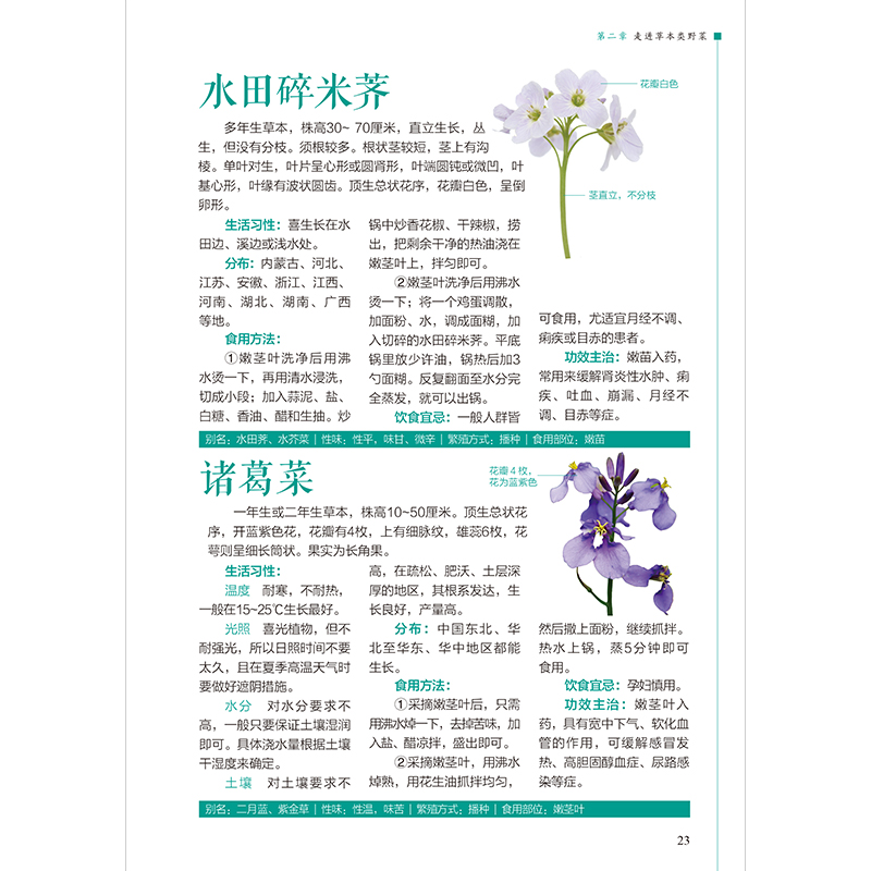 本类及菌类,以方便读者识用。同时,本书为每种野菜配备了高清彩图,采用图鉴的方式展现野菜的各部位特征,方便读者辨认。本书兼具实用性和知识性,不仅能指导读者采摘和食用野菜,还能为读者科普野菜知识。