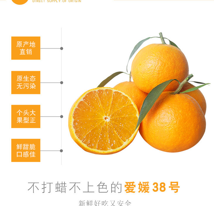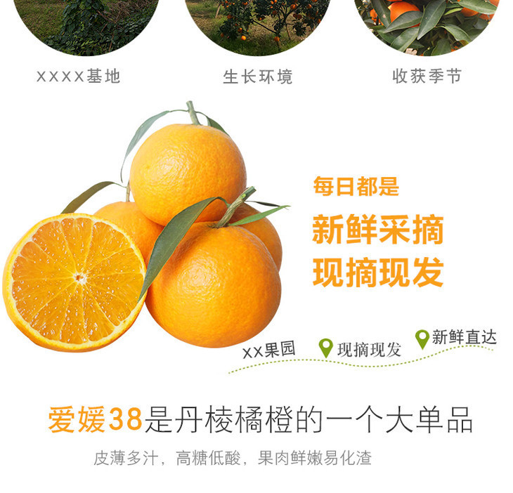等待了一年,爱媛38果冻橙如期而至~今年,我们依旧选择老果园,四川省内口感远近闻名的产区,丹棱县!丹棱县的爱媛可谓是皮薄,多汁,纯甜,无渣!我们不抢市不早摘,耐心等候糖分达标!给与你们的,都是完美的口感~