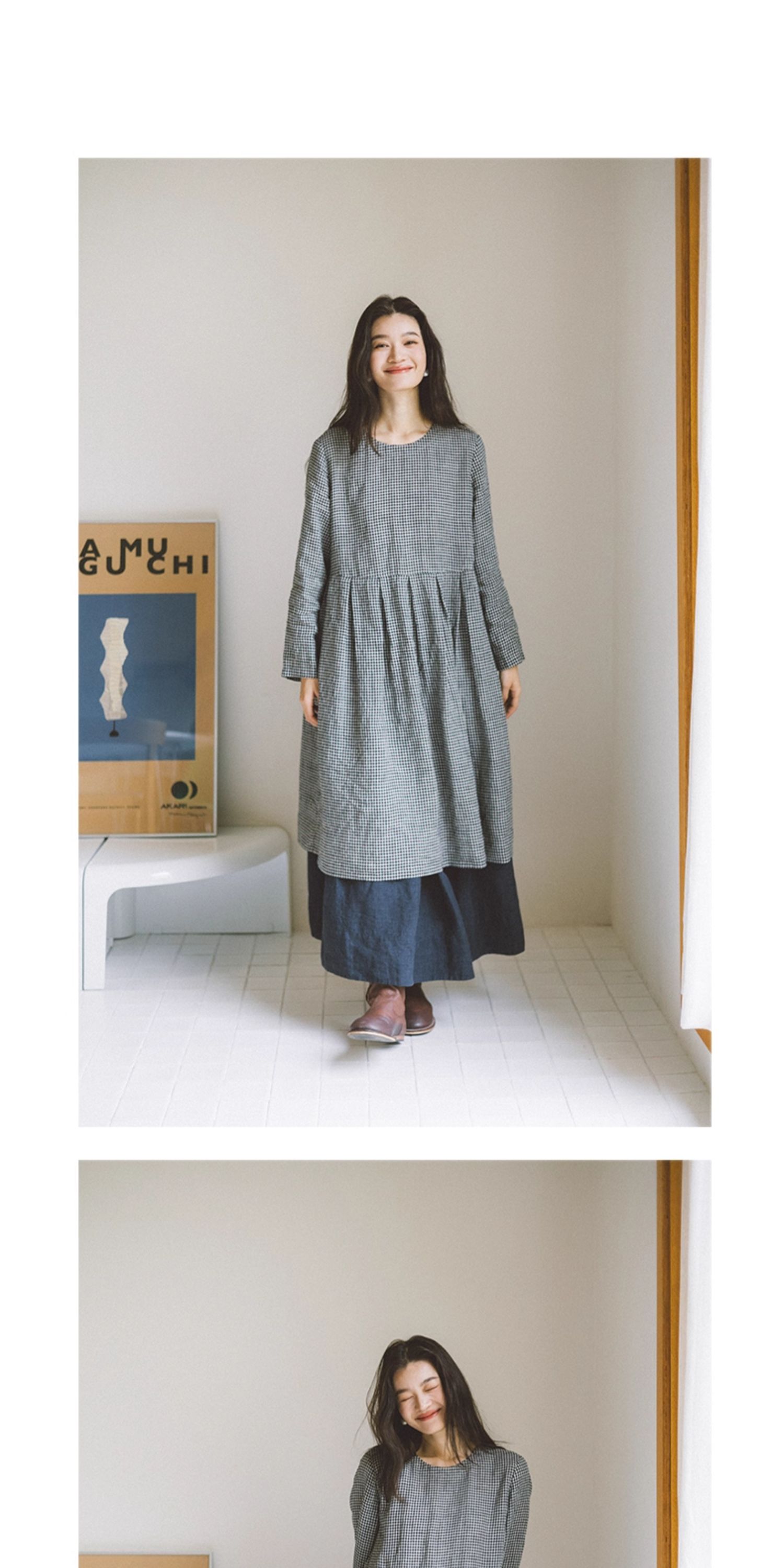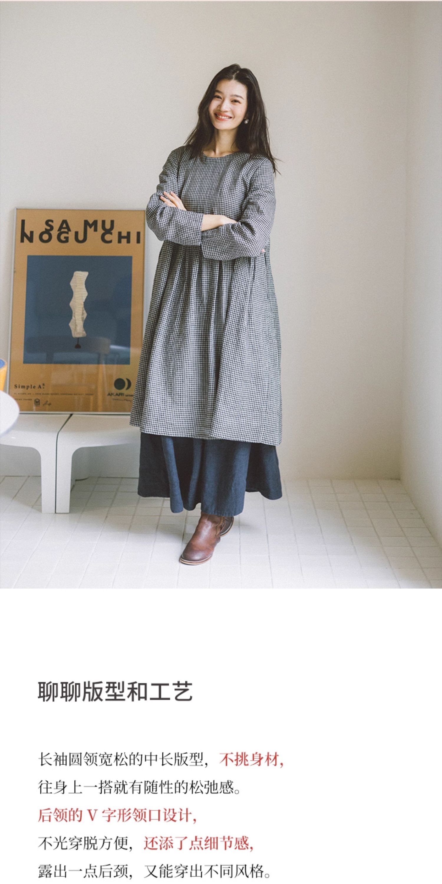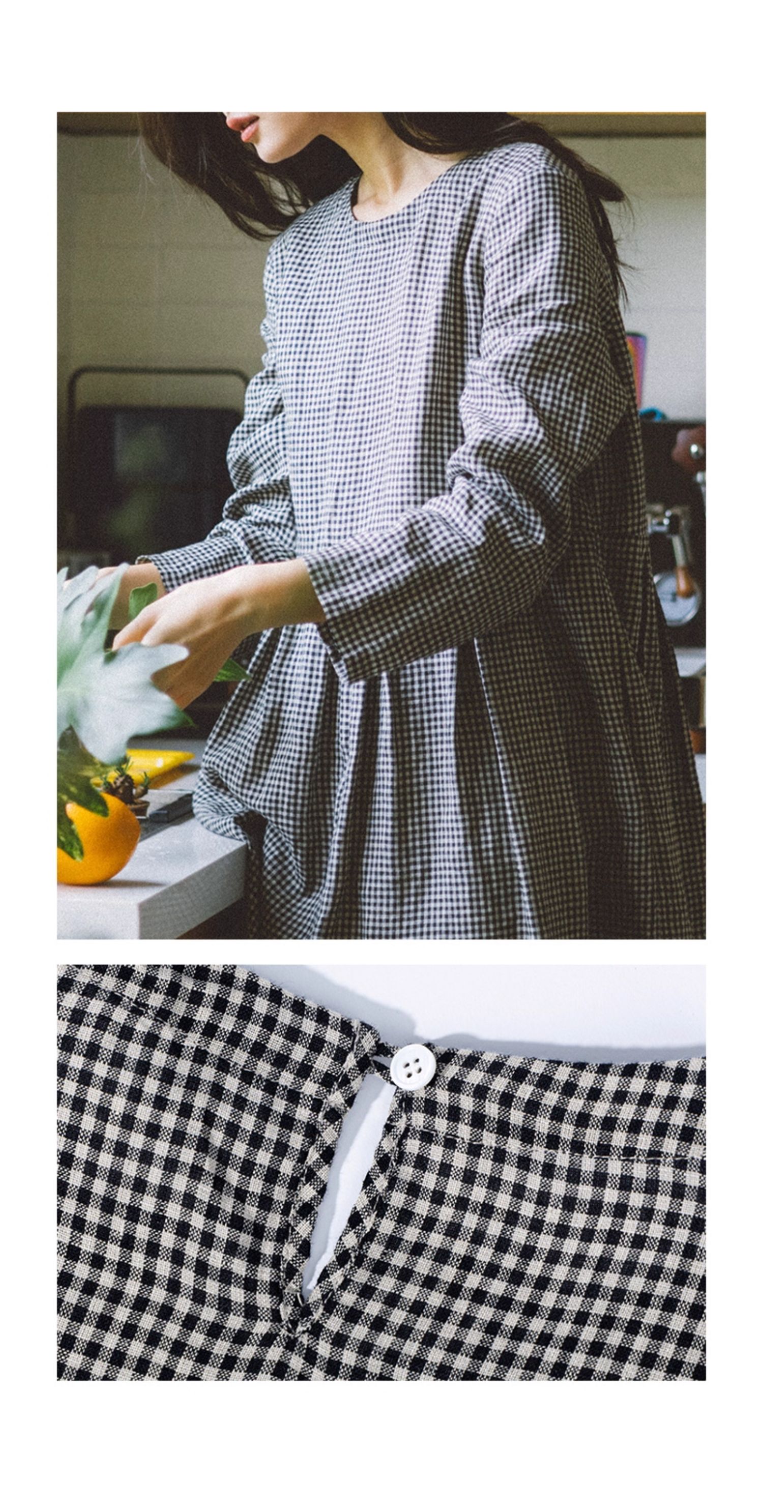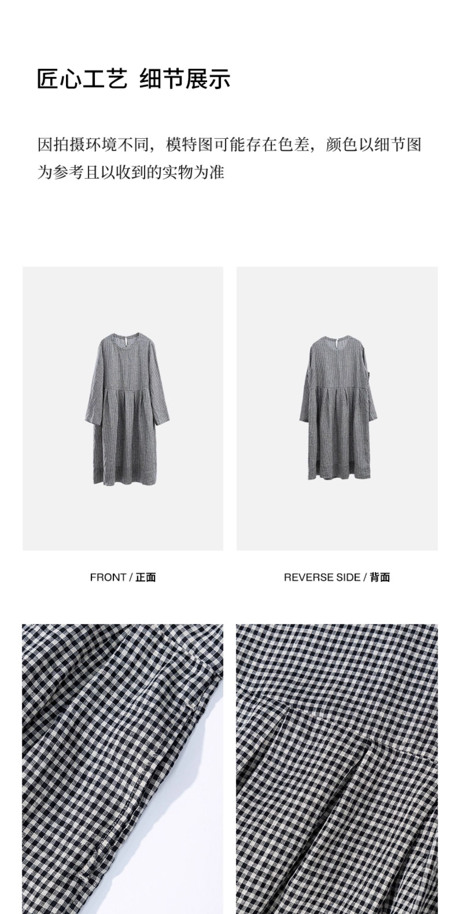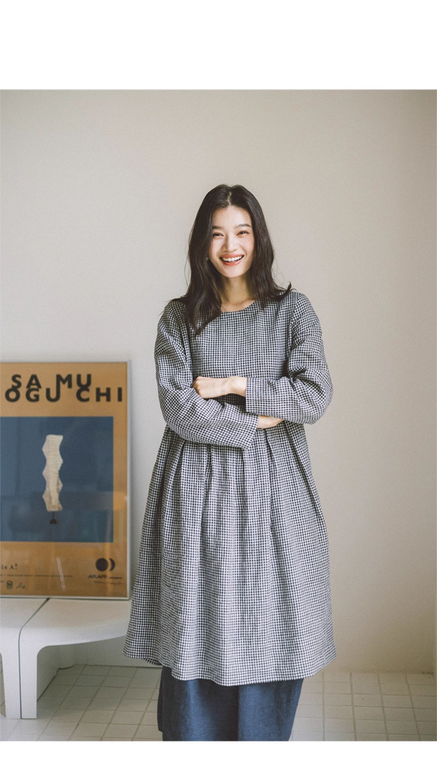 绽放794朵/叠搭神器格子裙·纯亚麻格纹中长款长袖连衣裙2025新款