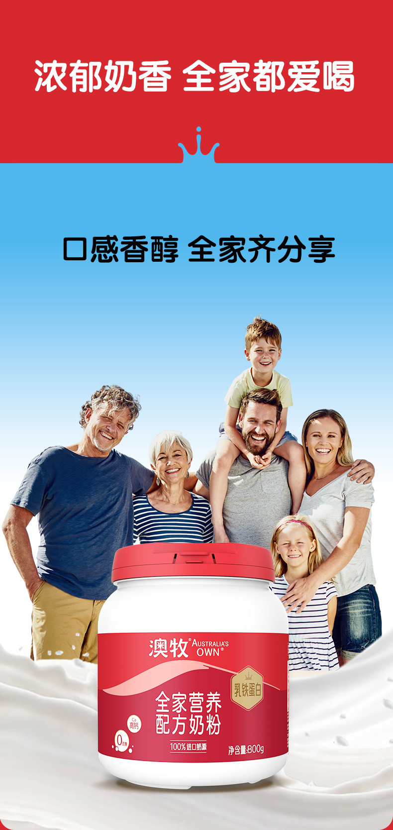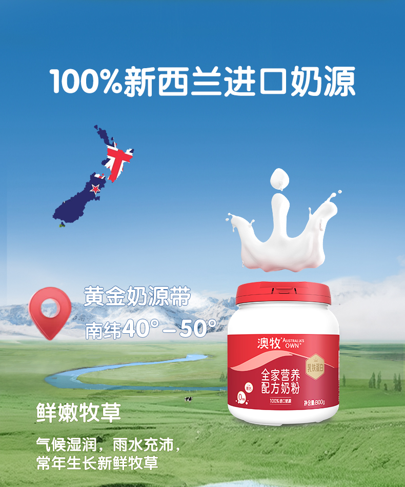 【领券下单】澳牧全家营养配方牛奶粉800g(罐装)含 乳铁蛋白 652mg钙+维生素D 进口奶源
