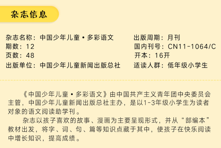 《中国少年儿童·多彩语文》由中国共产主义青年团中央委员会主管,中国少年儿童新闻出版总社主办,是以1-3年级小学生为读者对象的语文阅读助学刊。