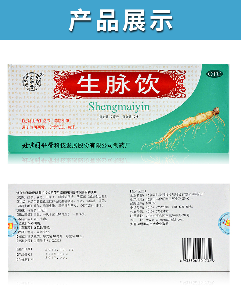 同仁堂生脉饮(人参方)10支益气生津心悸气短自汗气阴两虚