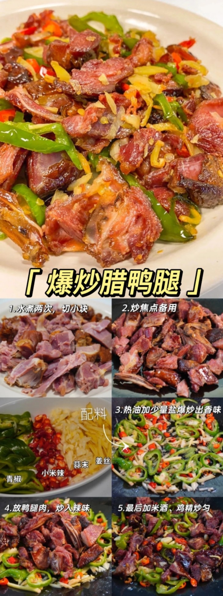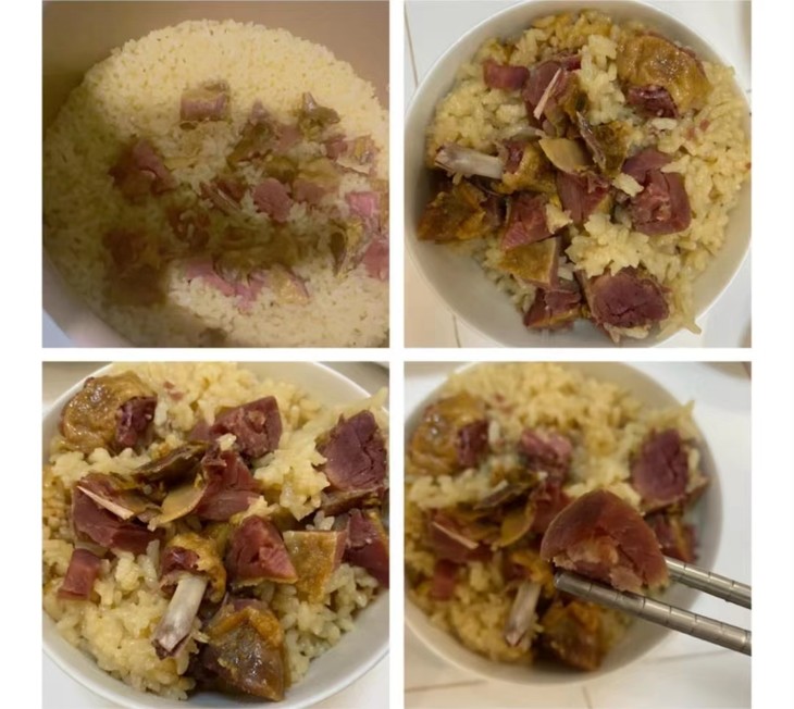 洗好,煮饭时,把备好的腊鸭腿放进饭里一起煮饭焖熟了,就可以吃啦!