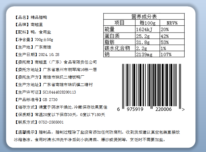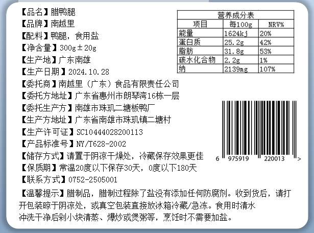 配料表只有鸭肉和盐,腊制过程中也没有添加剂和防腐剂,做了减盐处理,口味也偏咸,口味偏淡的,需要用温水泡一下再吃,介意慎拍!!