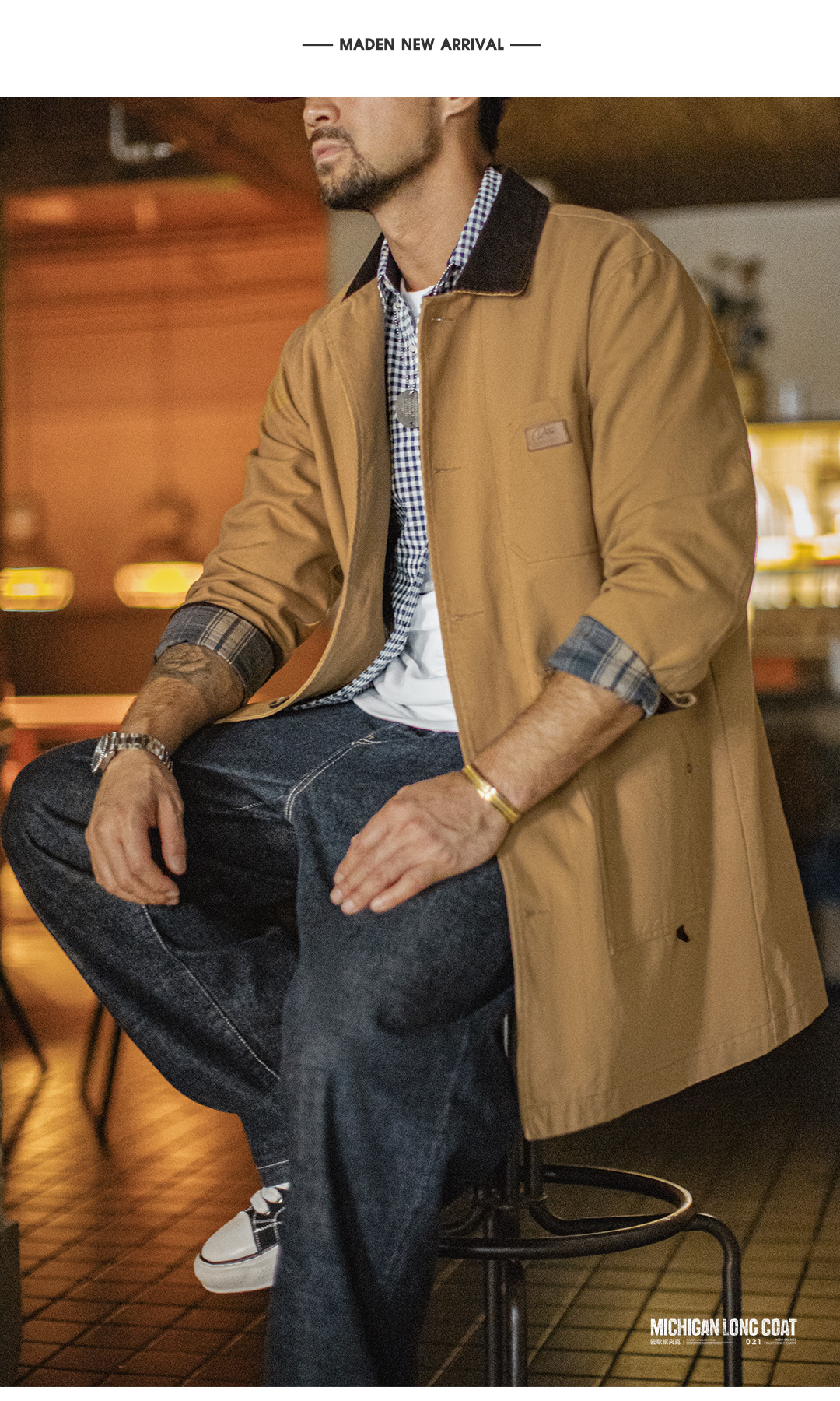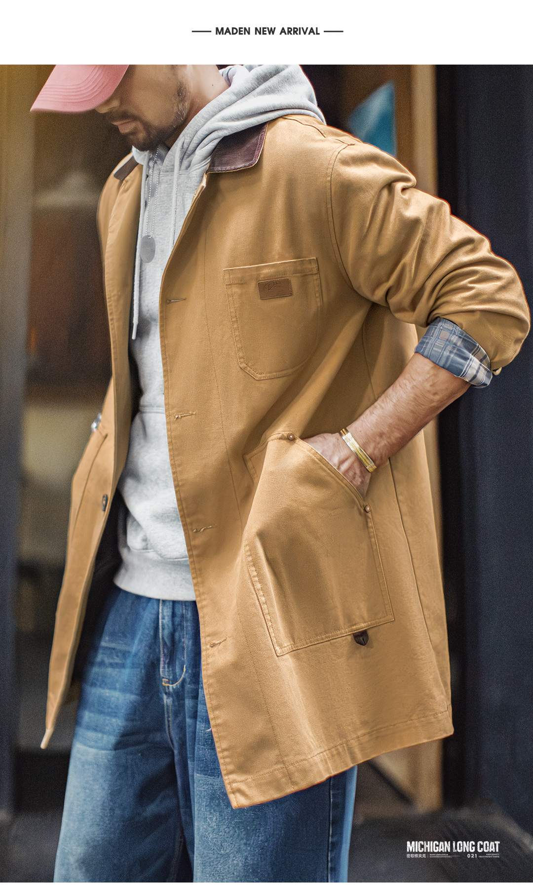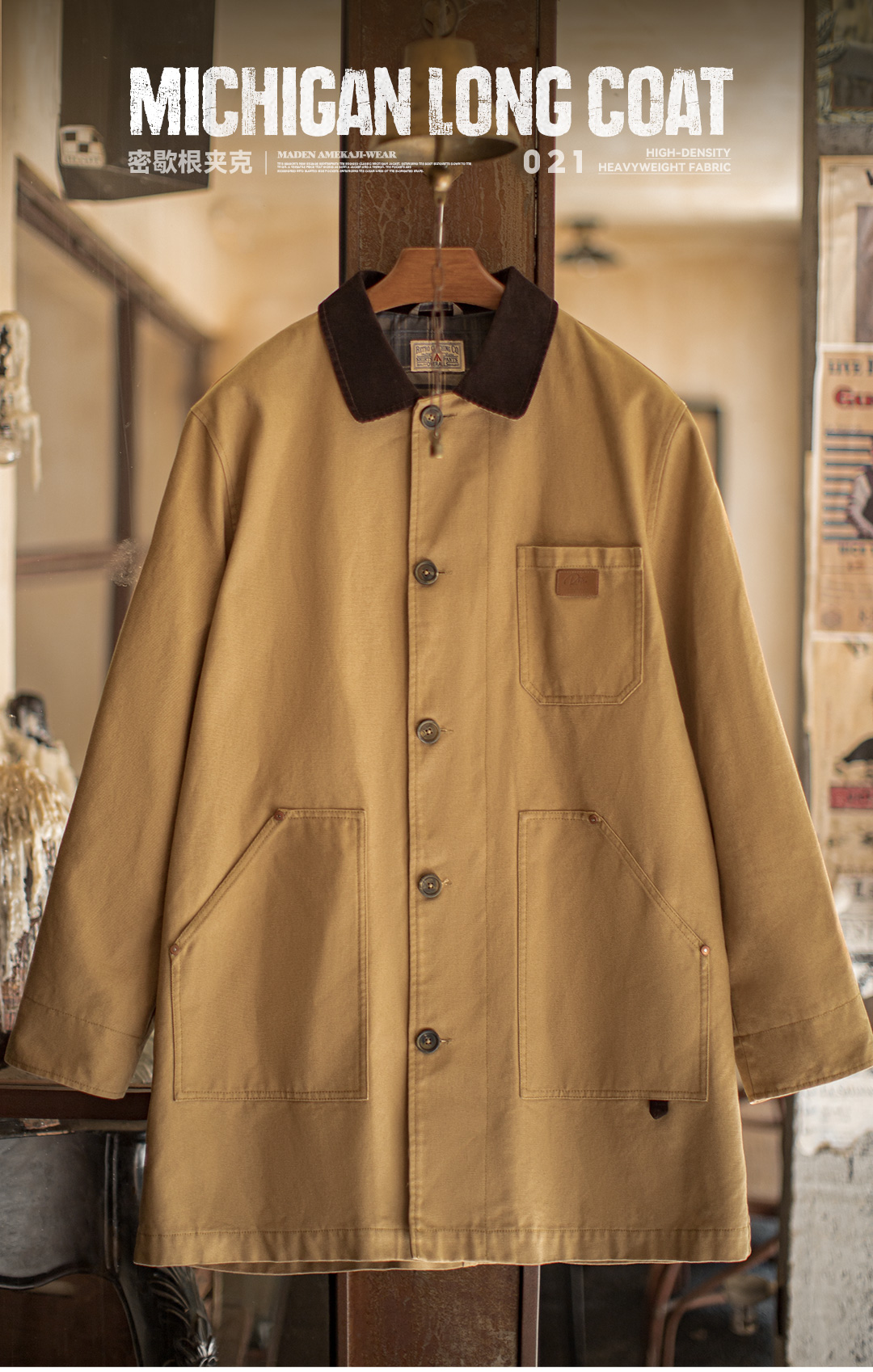 马登工装美式复古密歇根风衣卡其色巴恩风中长款廓形夹克外套男秋