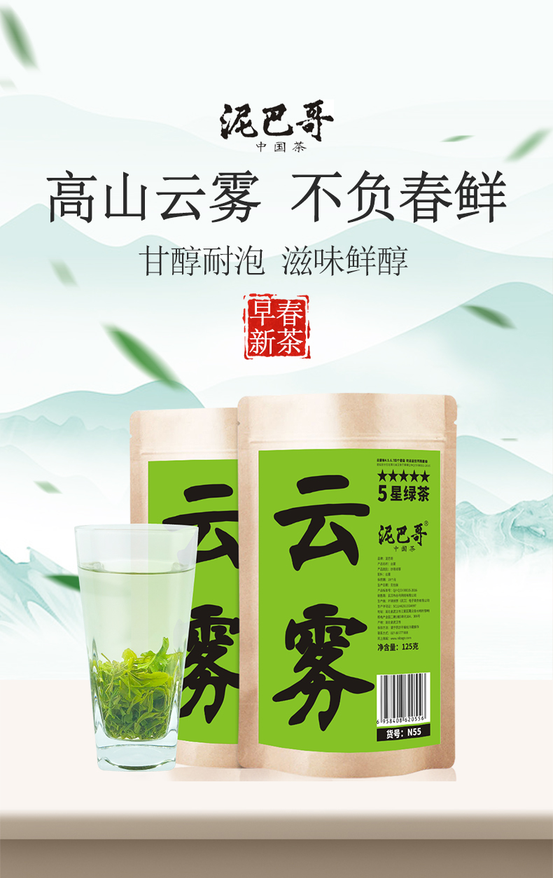 泥巴哥2025新茶明前春茶5星云雾清香绿茶125g*2袋