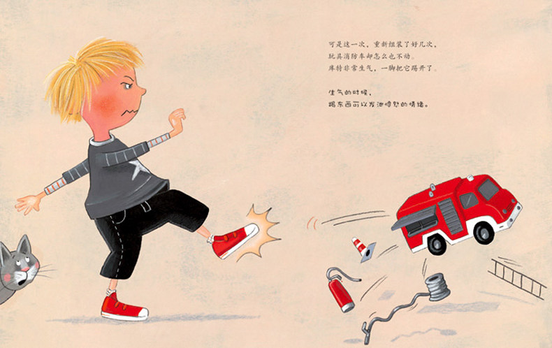 库特无法将玩具消防车重新组装好,于是大发脾气:踢开玩具,红着脸大喊大叫,朝着猫咪大花扔东西,结果库特的气消了,可是大花却再也不想理他了。这本书给小朋友提出了一些发泄愤怒的建议,既可以排解愤怒的情绪,也不会伤害其他人。