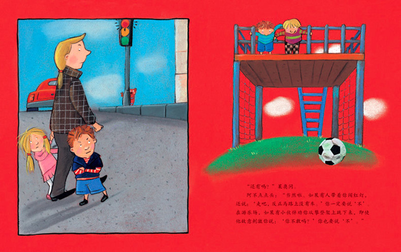 莱奥在纸上画了一只叫“阿不”的小熊,他是来教莱奥学会正确说“不”的。比如为了安全说“不”:不要吃陌生人给的东西;红灯亮的时候拒绝过马路。为了保障自己的权益说“不”:不纵容插队的现象。为了遵从自己的意愿说“不”:不喜欢妈妈的朋友抱抱和亲亲时要说“不”。有些“不”是不受欢迎的,比如:睡觉前不刷牙、挑食。所以说“不”一定要在真正需要的时候。