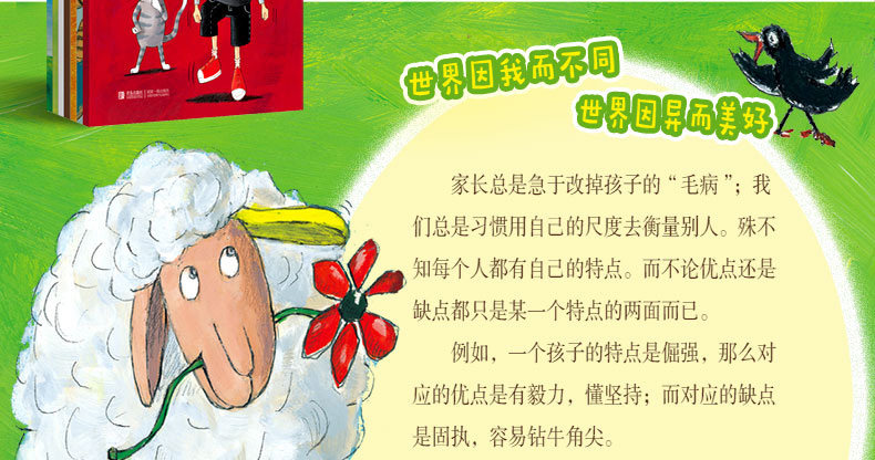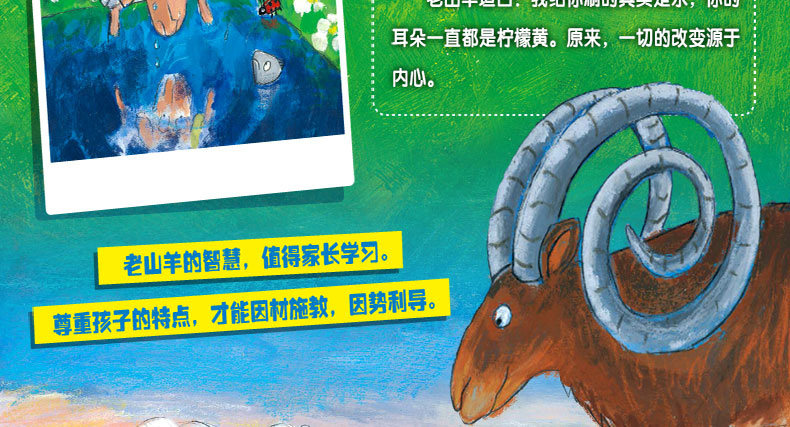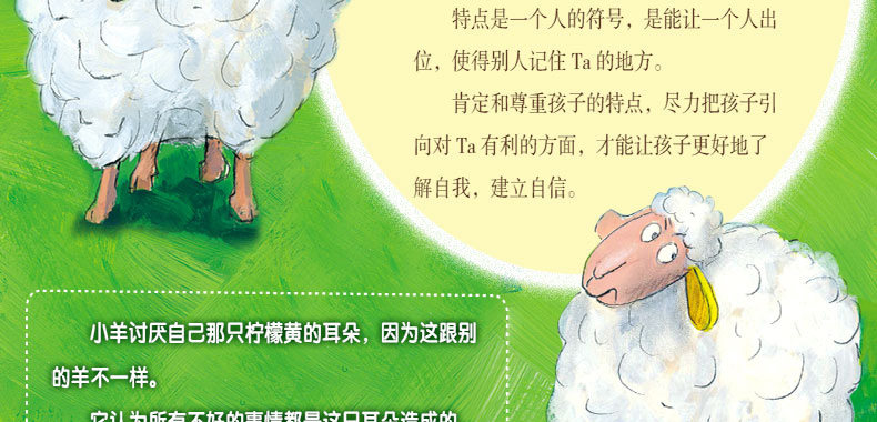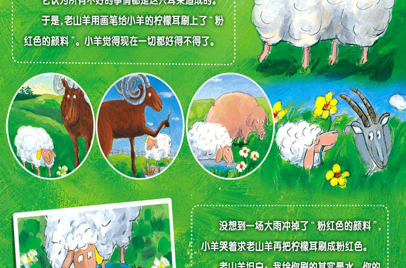 小羊的一只耳朵是柠檬色的,它讨厌这只跟别的羊不一样的耳朵,并且认为发生在自己身上所有不好的事情都是这只耳朵造成的。于是,老山羊用画笔给小羊的柠檬色耳朵“刷上了粉红色的颜料”。小羊觉得现在一切的美好都是这只粉红色耳朵带来的。一场大雨冲刷掉了“粉红色的颜料”,小羊请求老山羊再给自己的耳朵刷成粉红色,老山羊坦白:我给你刷的是水,你的耳朵一直都是柠檬黄色的。原来,一切的改变源自于内心。