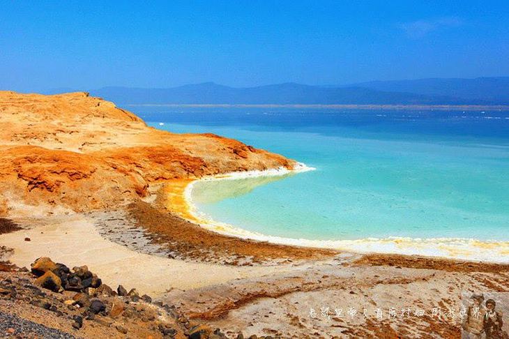 阿莎尔盐湖,左侧是金色的荒漠,右侧是梦幻的盐湖,洁白的盐在两者之间镶出一条玉带。忽然,湖中突兀起一座孤岛,实际是一块巨大的石头!这座金色的石头小岛遗世而独立,因水至清,倒影清晰!