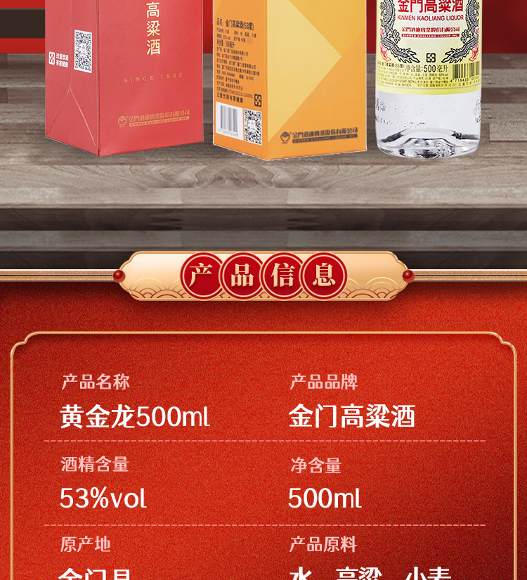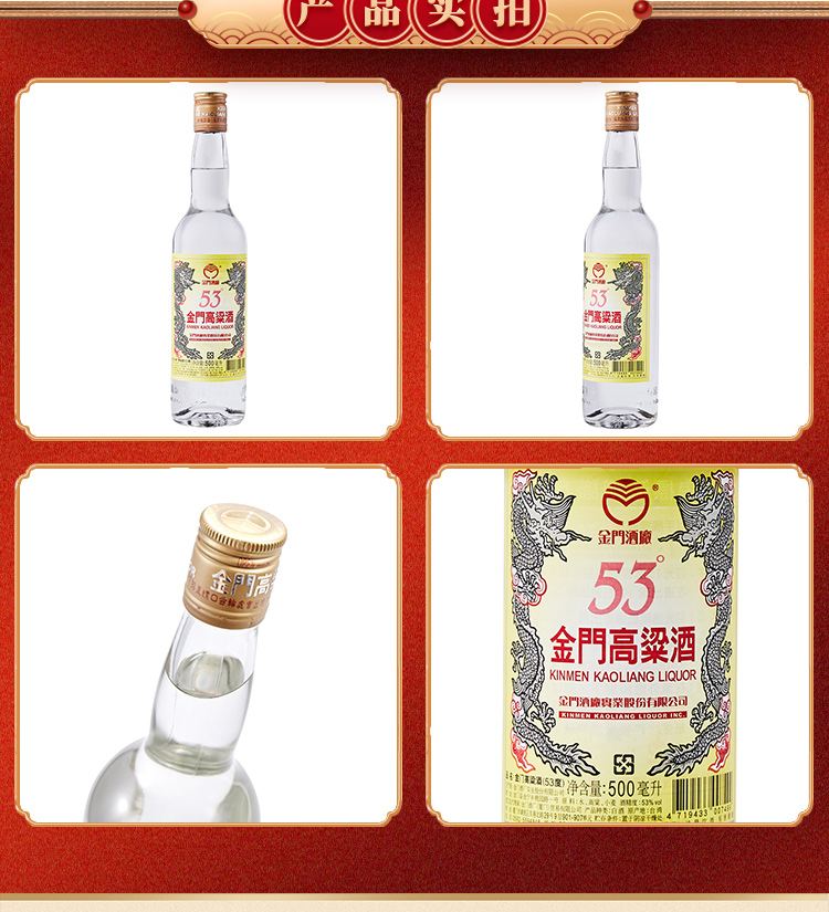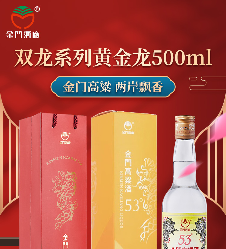 台湾金门高粱酒 双龙系列黄金龙 0.5L-53度 6瓶整箱装