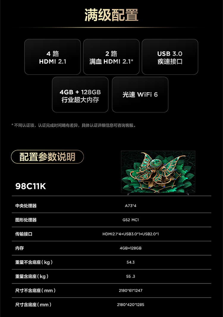 TCL巨幕电视98C11K QD-Mini LED 2048个万象分区 绚彩XDR3000nits Audio by BANG&OLUFSEN 98英寸