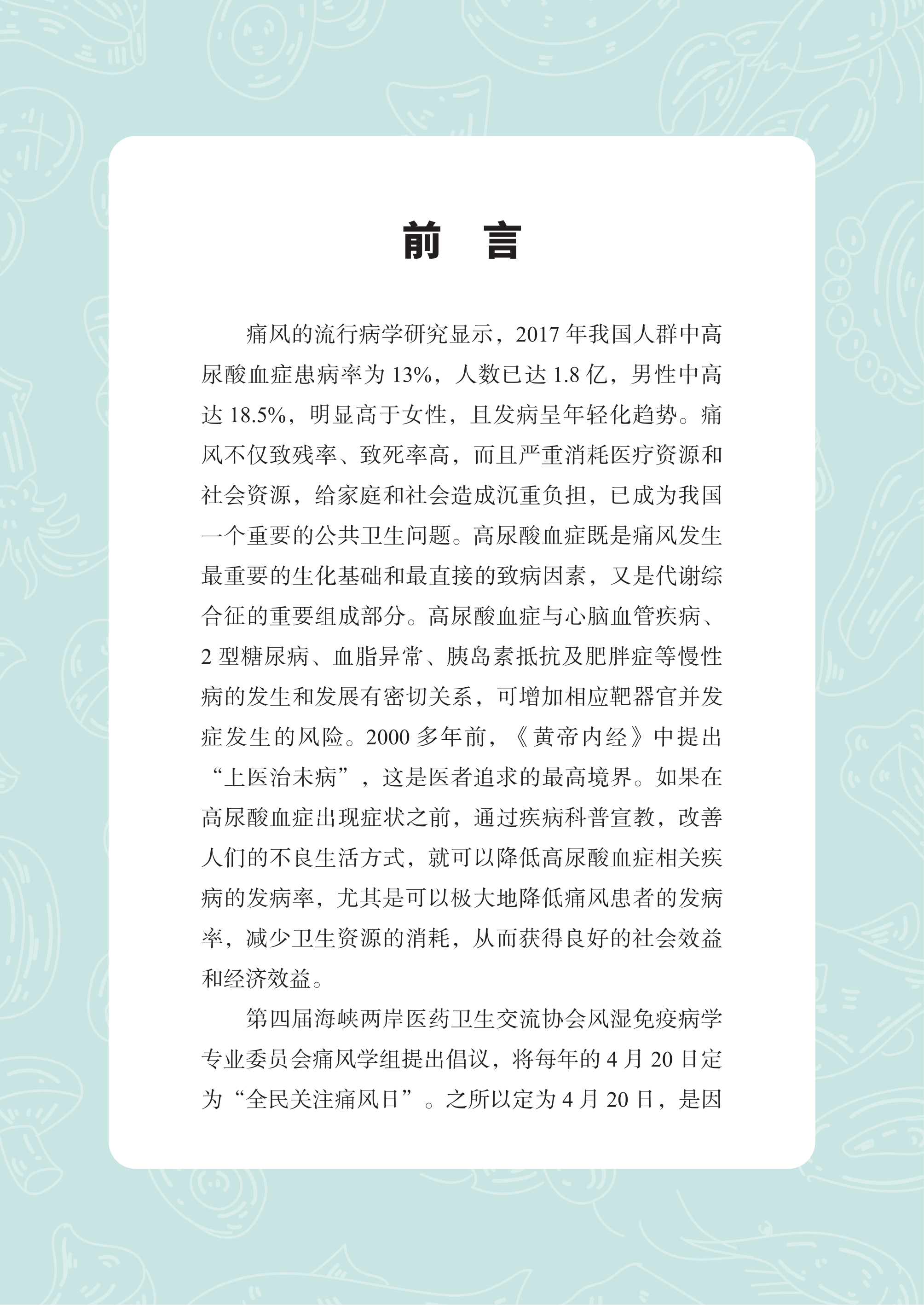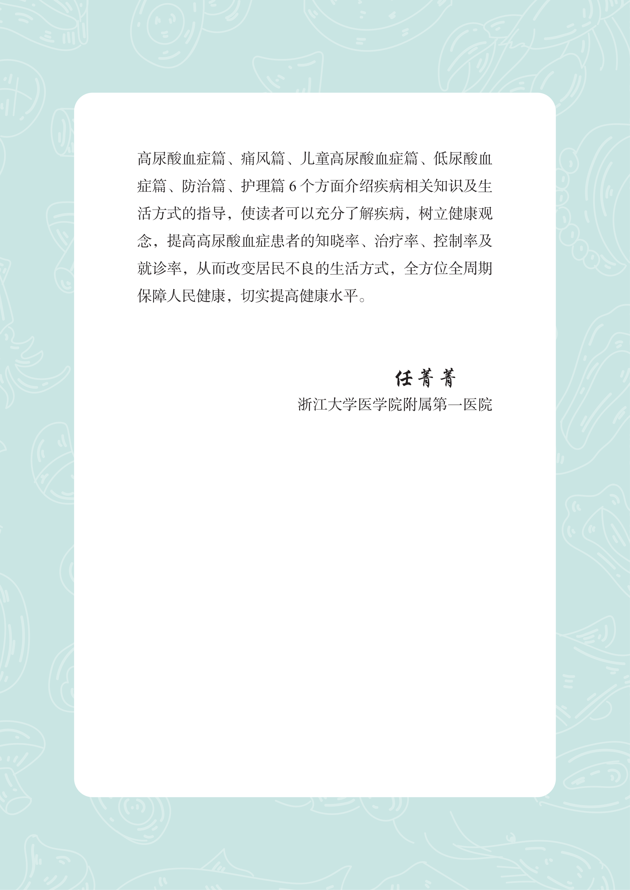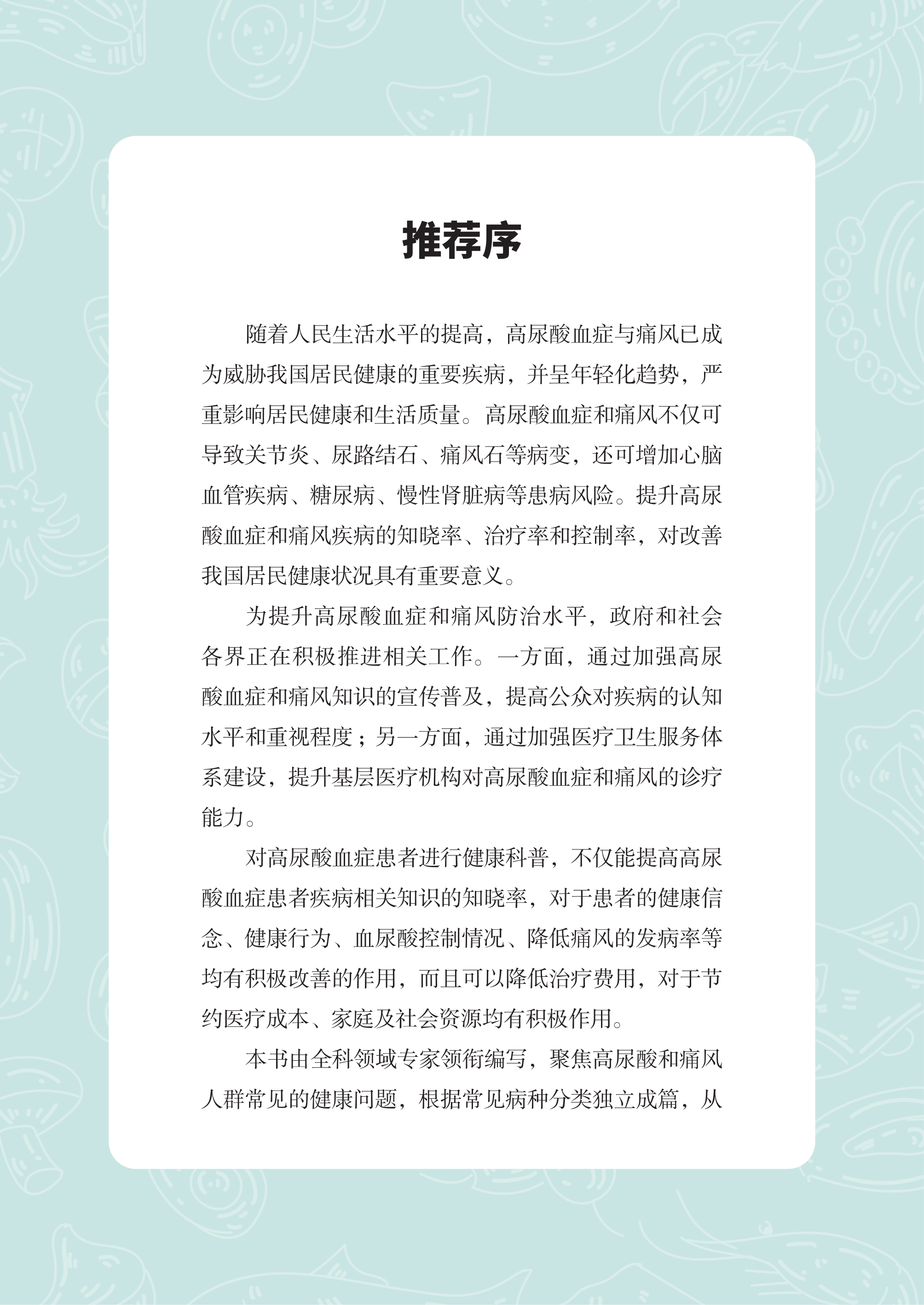 本书由全科领域专家领衔编写,聚焦高尿酸和痛风人群常见的健康问题,根据常见病种分类独立成篇,从高尿酸血症篇、痛风篇、儿童高尿酸血症篇、低尿酸血症篇、防治篇、护理篇 6 个方面介绍疾病相关知识及生活方式的指导,使读者可以充分了解疾病,树立健康观念,提高高尿酸血症患者的知晓率、治疗率、控制率及就诊率,从而改变居民不良的生活方式,全方位全周期保障人民健康,切实提高健康水平。