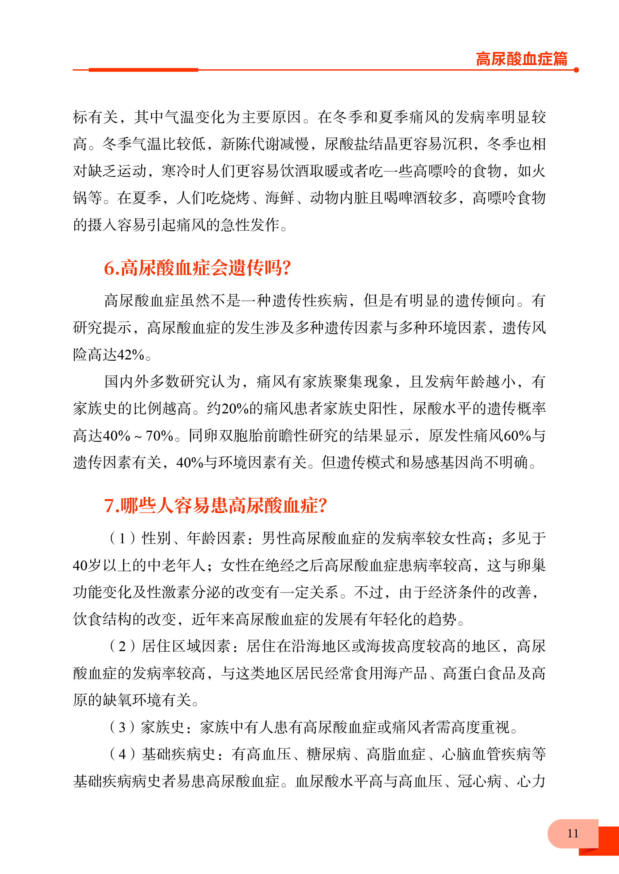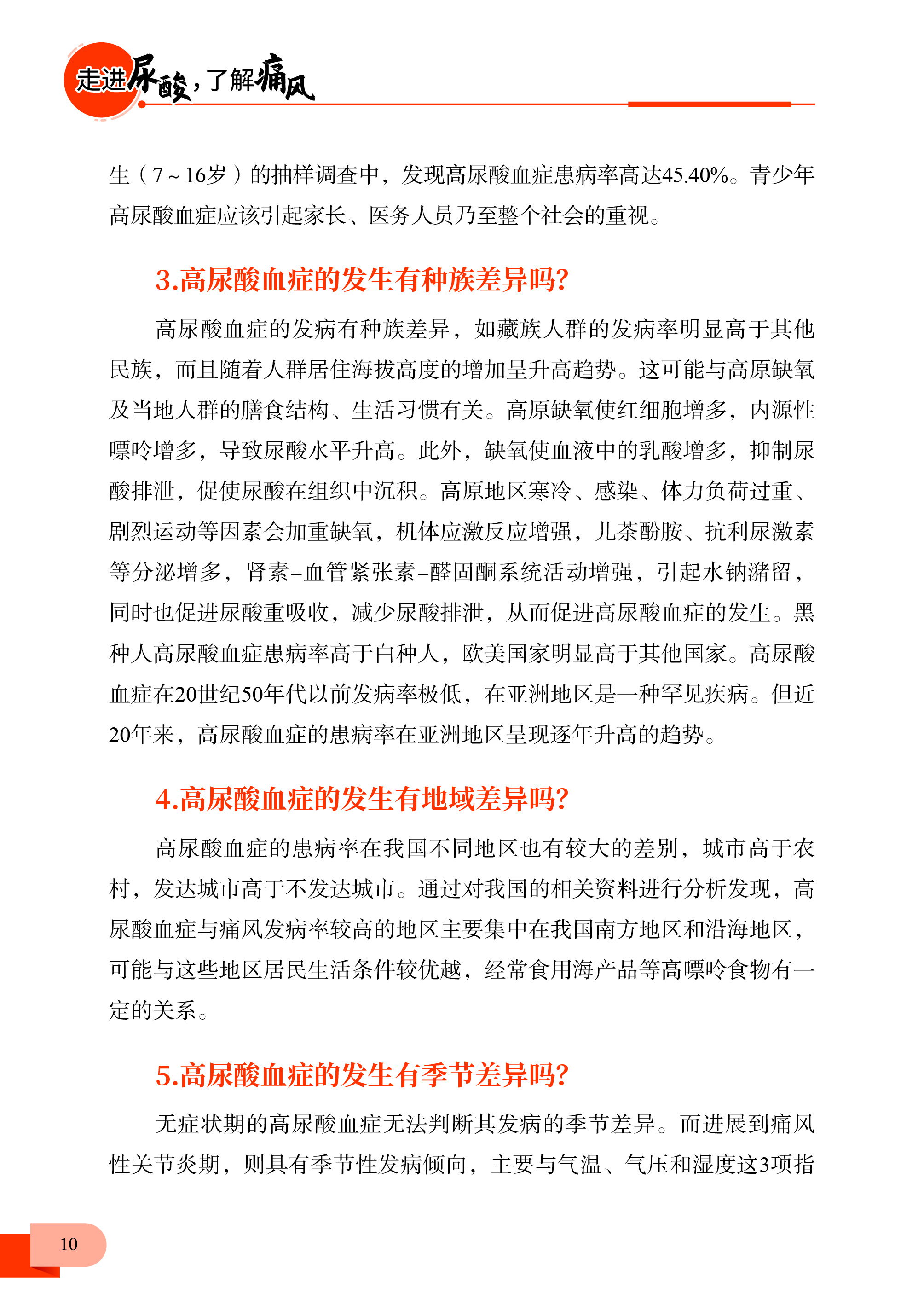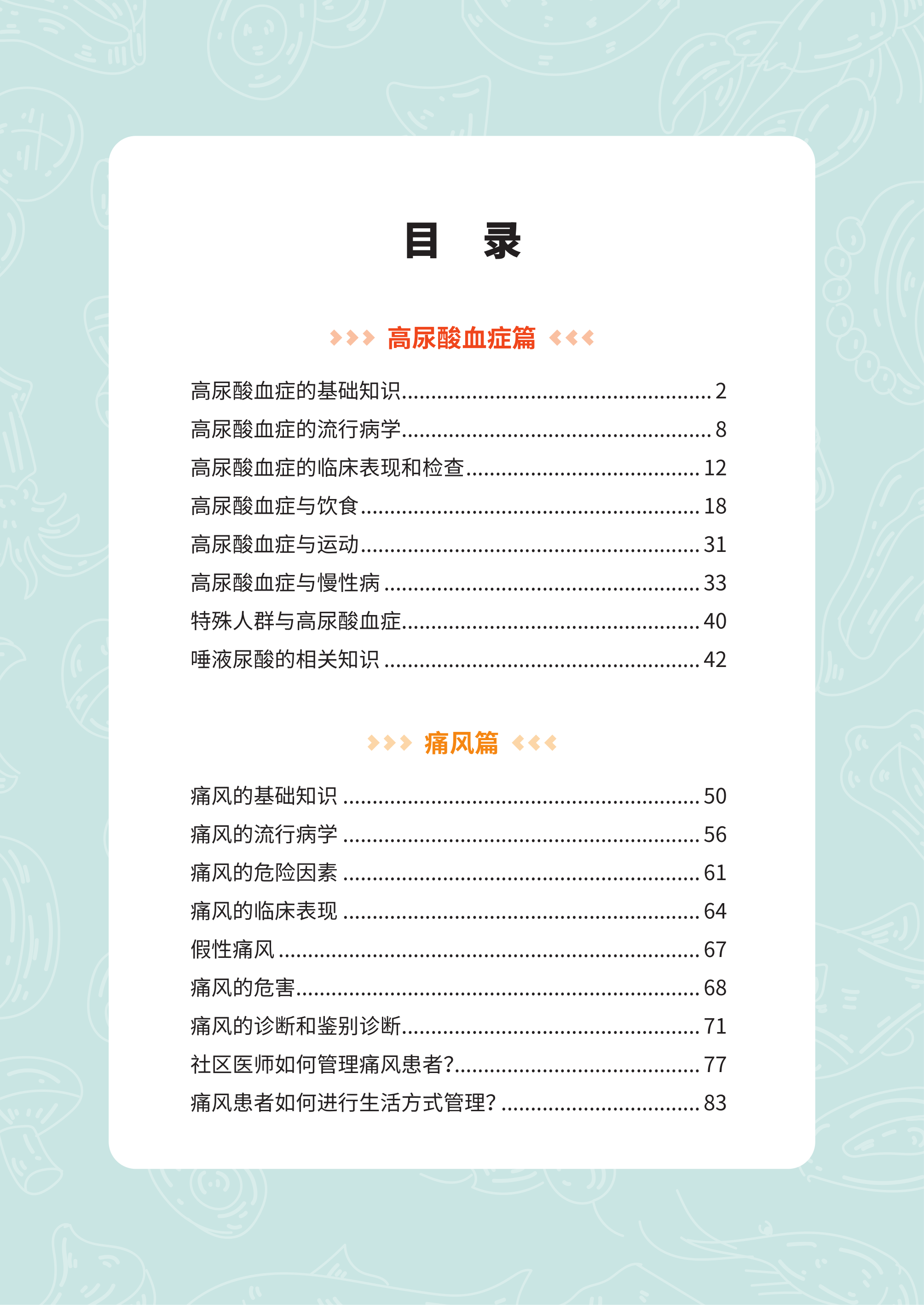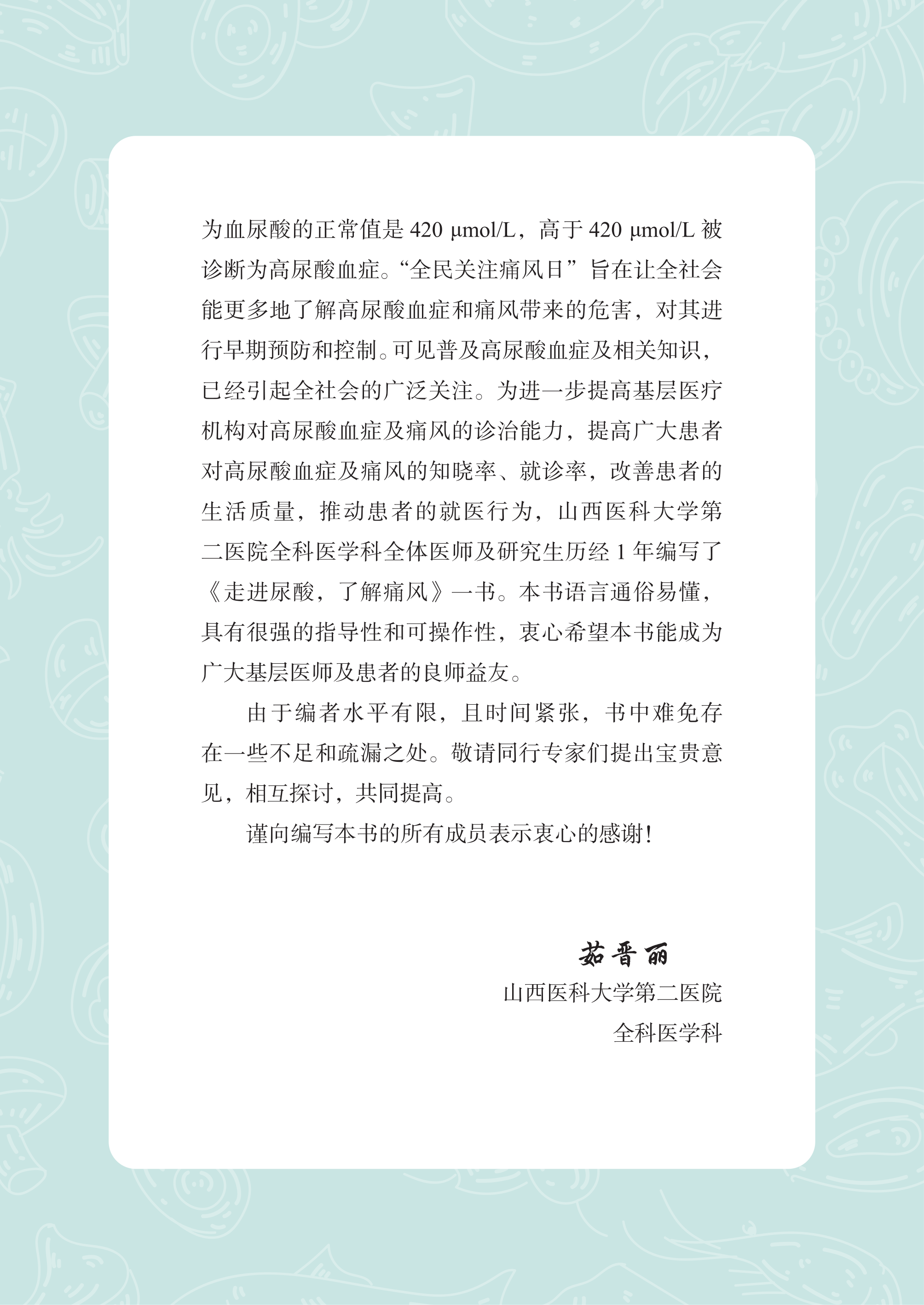 本书由全科领域专家领衔编写,聚焦高尿酸和痛风人群常见的健康问题,根据常见病种分类独立成篇,从高尿酸血症篇、痛风篇、儿童高尿酸血症篇、低尿酸血症篇、防治篇、护理篇 6 个方面介绍疾病相关知识及生活方式的指导,使读者可以充分了解疾病,树立健康观念,提高高尿酸血症患者的知晓率、治疗率、控制率及就诊率,从而改变居民不良的生活方式,全方位全周期保障人民健康,切实提高健康水平。