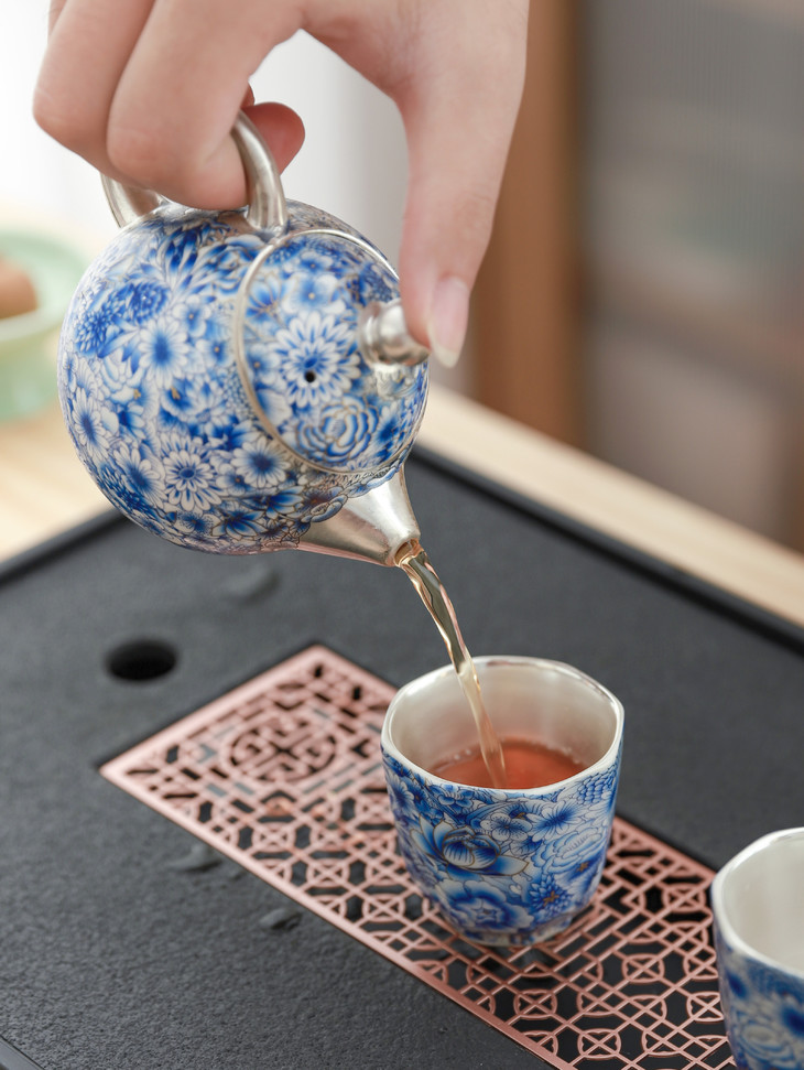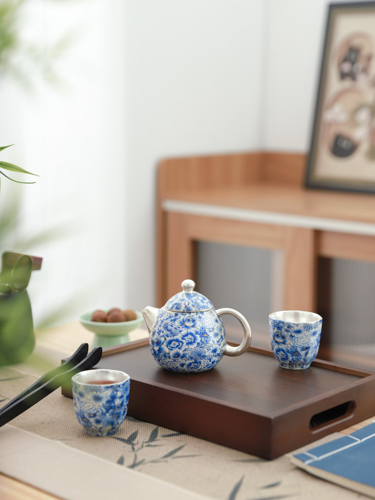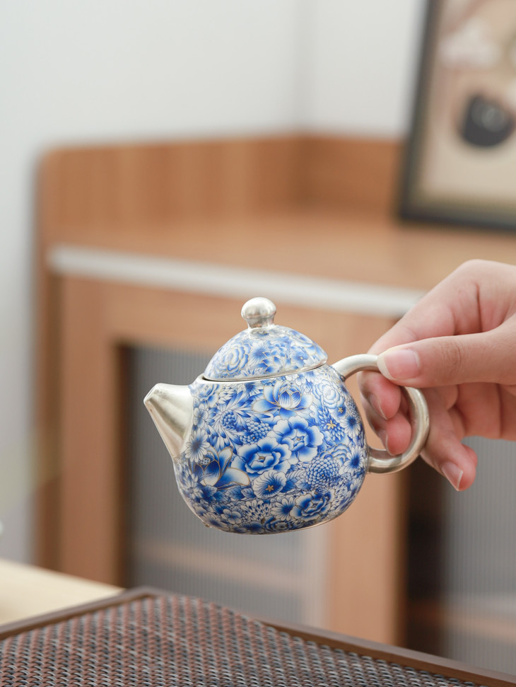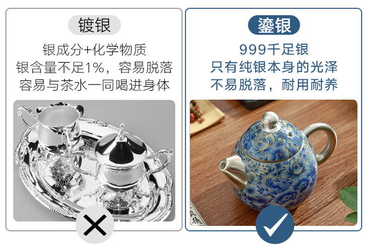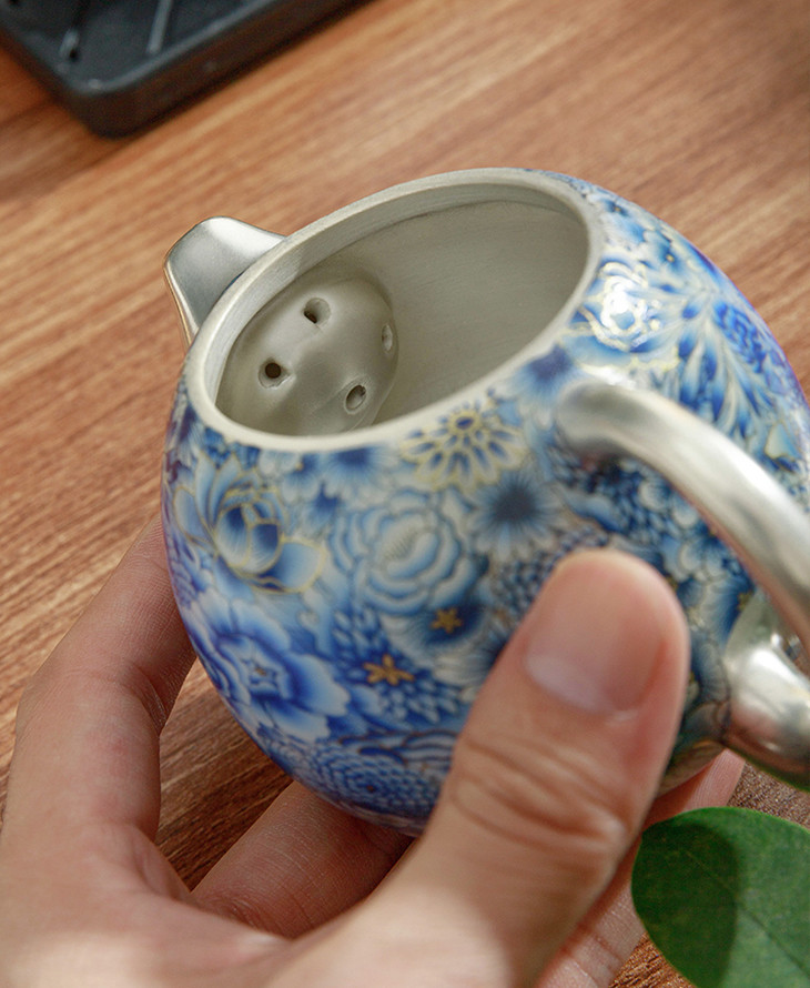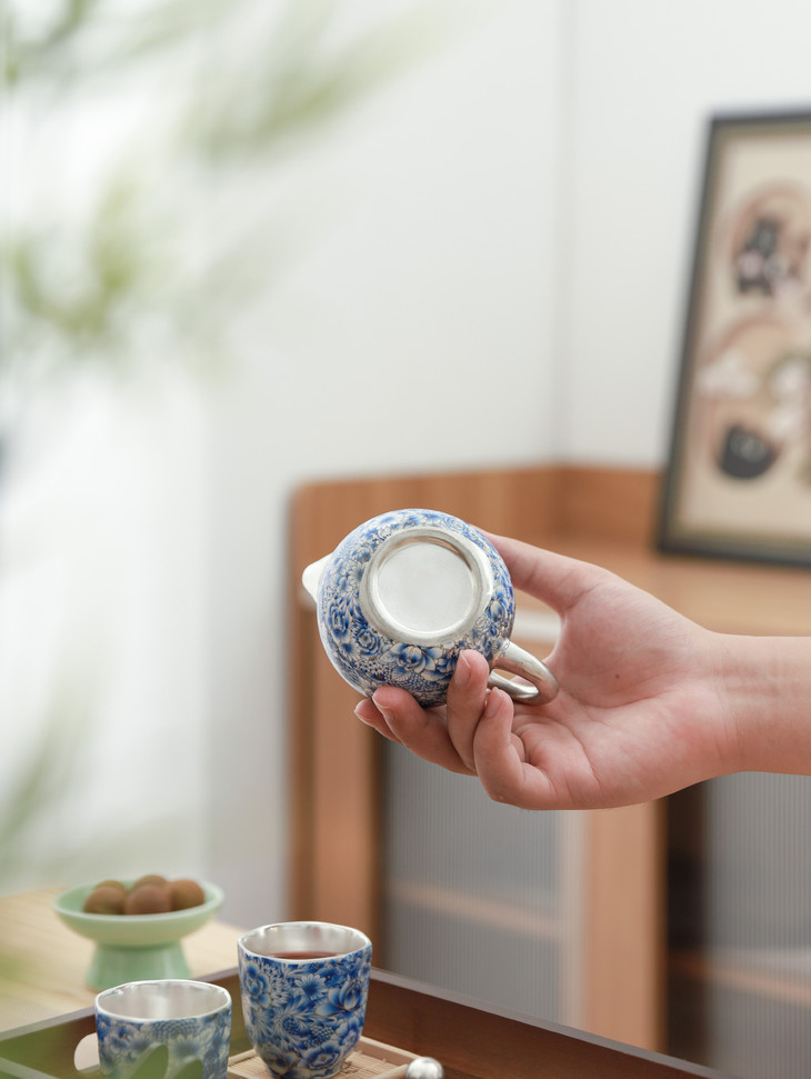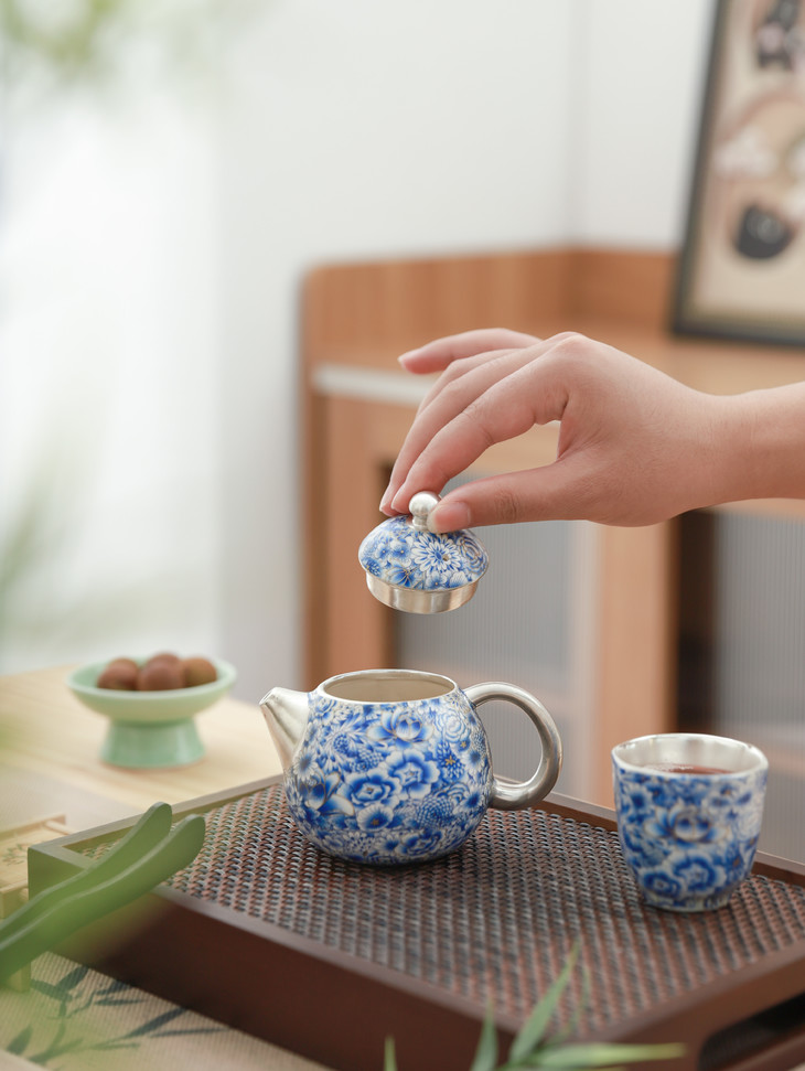 古法鎏银工艺将999千足银覆在德化瓷壶之上,宛若谦谦君子之姿态,至于手中便觉得十分有灵气。