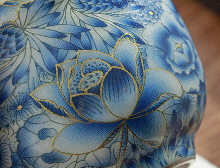 银器完成后,需在陶瓷上做彩,用金线勾勒图案,后在图案内做色彩填充,一步一步,一笔一笔的,形成满彩,特别考验老师傅的画工,耗费时间精力。待图案色彩干后,就要进行最后的一次入窑烤制。