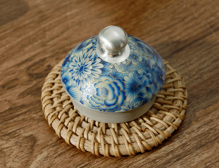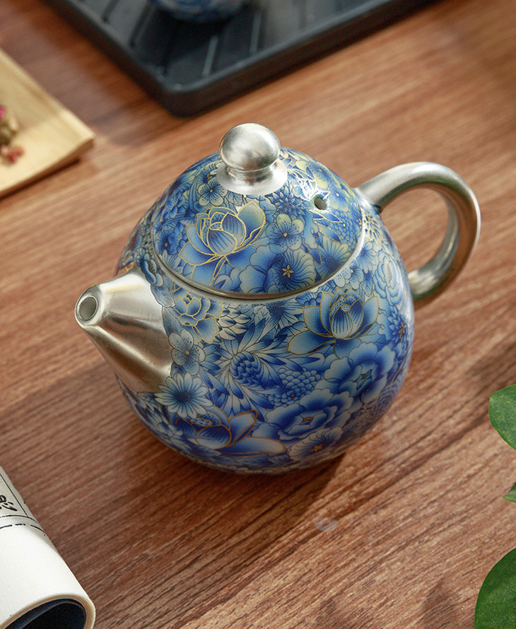 看一眼便惊艳到了我,瓷胎画珐琅满花鎏银壶以纯手工精工打造,壶身采用“非遗”宫廷绝技,绽放的繁花缠枝纹画满壶身,錾花,色调清丽而雅致,团花锦簇,寓意祥瑞!