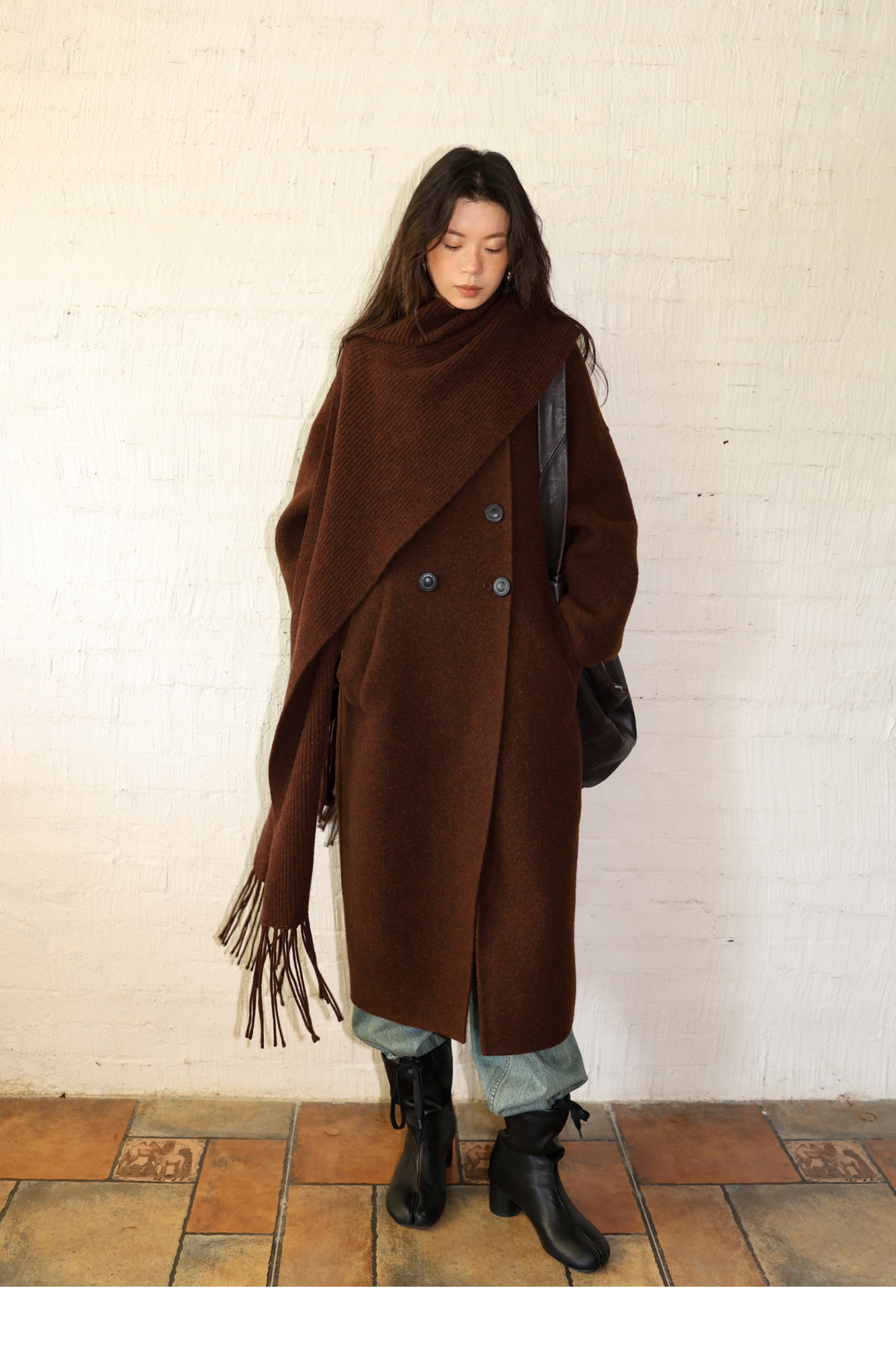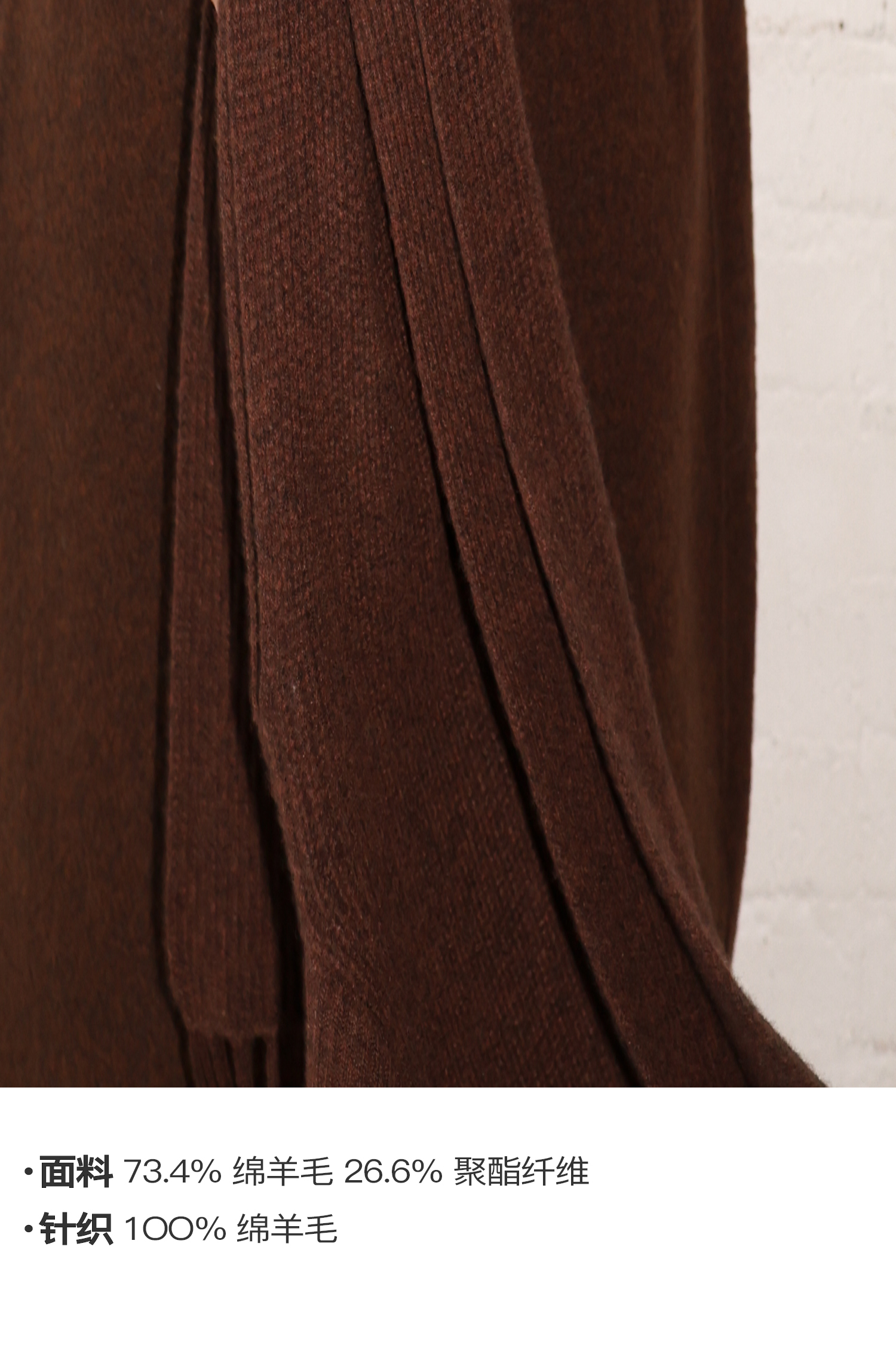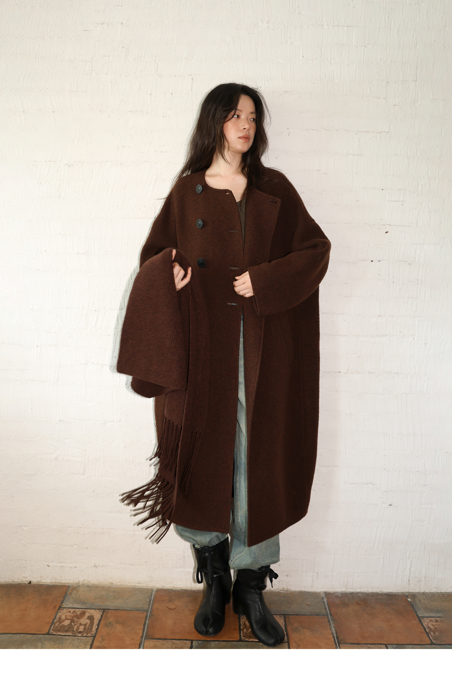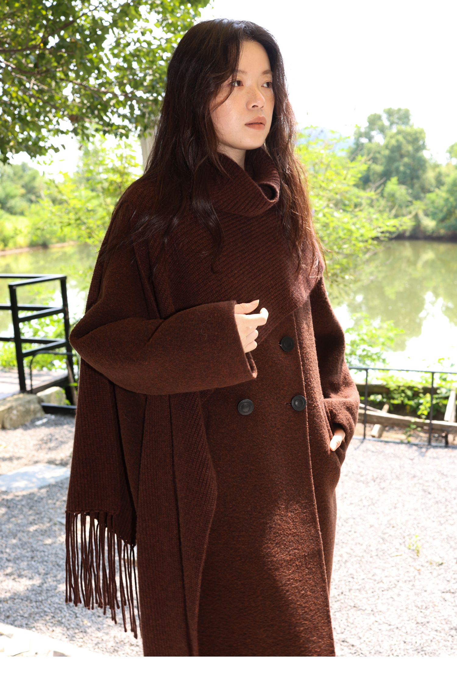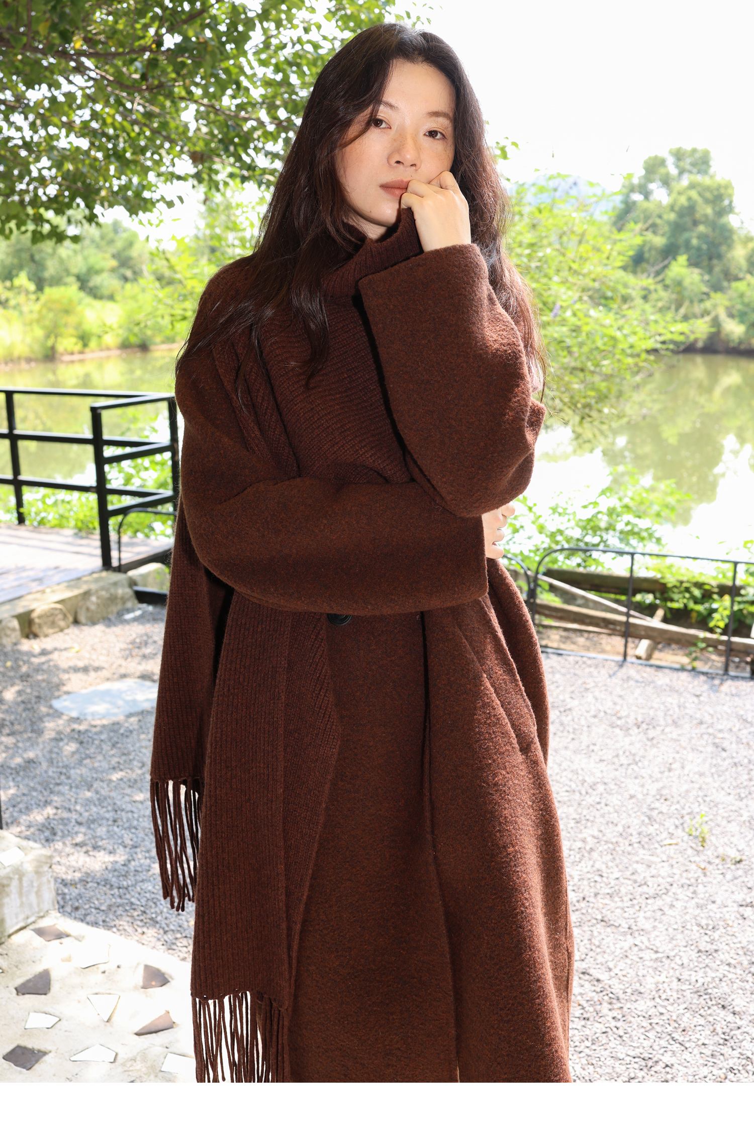 素舶 绵羊毛圆领茧型流苏针织围巾长款双面呢大衣